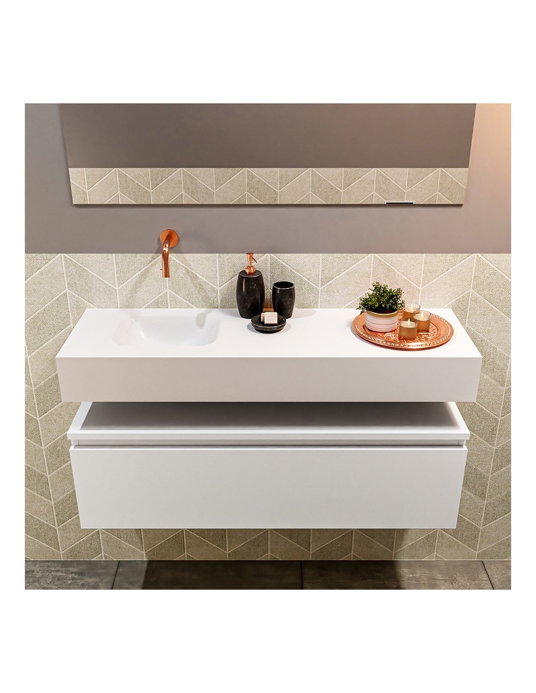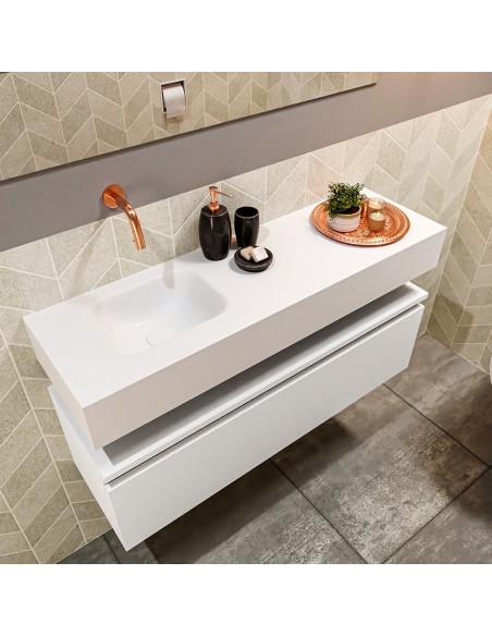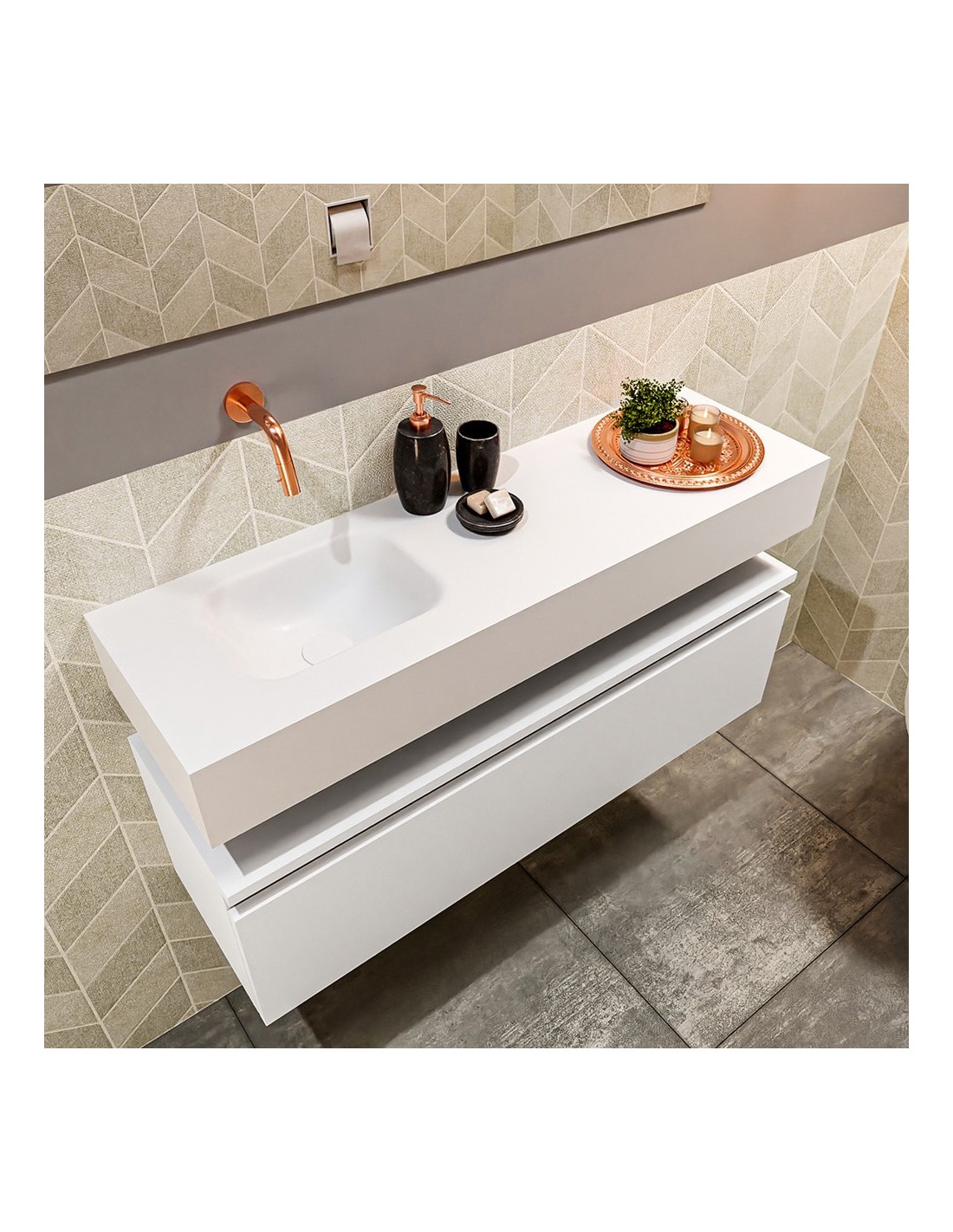 ANDOR Komplet badmiljø med venstrevendt håndvask til vægmonteret armatur. Badmiljøet kommer med 1 skuffe med fuldt udtræk, og er fremstillet i MDF. Håndvasken er fremstillet i talkumsfarvet (mat hvid) solid surface. Badmiljøet måler 100 cm i bredden. Det viste armatur medfølger ikke i sættet.