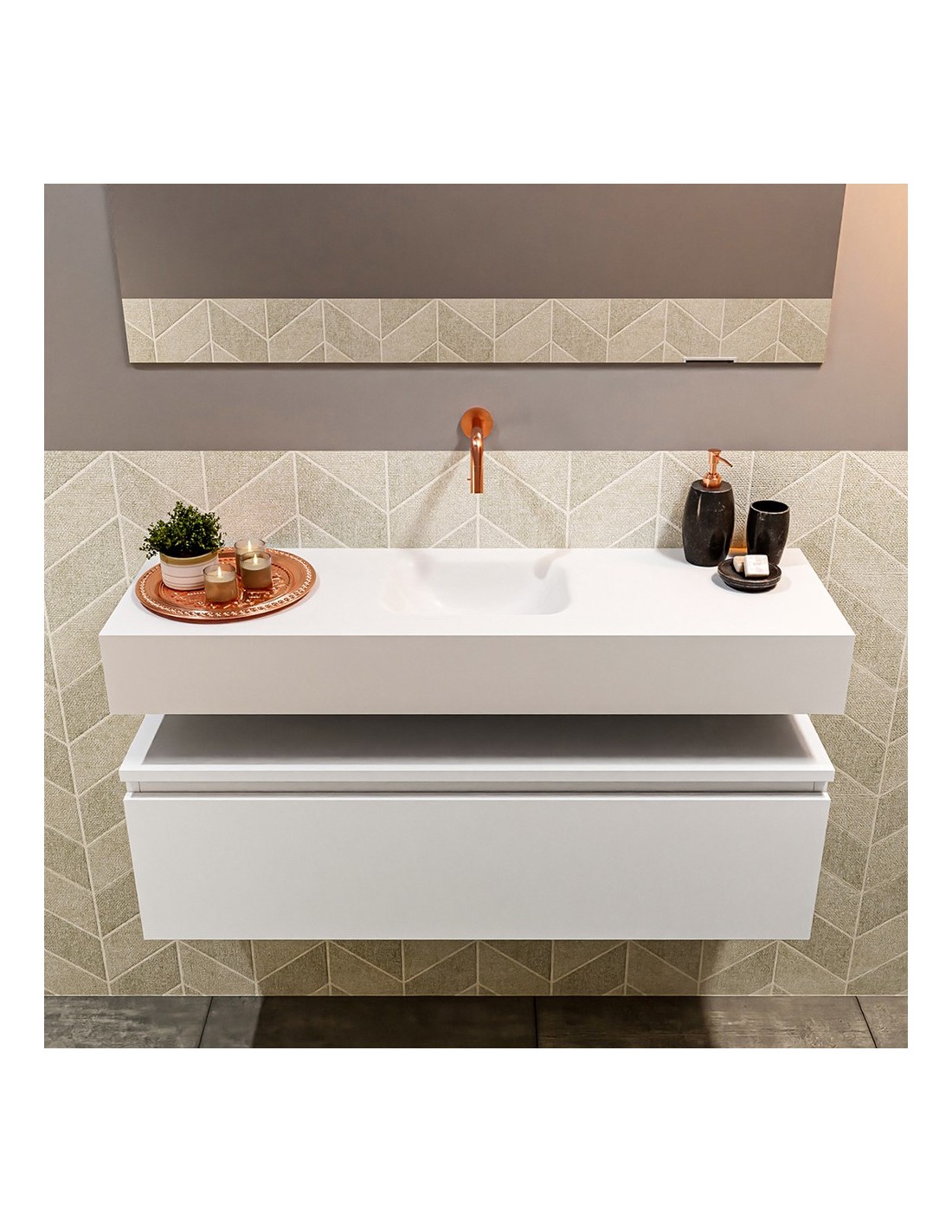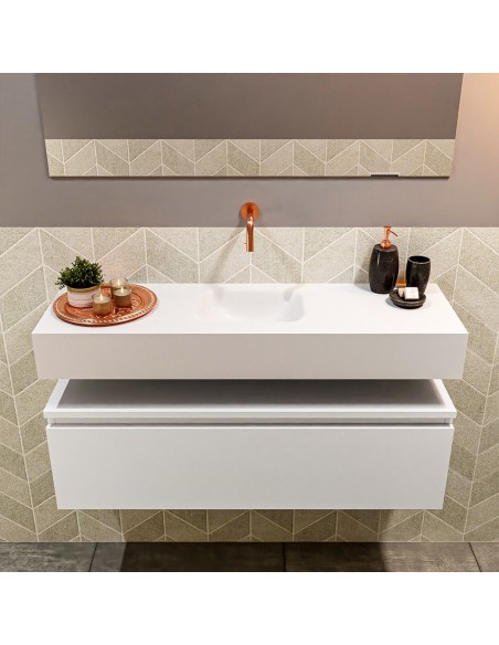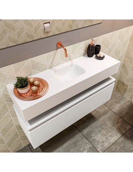 ANDOR Komplet badmiljø med midt centreret håndvask til vægmonteret armatur. Badmiljøet kommer med 1 skuffe med fuldt udtræk, og er fremstillet i MDF. Håndvasken er fremstillet i talkumsfarvet (mat hvid) solid surface. Badmiljøet måler 100 cm i bredden. Det viste armatur medfølger ikke i sættet.