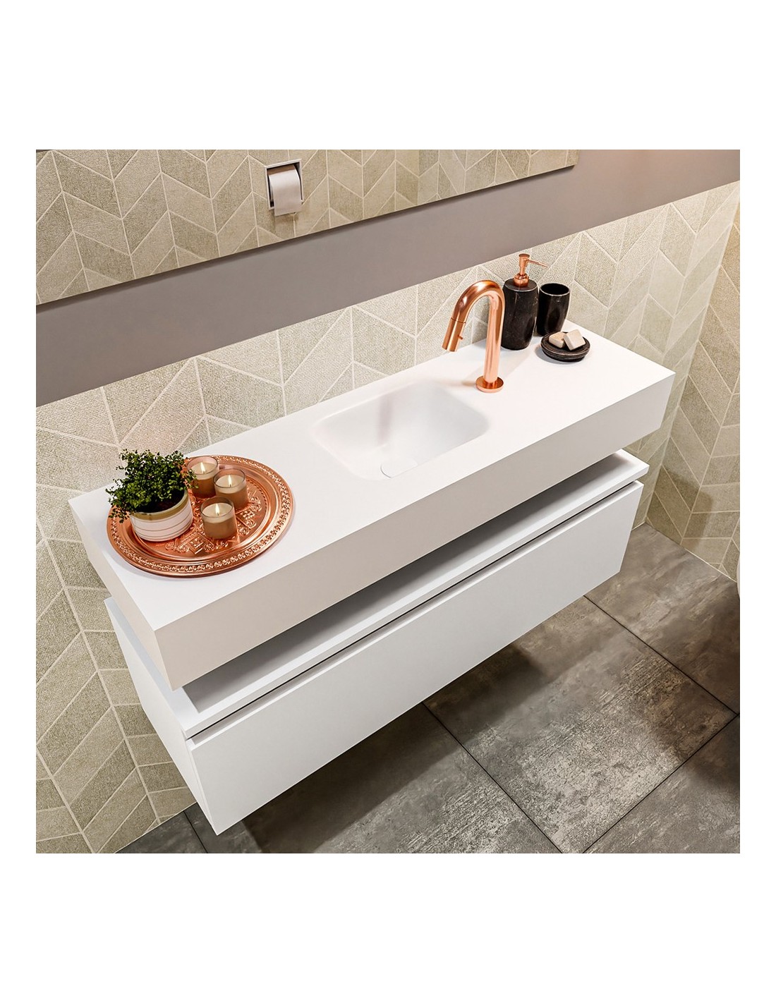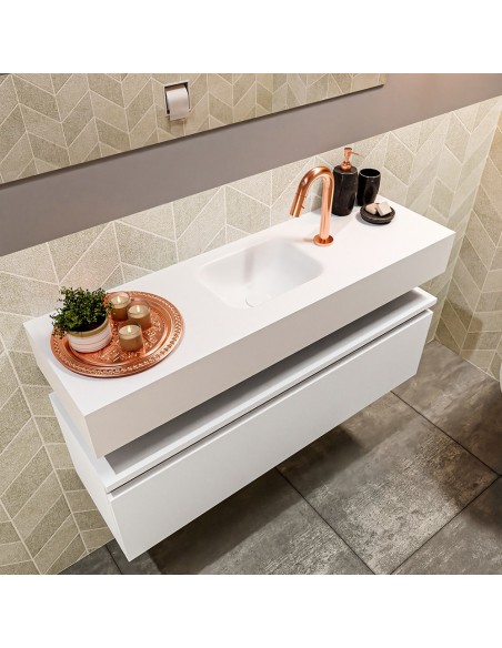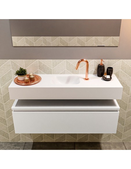 ANDOR Komplet badmiljø med midt centreret håndvask til bordmonteret armatur. Badmiljøet kommer med 1 skuffe med fuldt udtræk, og er fremstillet i MDF. Håndvasken er fremstillet i talkumsfarvet (mat hvid) solid surface. Badmiljøet måler 100 cm i bredden. Det viste armatur medfølger ikke i sættet.