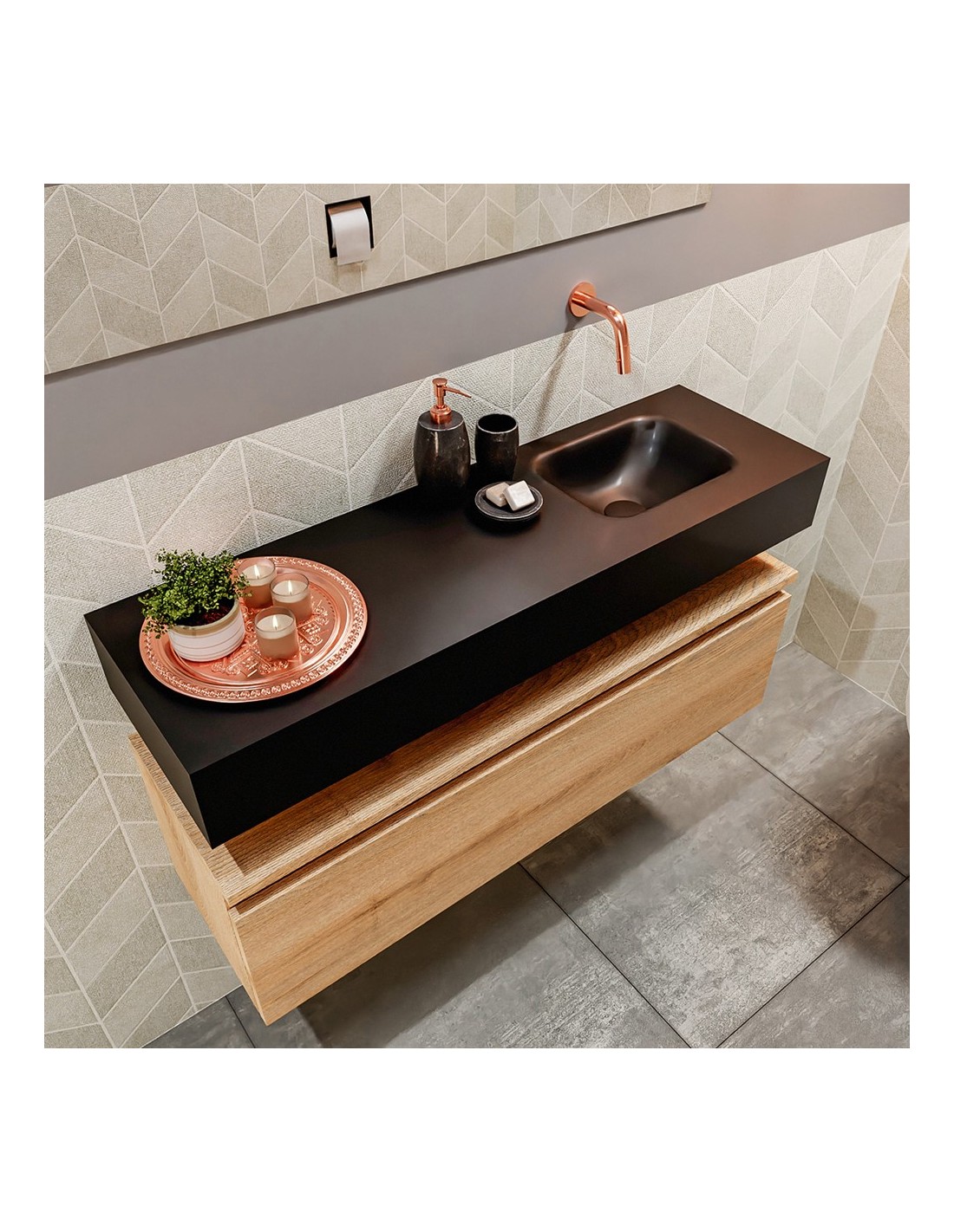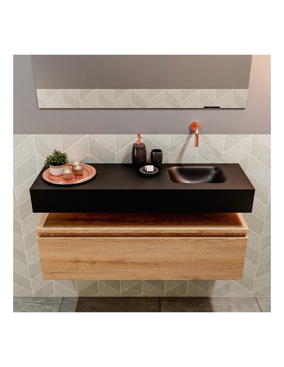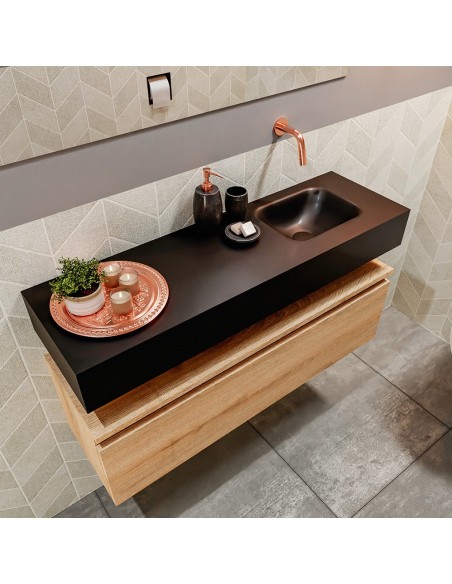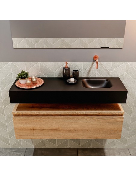ANDOR Komplet badmiljø med højrevendt håndvask til vægmonteret armatur. Badmiljøet kommer med 1 skuffe med fuldt udtræk, og er fremstillet i MDF med design af vasket eg. Håndvasken er fremstillet i sort solid surface. Badmiljøet måler 100 cm i bredden. Det viste armatur medfølger ikke i sættet.