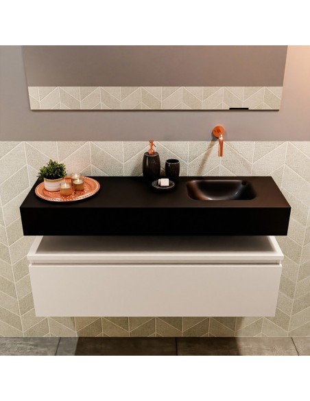 ANDOR Komplet badmiljø med højrevendt håndvask til vægmonteret armatur. Badmiljøet kommer med 1 skuffe med fuldt udtræk, og er fremstillet i MDF. Håndvasken er fremstillet i sort solid surface. Badmiljøet måler 100 cm i bredden. Det viste armatur medfølger ikke i sættet.