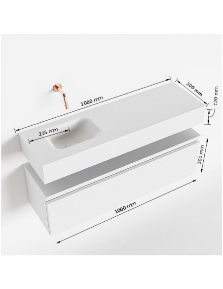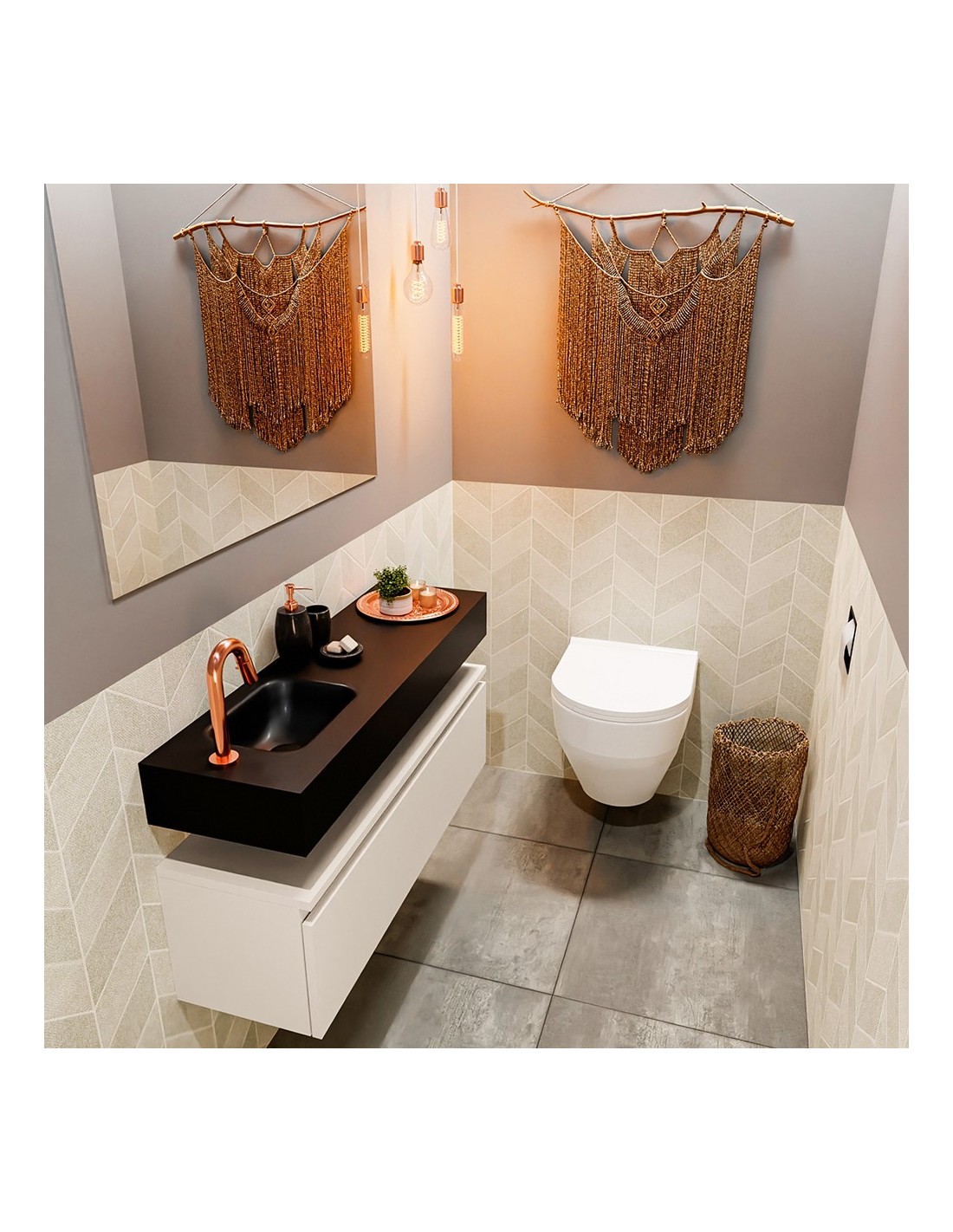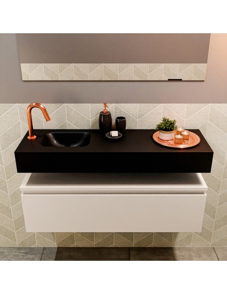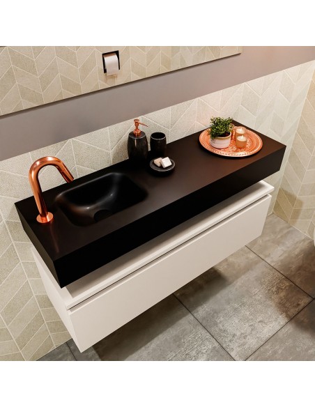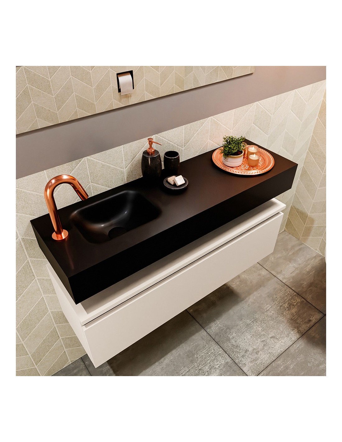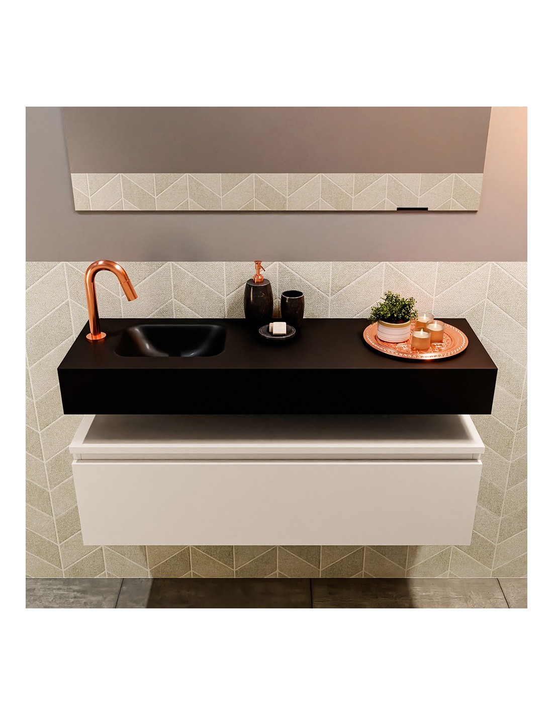 ANDOR Komplet badmiljø med venstrevendt håndvask til bordmonteret armatur. Badmiljøet kommer med 1 skuffe med fuldt udtræk, og er fremstillet i MDF. Håndvasken er fremstillet i sort solid surface. Badmiljøet måler 100 cm i bredden. Det viste armatur medfølger ikke i sættet.