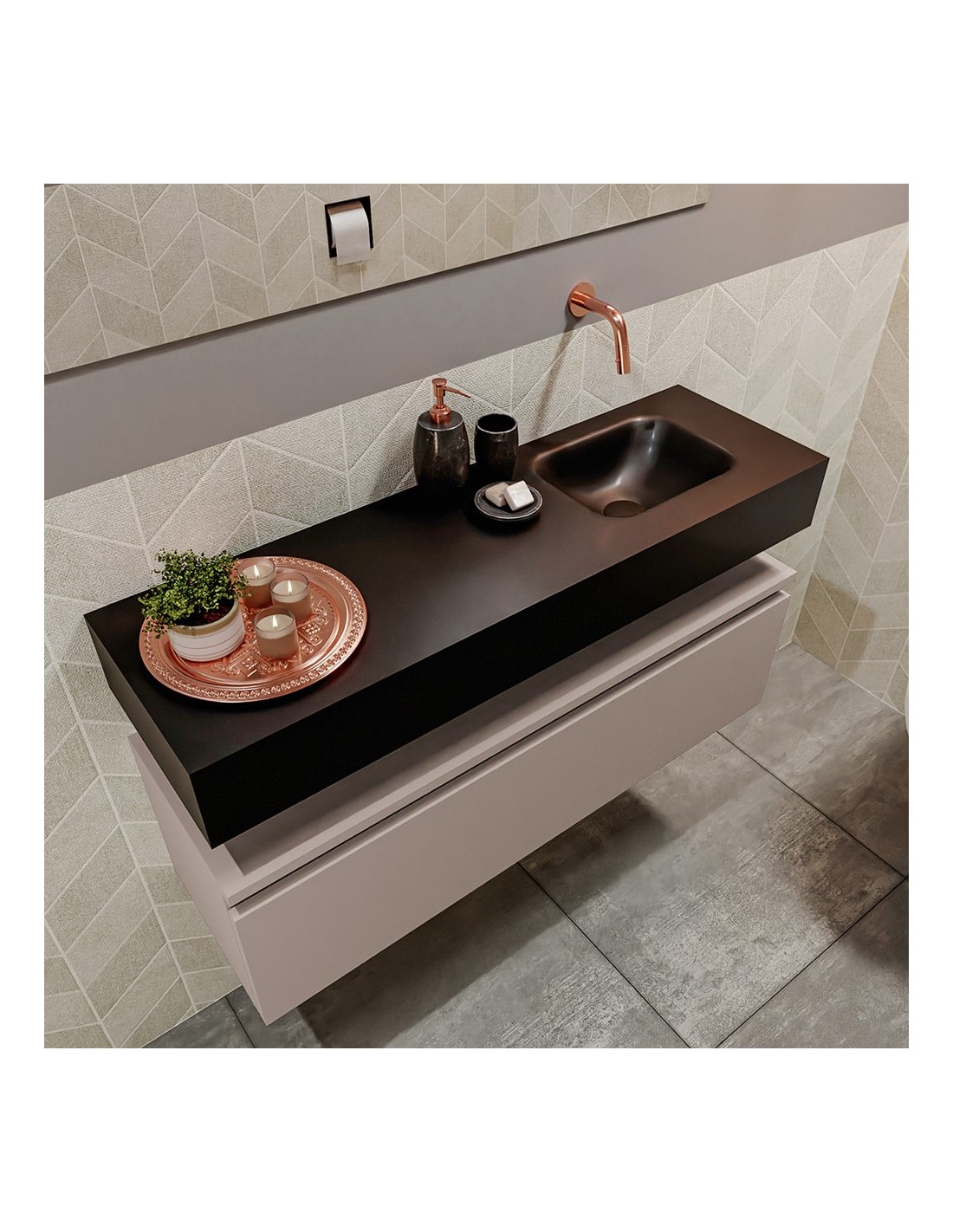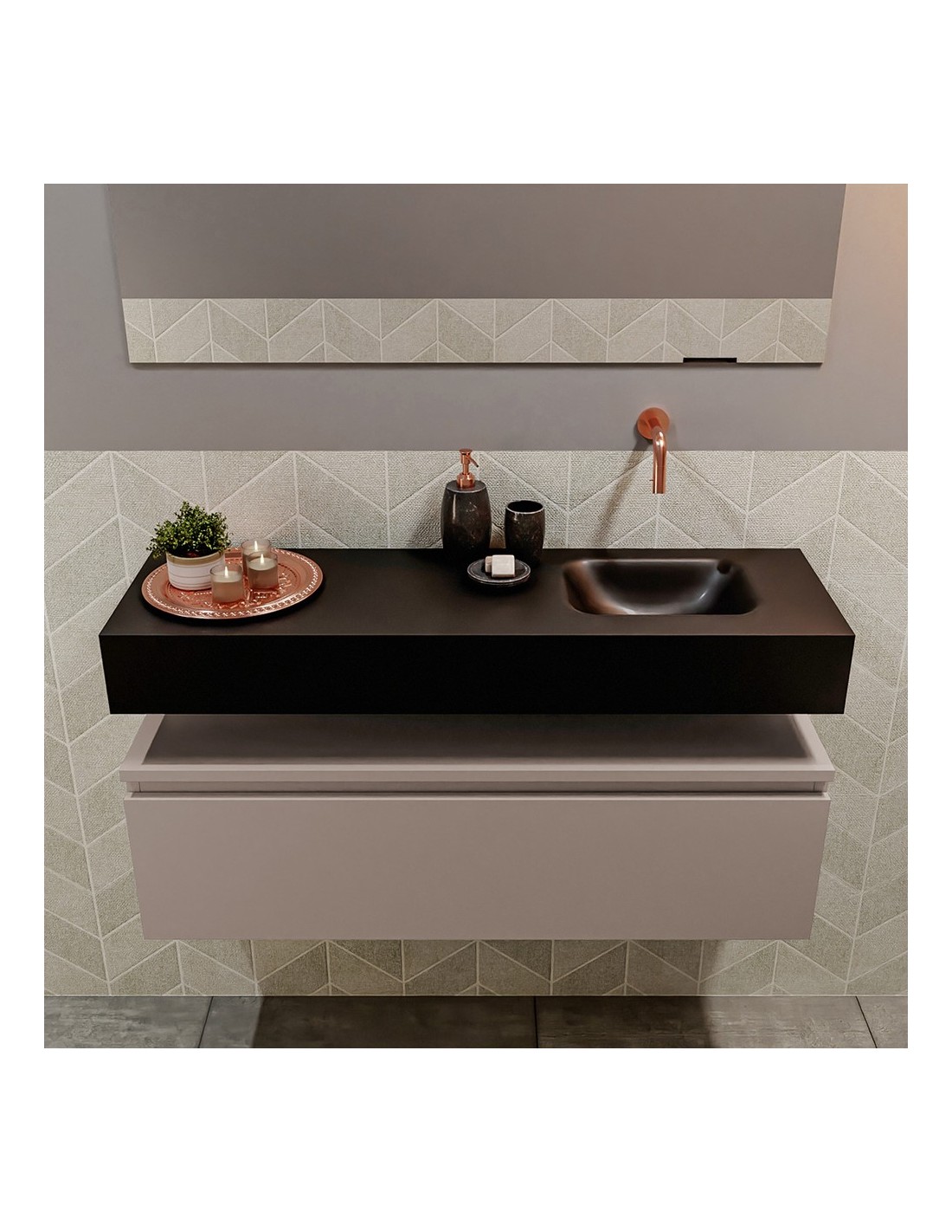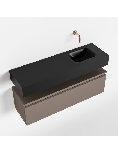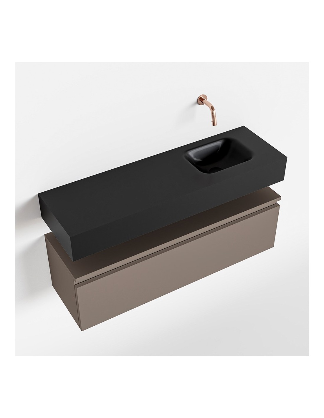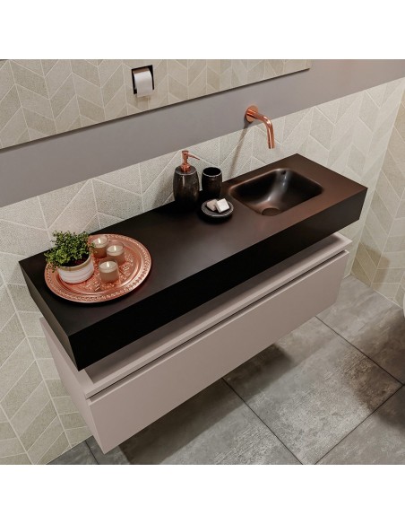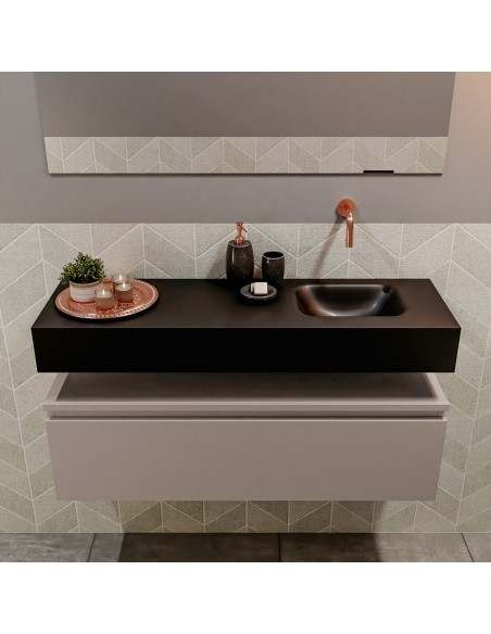 ANDOR Komplet badmiljø med højrevendt håndvask til vægmonteret armatur. Badmiljøet kommer med 1 skuffe med fuldt udtræk, og er fremstillet i MDF. Håndvasken er fremstillet i sort solid surface. Badmiljøet måler 100 cm i bredden. Det viste armatur medfølger ikke i sættet.
