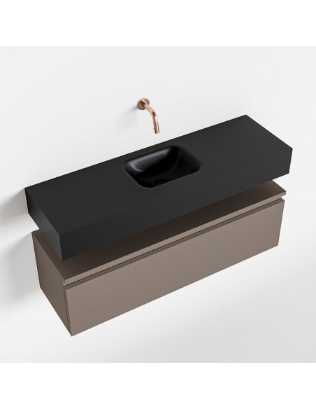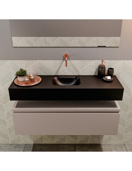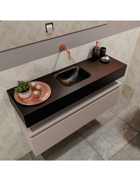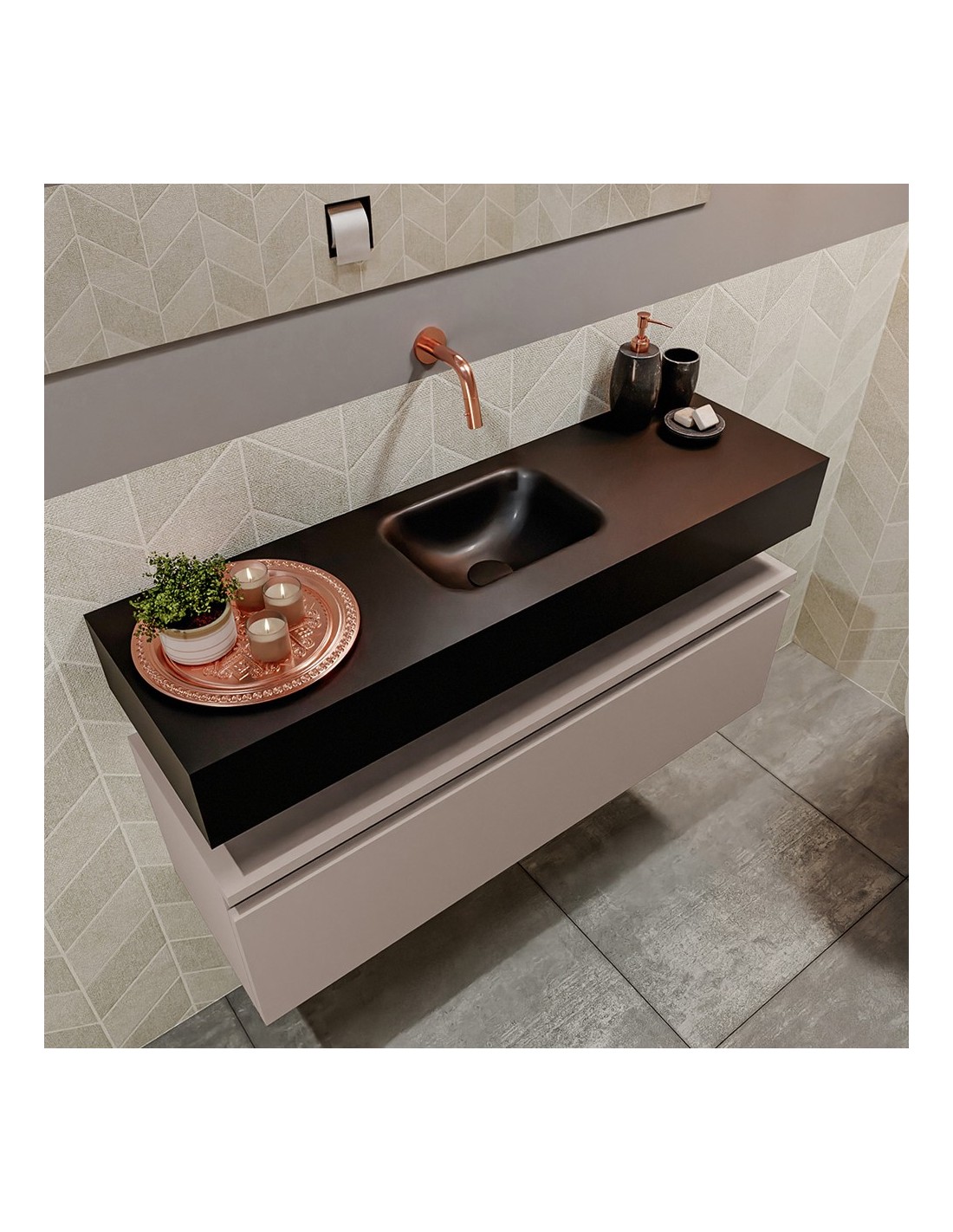 ANDOR Komplet badmiljø med midt centreret håndvask til vægmonteret armatur. Badmiljøet kommer med 1 skuffe med fuldt udtræk, og er fremstillet i MDF. Håndvasken er fremstillet i sort solid surface. Badmiljøet måler 100 cm i bredden. Det viste armatur medfølger ikke i sættet.