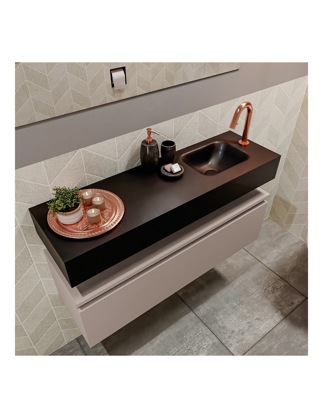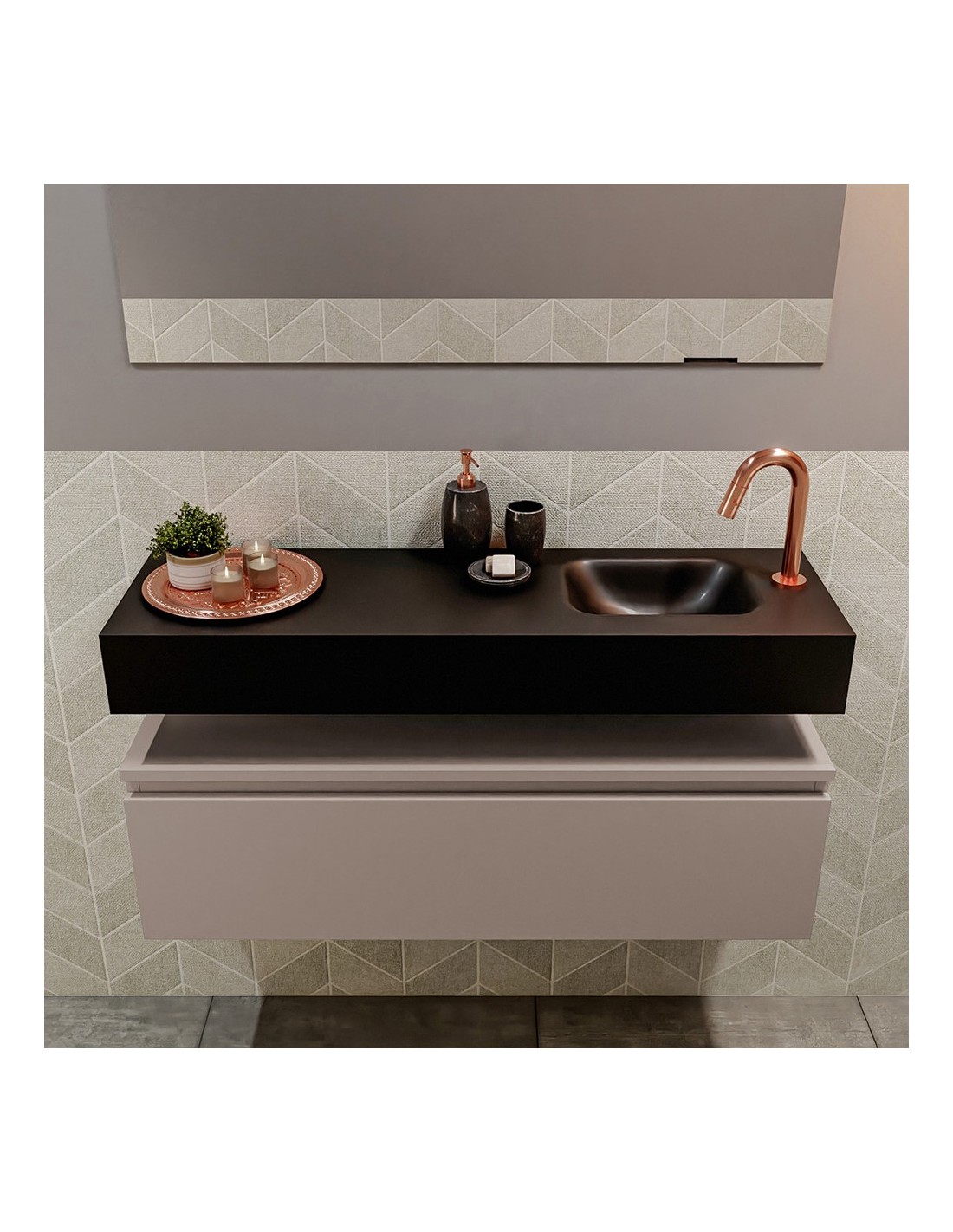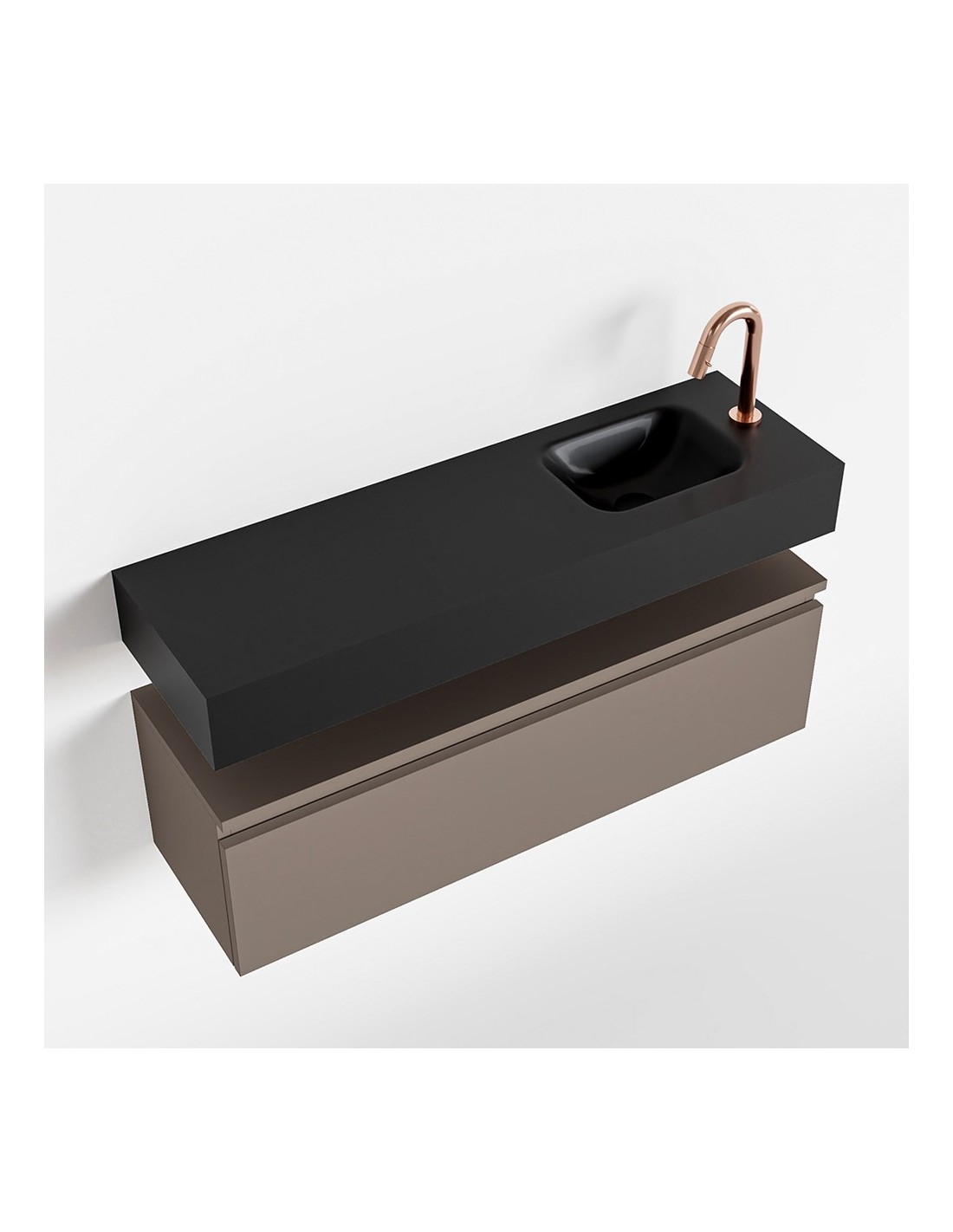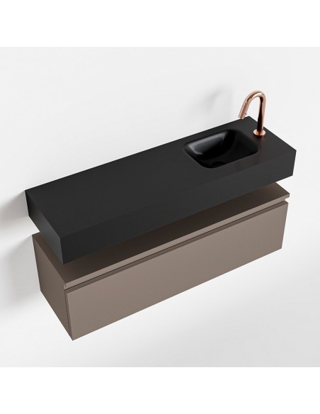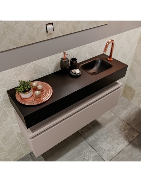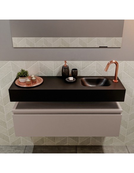 ANDOR Komplet badmiljø med højrevendt håndvask til bordmonteret armatur. Badmiljøet kommer med 1 skuffe med fuldt udtræk, og er fremstillet i MDF. Håndvasken er fremstillet i sort solid surface. Badmiljøet måler 100 cm i bredden. Det viste armatur medfølger ikke i sættet.