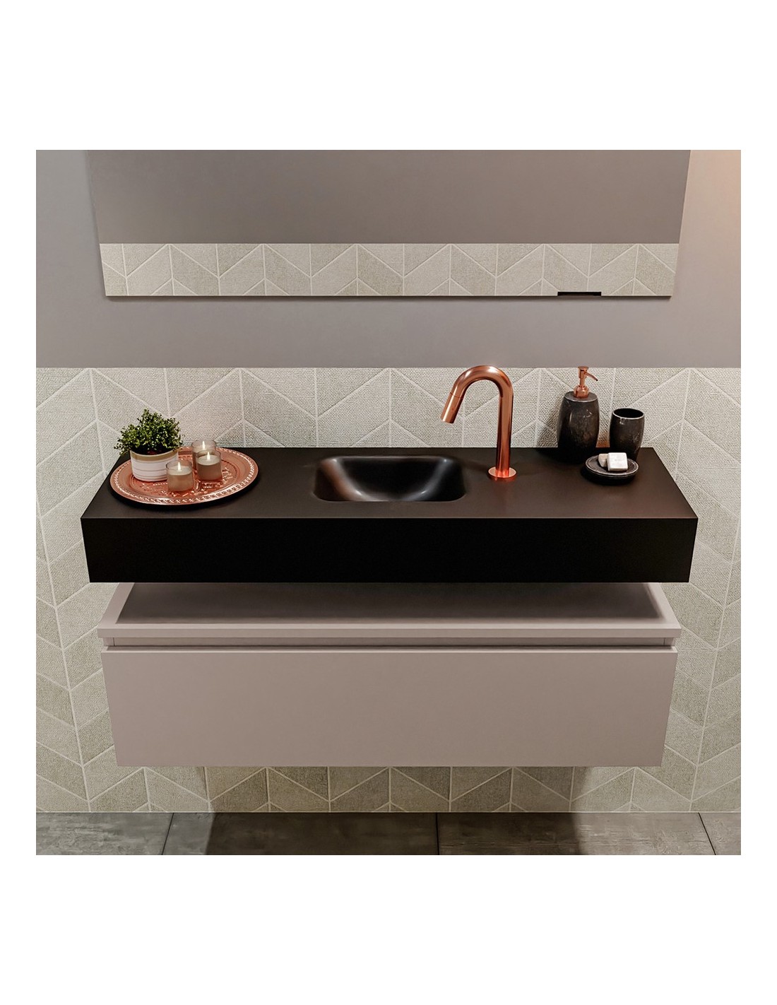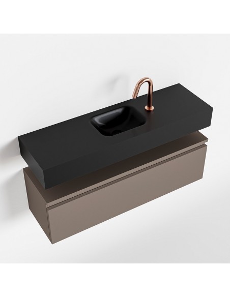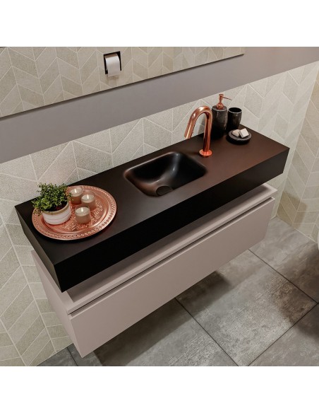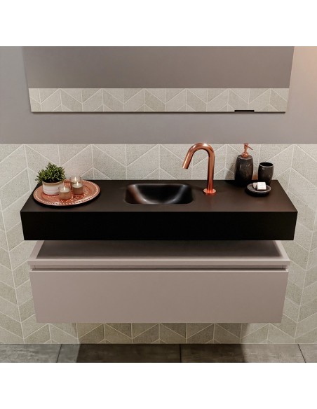 ANDOR Komplet badmiljø med midt centreret håndvask til bordmonteret armatur. Badmiljøet kommer med 1 skuffe med fuldt udtræk, og er fremstillet i MDF. Håndvasken er fremstillet i sort solid surface. Badmiljøet måler 100 cm i bredden. Det viste armatur medfølger ikke i sættet.