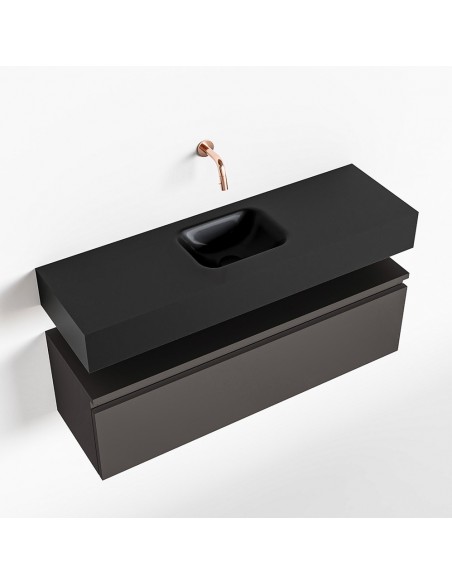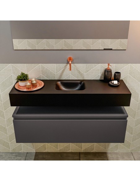 ANDOR Komplet badmiljø med midt centreret håndvask til vægmonteret armatur. Badmiljøet kommer med 1 skuffe med fuldt udtræk, og er fremstillet i MDF. Håndvasken er fremstillet i sort solid surface. Badmiljøet måler 100 cm i bredden. Det viste armatur medfølger ikke i sættet.