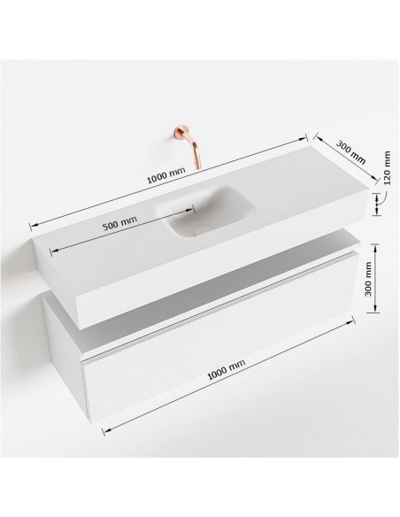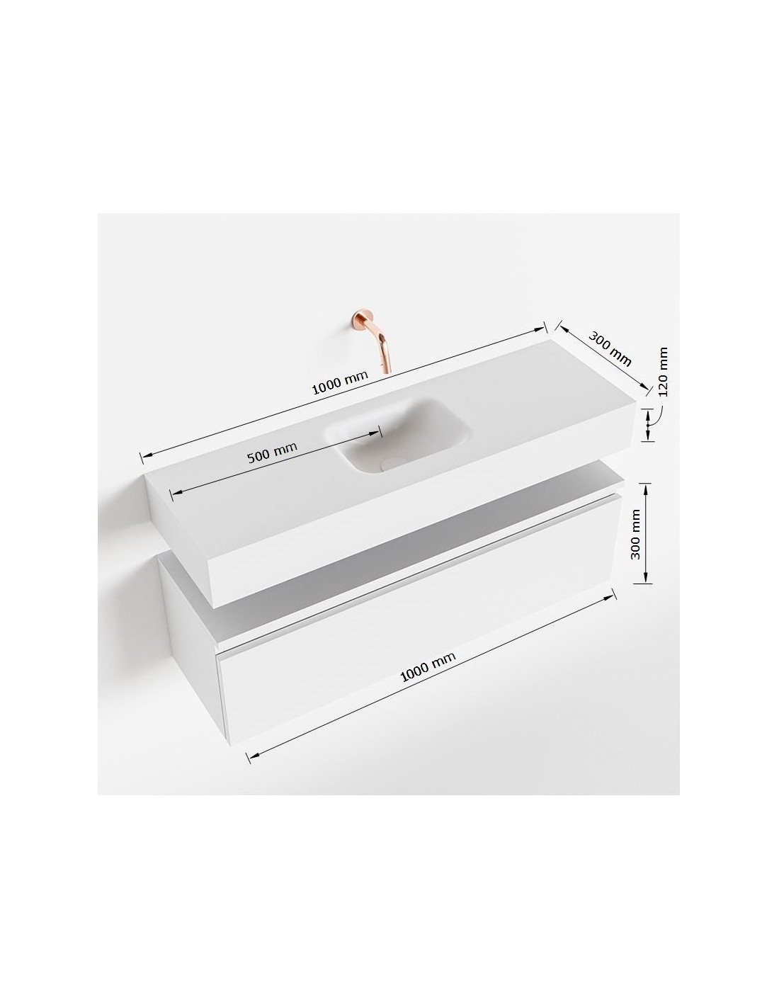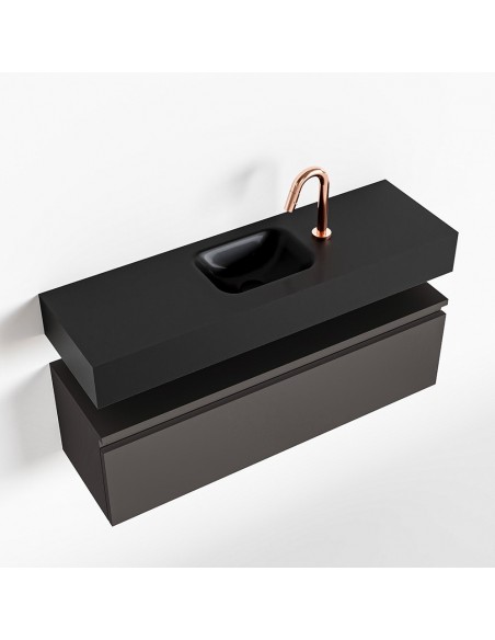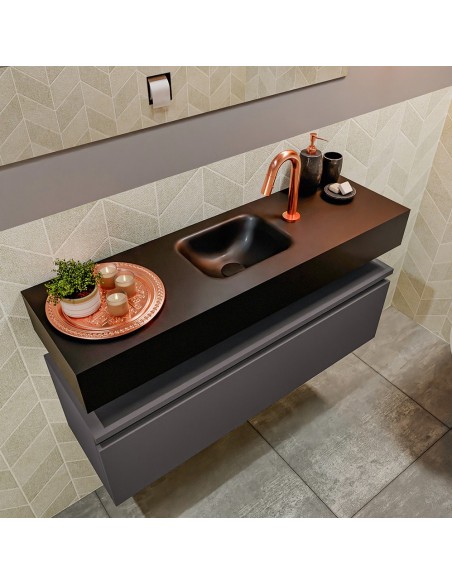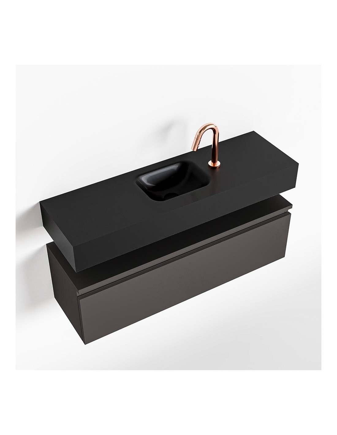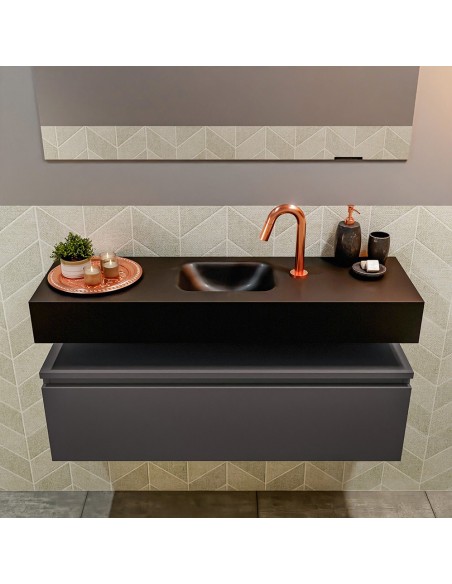 ANDOR Komplet badmiljø med midt centreret håndvask til bordmonteret armatur. Badmiljøet kommer med 1 skuffe med fuldt udtræk, og er fremstillet i MDF. Håndvasken er fremstillet i sort solid surface. Badmiljøet måler 100 cm i bredden. Det viste armatur medfølger ikke i sættet.