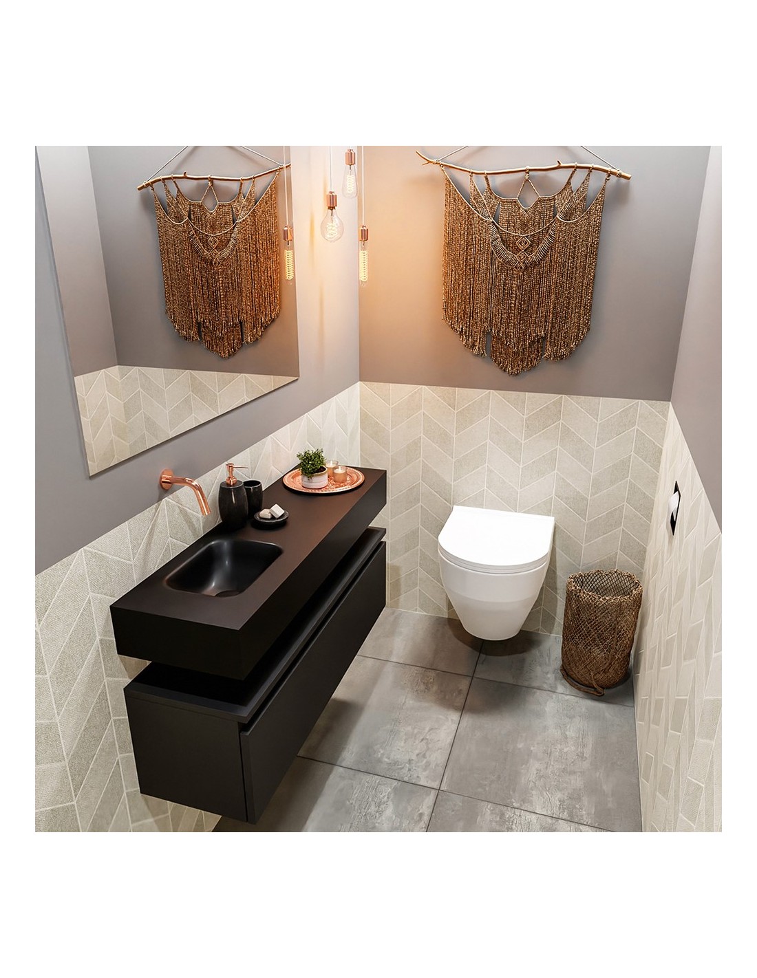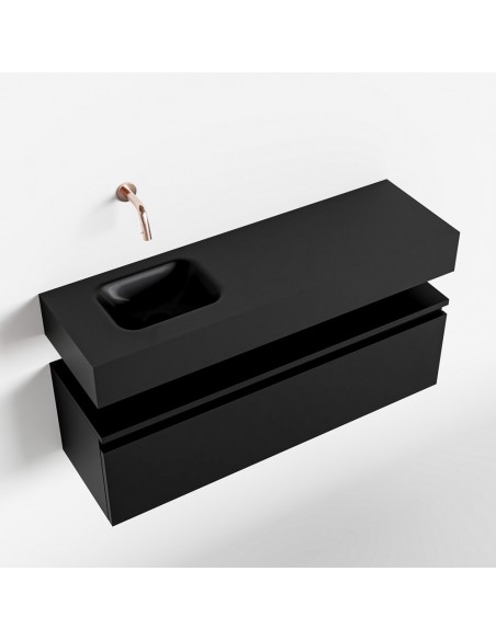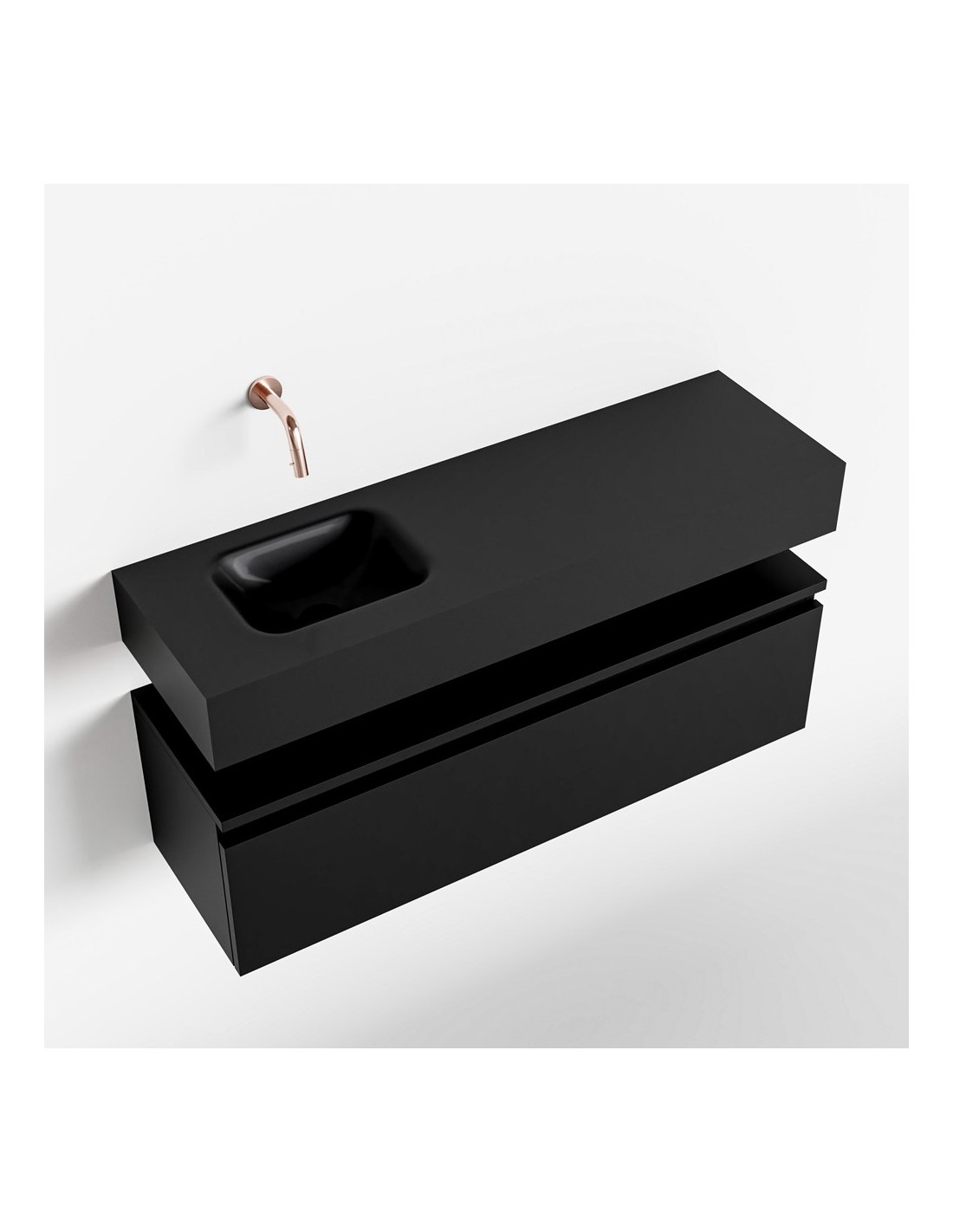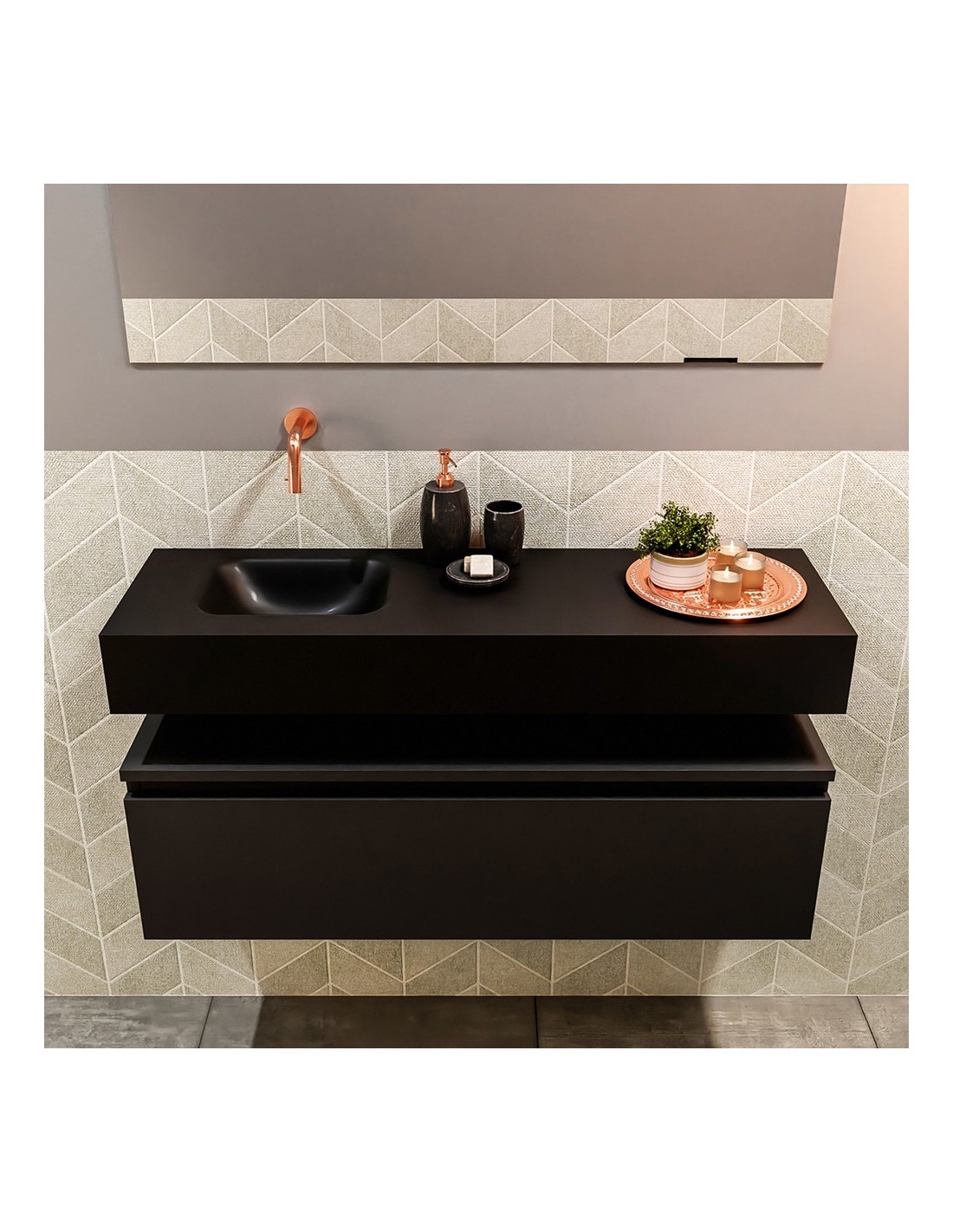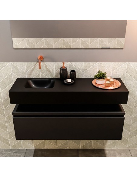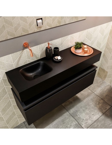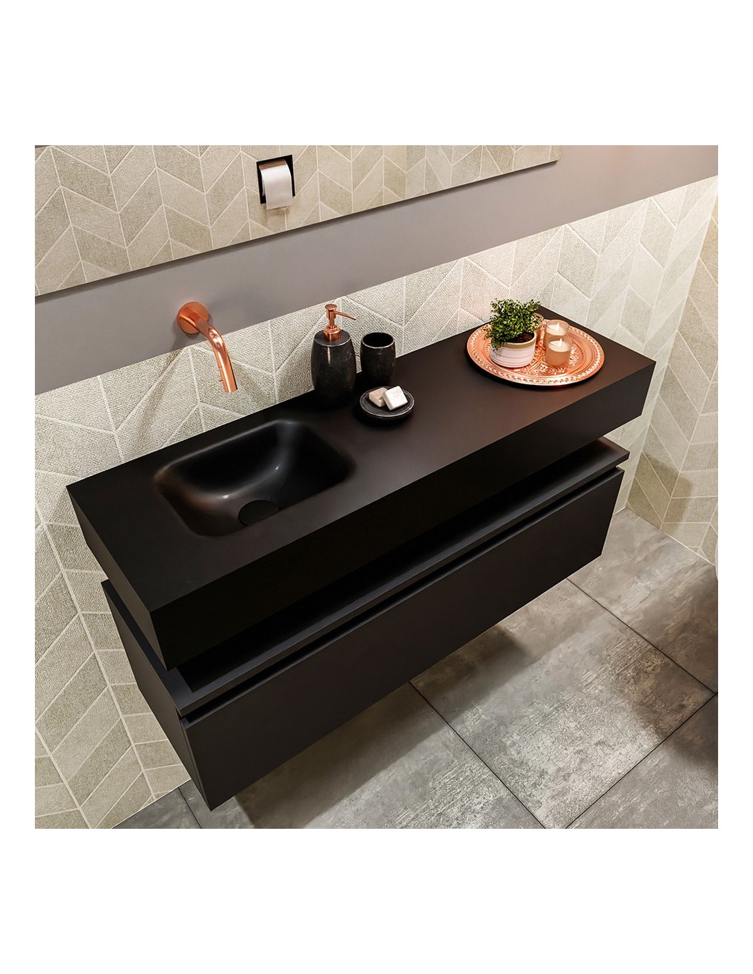 ANDOR Komplet badmiljø med venstrevendt håndvask til vægmonteret armatur. Badmiljøet kommer med 1 skuffe med fuldt udtræk, og er fremstillet i MDF. Håndvasken er fremstillet i sort solid surface. Badmiljøet måler 100 cm i bredden. Det viste armatur medfølger ikke i sættet.