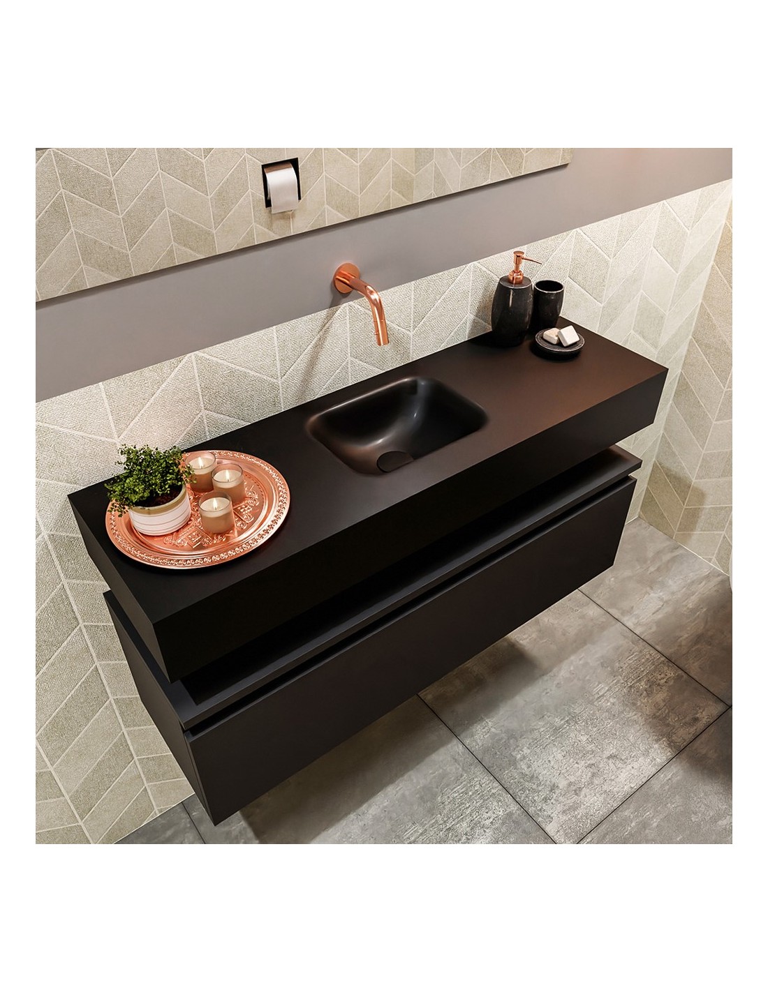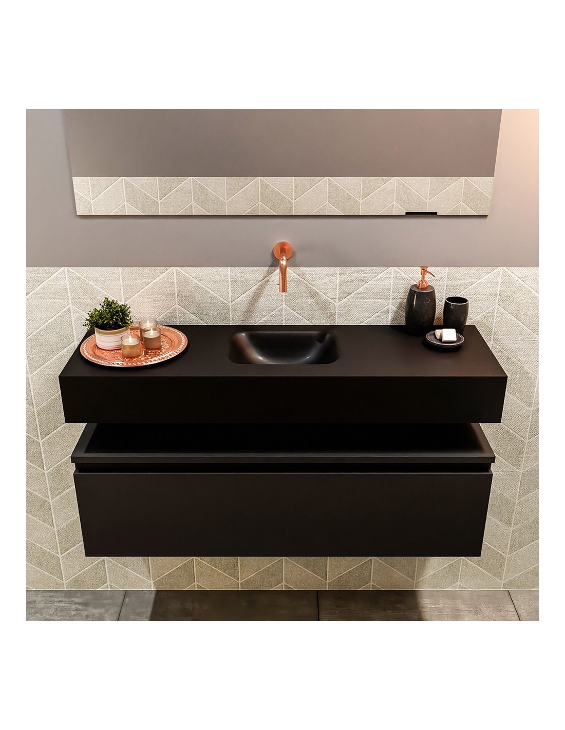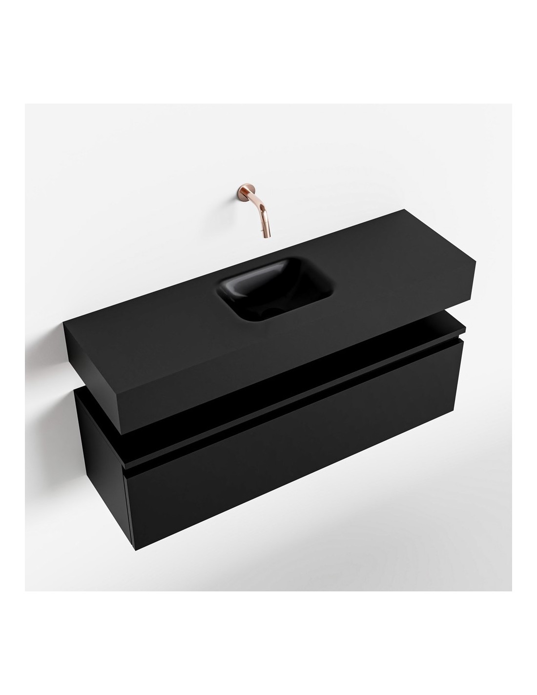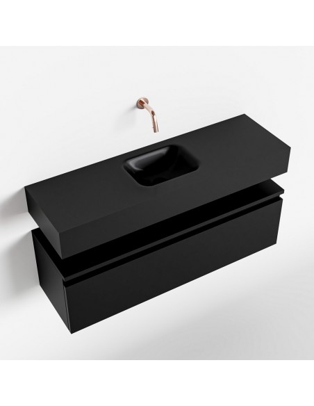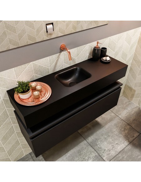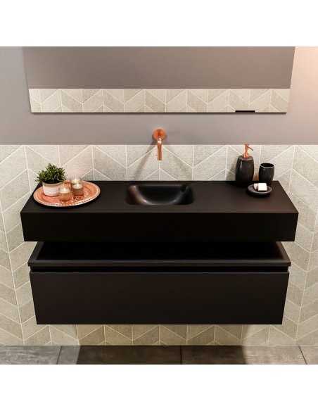 ANDOR Komplet badmiljø med midt centreret håndvask til vægmonteret armatur. Badmiljøet kommer med 1 skuffe med fuldt udtræk, og er fremstillet i MDF. Håndvasken er fremstillet i sort solid surface. Badmiljøet måler 100 cm i bredden. Det viste armatur medfølger ikke i sættet.