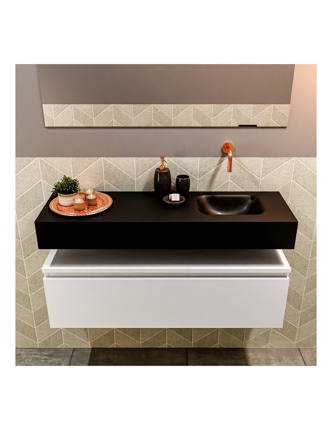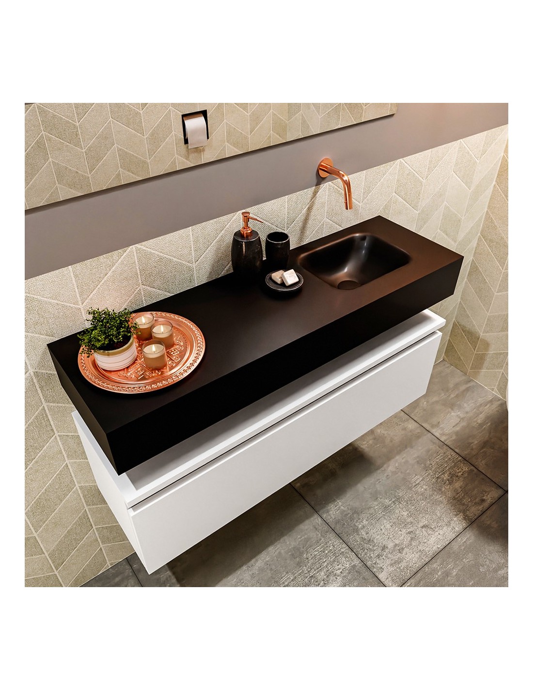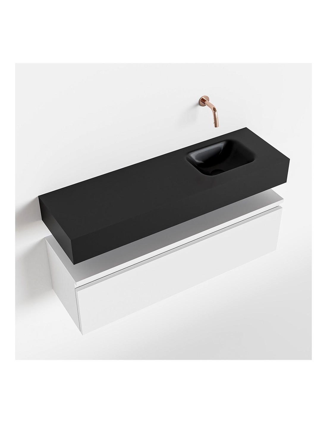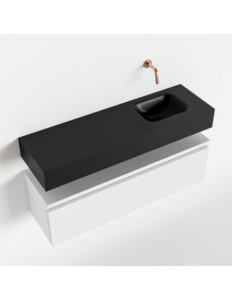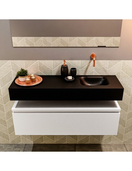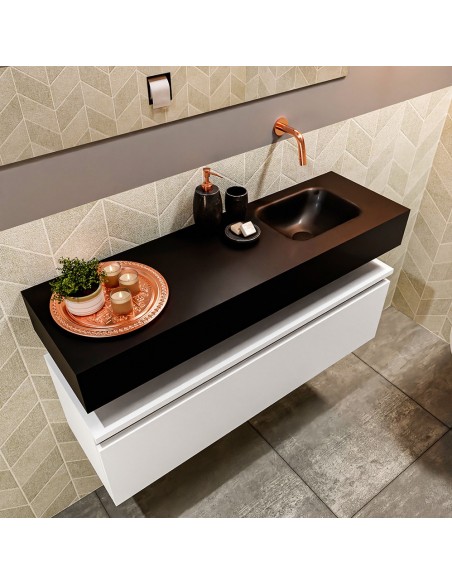 ANDOR Komplet badmiljø med højrevendt håndvask til vægmonteret armatur. Badmiljøet kommer med 1 skuffe med fuldt udtræk, og er fremstillet i MDF. Håndvasken er fremstillet i sort solid surface. Badmiljøet måler 100 cm i bredden. Det viste armatur medfølger ikke i sættet.