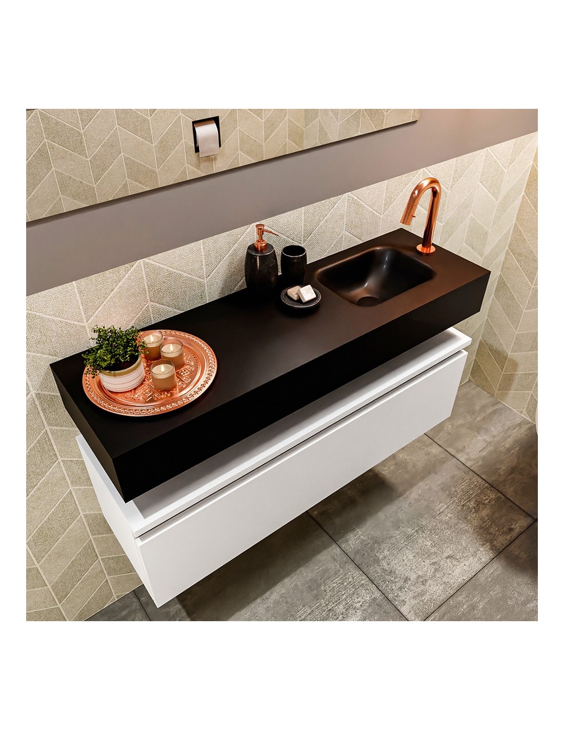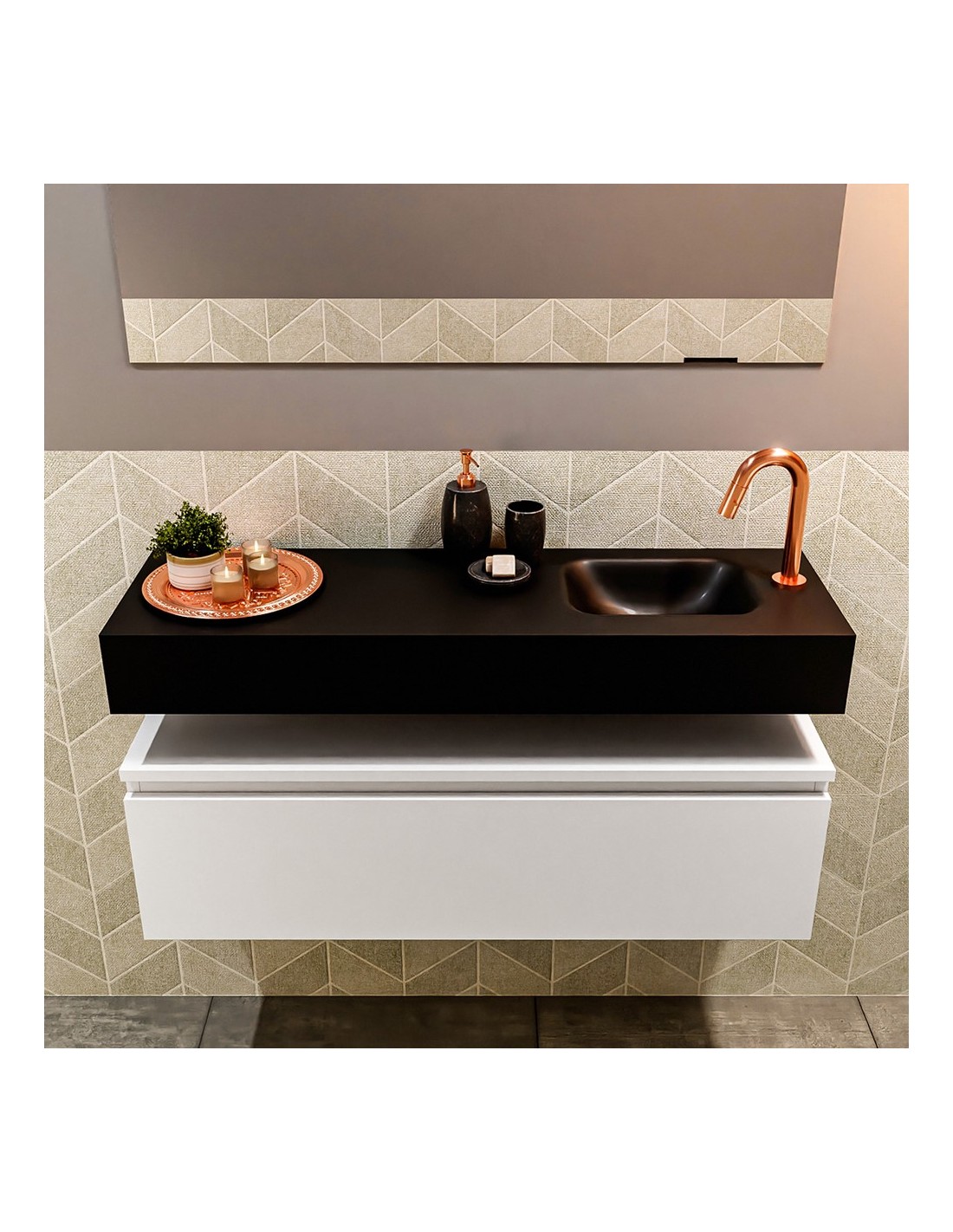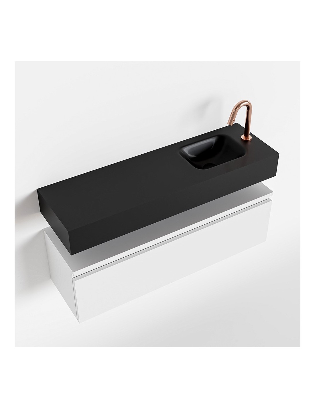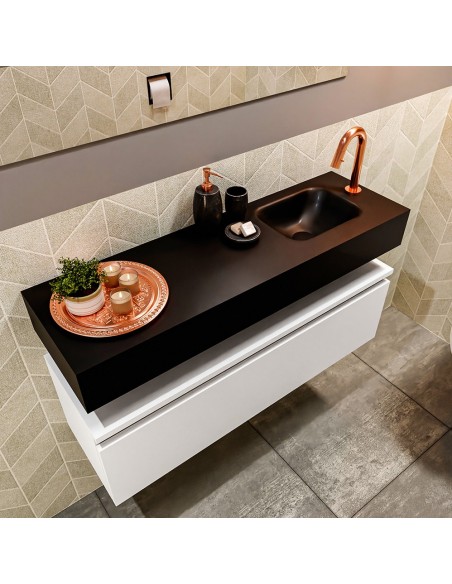 ANDOR Komplet badmiljø med højrevendt håndvask til bordmonteret armatur. Badmiljøet kommer med 1 skuffe med fuldt udtræk, og er fremstillet i MDF. Håndvasken er fremstillet i sort solid surface. Badmiljøet måler 100 cm i bredden. Det viste armatur medfølger ikke i sættet.