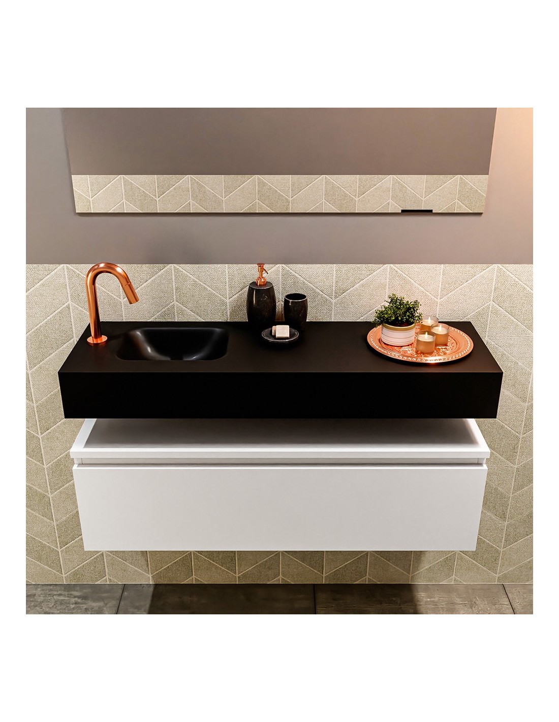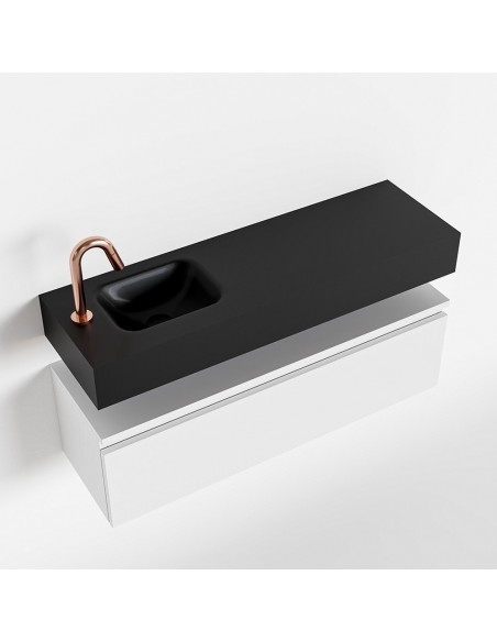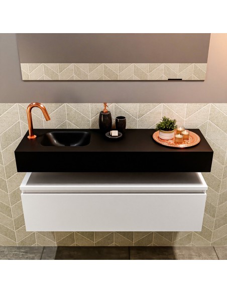 ANDOR Komplet badmiljø med venstrevendt håndvask til bordmonteret armatur. Badmiljøet kommer med 1 skuffe med fuldt udtræk, og er fremstillet i MDF. Håndvasken er fremstillet i sort solid surface. Badmiljøet måler 100 cm i bredden. Det viste armatur medfølger ikke i sættet.