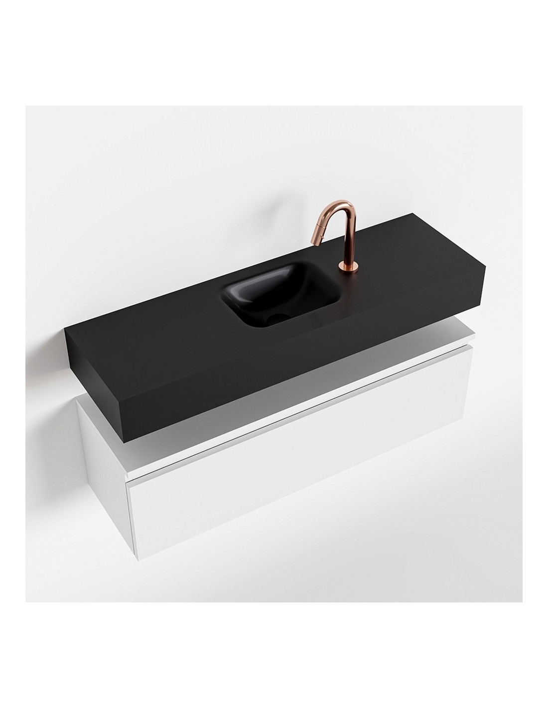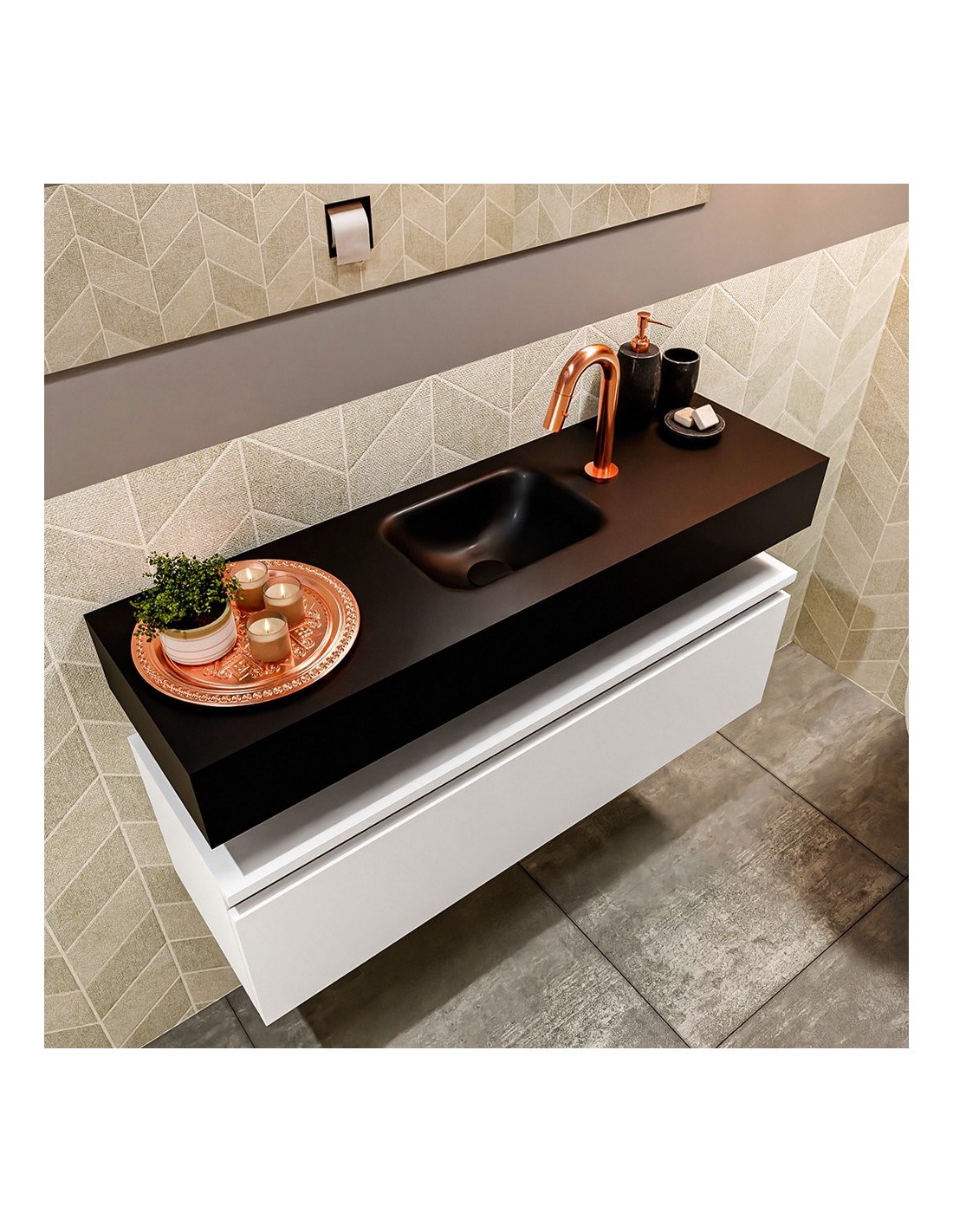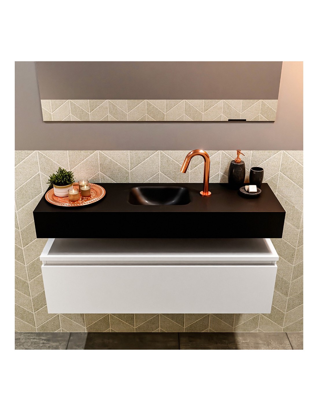 ANDOR Komplet badmiljø med midt centreret håndvask til bordmonteret armatur. Badmiljøet kommer med 1 skuffe med fuldt udtræk, og er fremstillet i MDF. Håndvasken er fremstillet i sort solid surface. Badmiljøet måler 100 cm i bredden. Det viste armatur medfølger ikke i sættet.