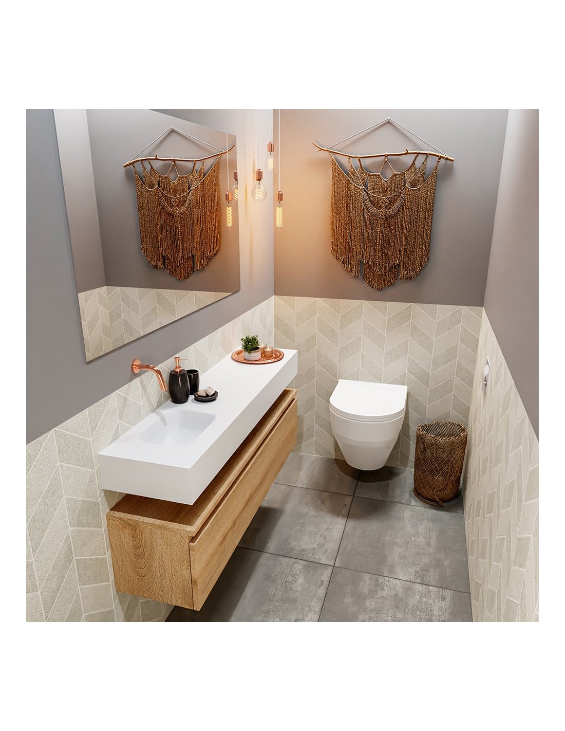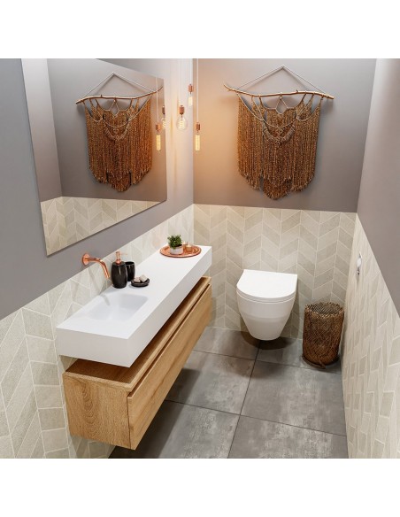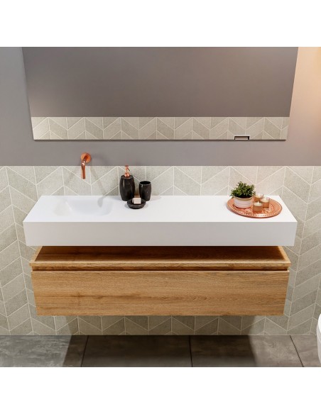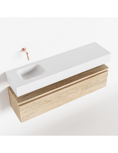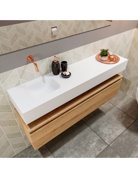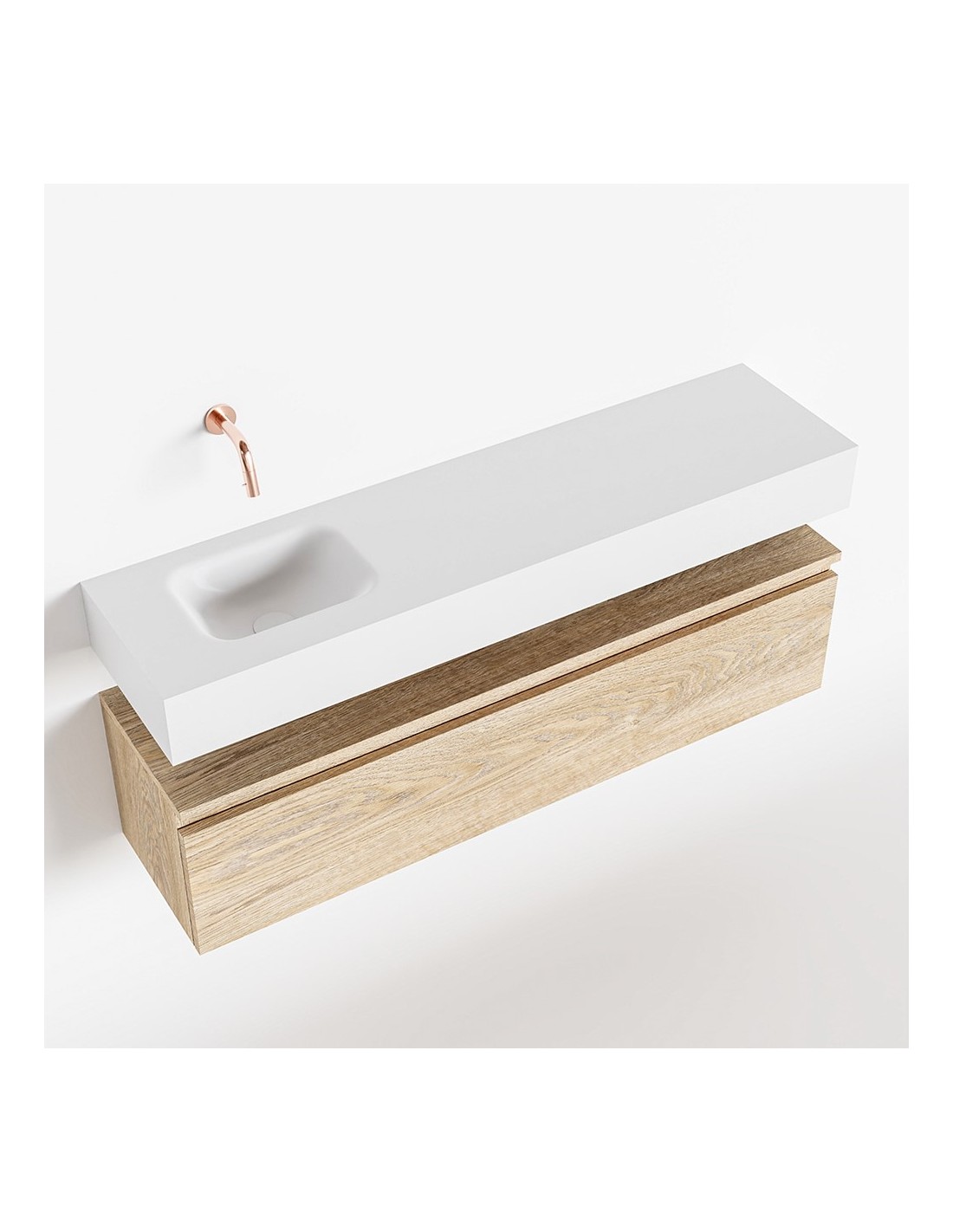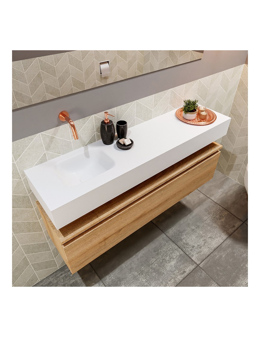 ANDOR Komplet badmiljø med venstrevendt håndvask til vægmonteret armatur. Badmiljøet kommer med 1 skuffe med fuldt udtræk, og er fremstillet i MDF med design af vasket eg. Håndvasken er fremstillet i talkumsfarvet (mat hvid) solid surface. Badmiljøet måler 120 cm i bredden. Det viste armatur medfølger ikke i sættet.