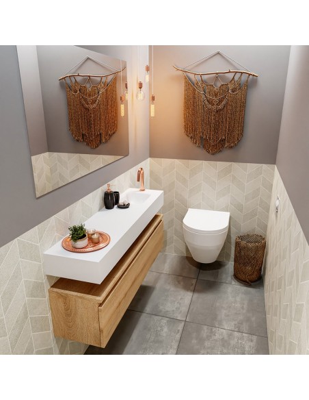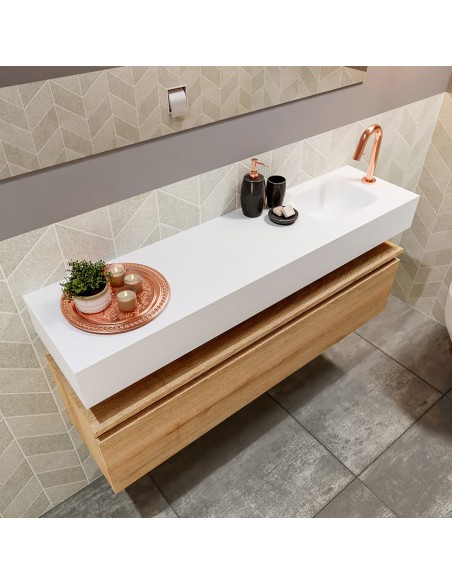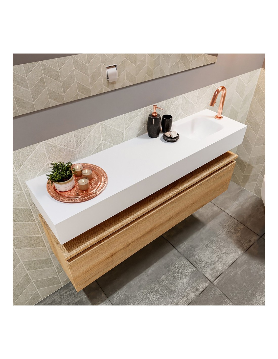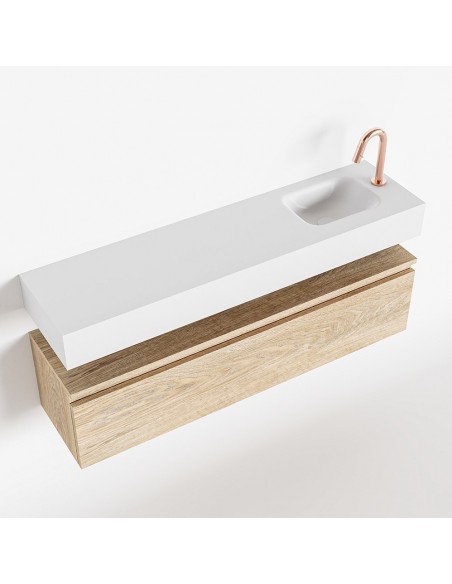ANDOR Komplet badmiljø med højrevendt håndvask til bordmonteret armatur. Badmiljøet kommer med 1 skuffe med fuldt udtræk, og er fremstillet i MDF med design af vasket eg. Håndvasken er fremstillet i talkumsfarvet (mat hvid) solid surface. Badmiljøet måler 120 cm i bredden. Det viste armatur medfølger ikke i sættet.