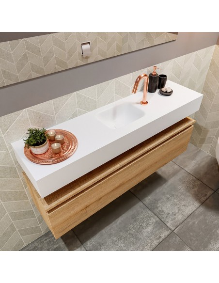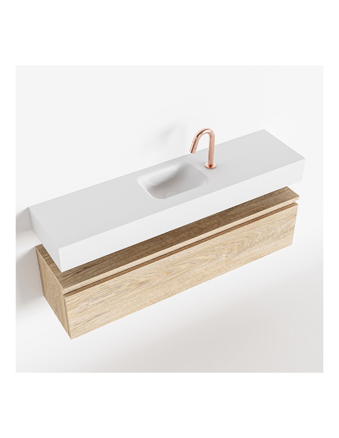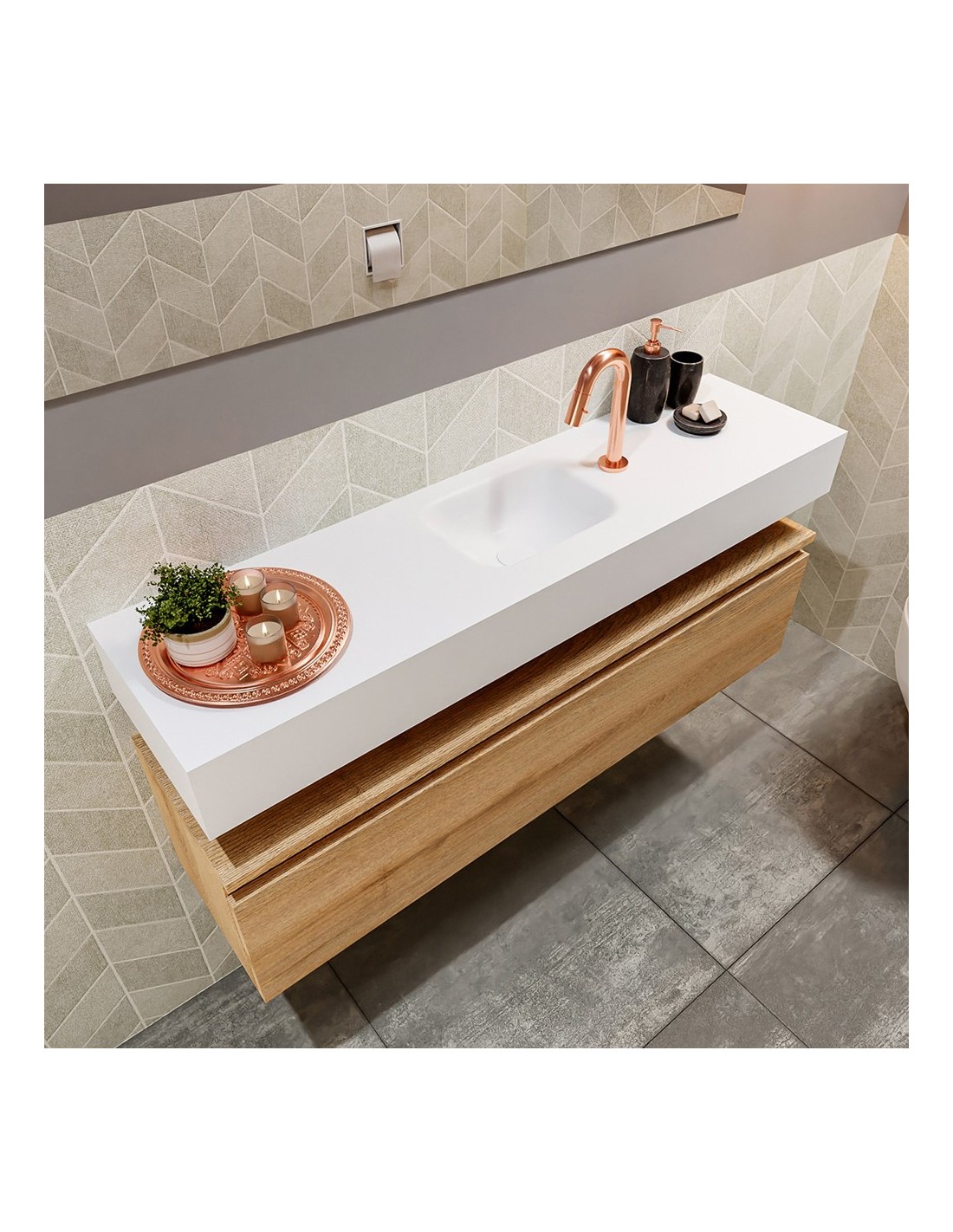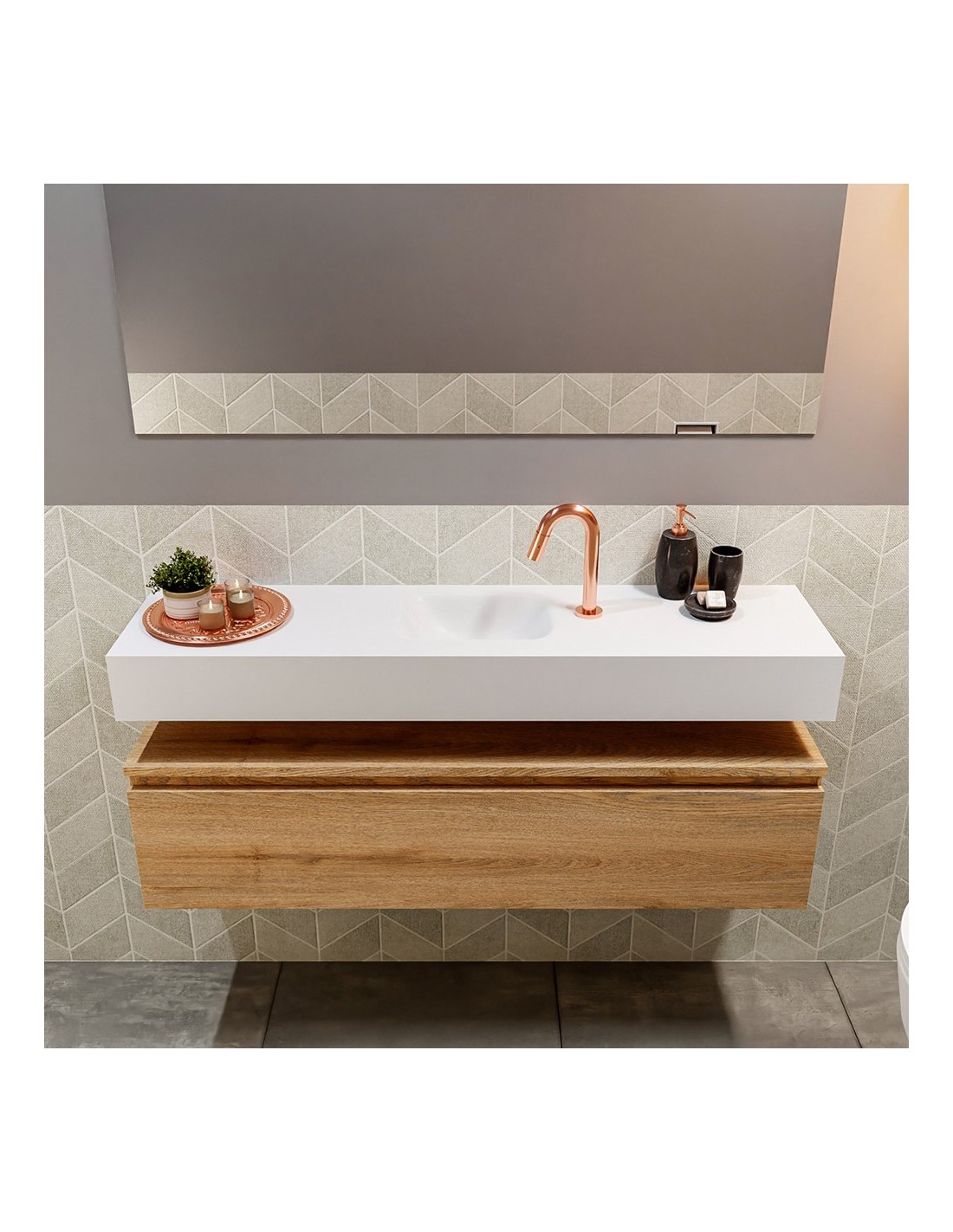 ANDOR Komplet badmiljø med midt centreret håndvask til bordmonteret armatur. Badmiljøet kommer med 1 skuffe med fuldt udtræk, og er fremstillet i MDF med design af vasket eg. Håndvasken er fremstillet i talkumsfarvet (mat hvid) solid surface. Badmiljøet måler 120 cm i bredden. Det viste armatur medfølger ikke i sættet.