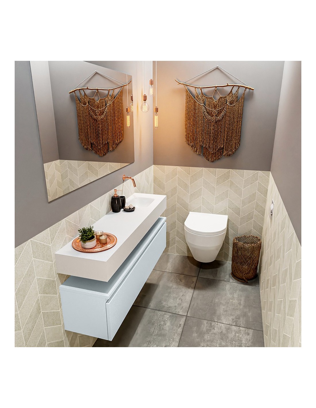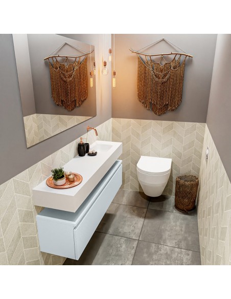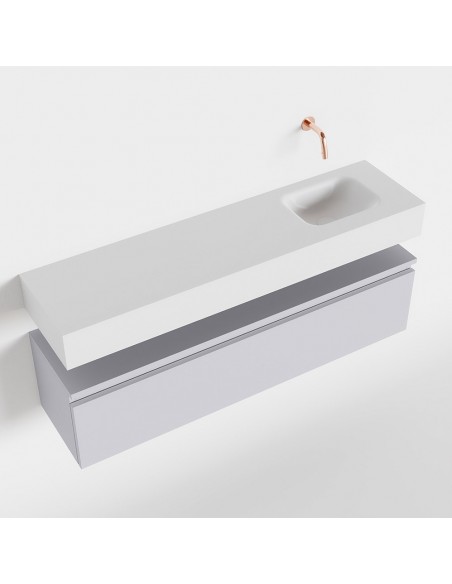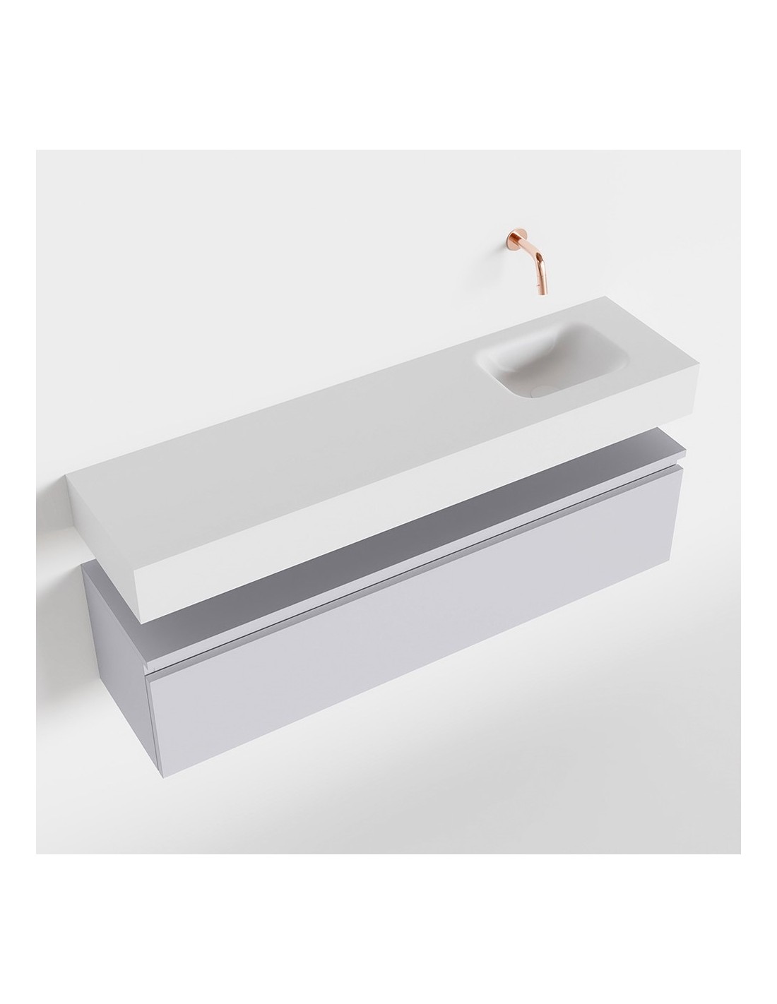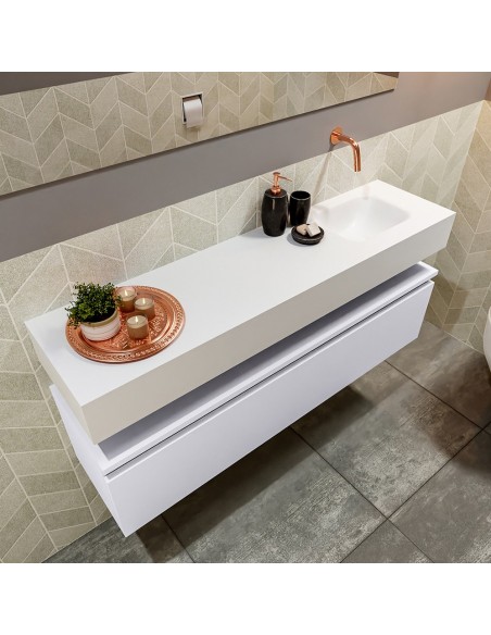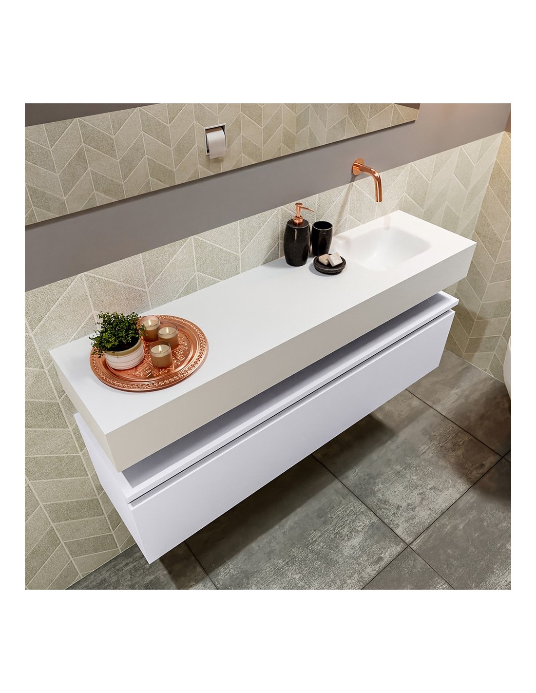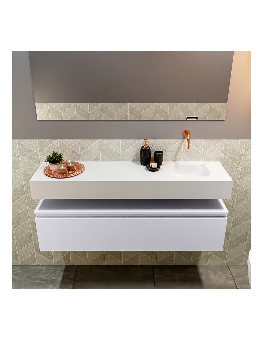 ANDOR Komplet badmiljø med højrevendt håndvask til vægmonteret armatur. Badmiljøet kommer med 1 skuffe med fuldt udtræk, og er fremstillet i MDF. Håndvasken er fremstillet i talkumsfarvet (mat hvid) solid surface. Badmiljøet måler 120 cm i bredden. Det viste armatur medfølger ikke i sættet.