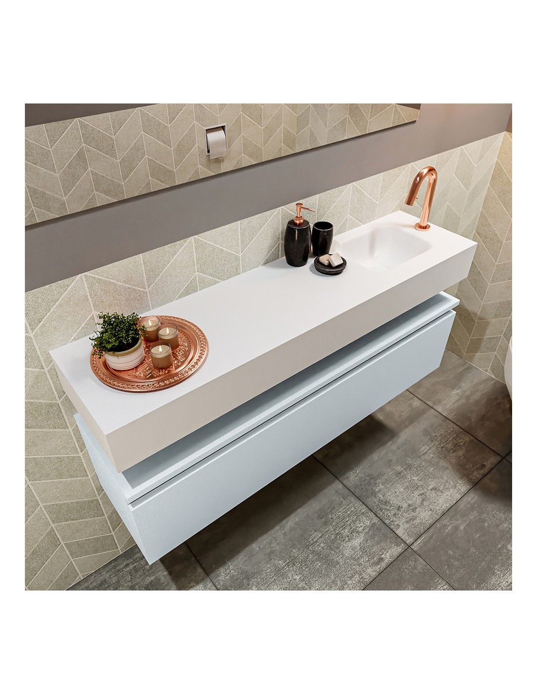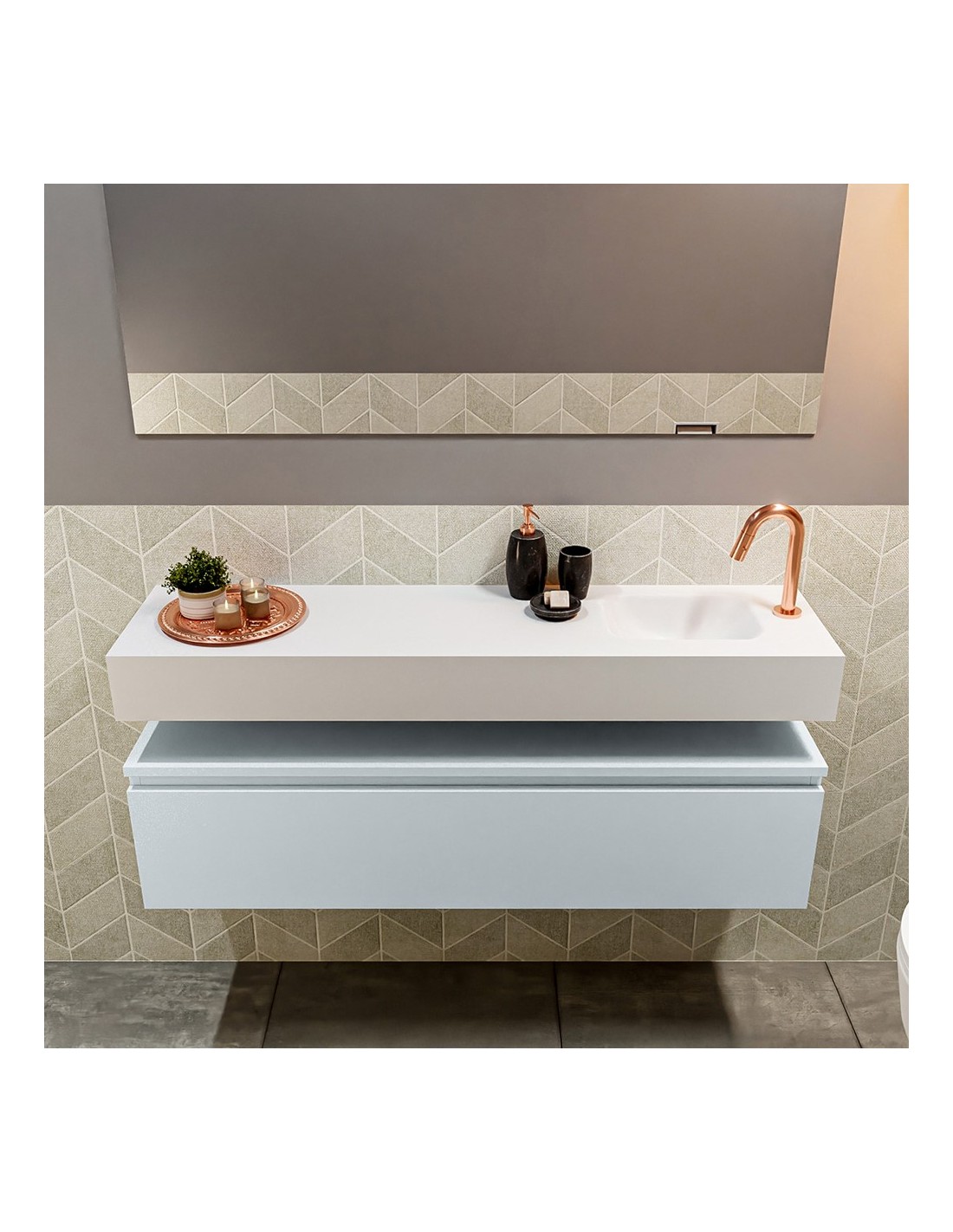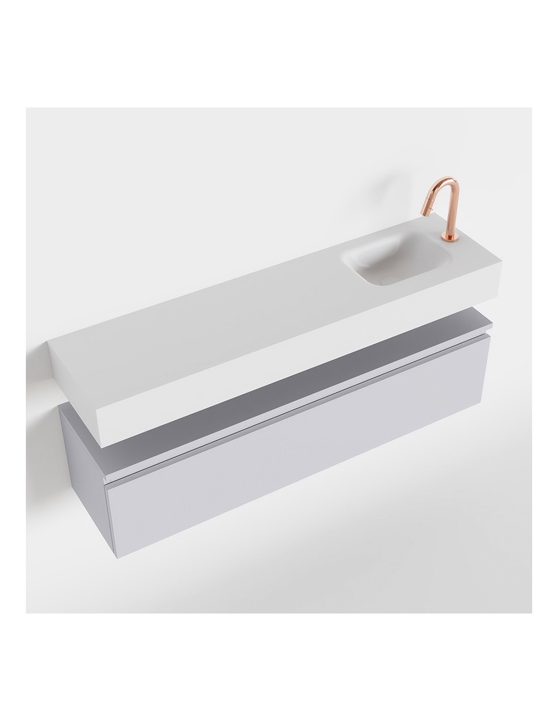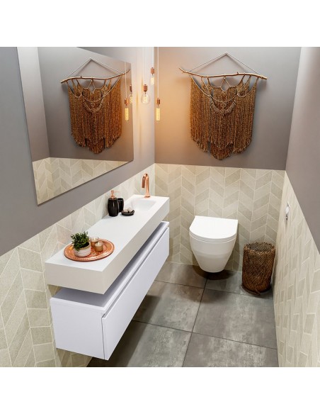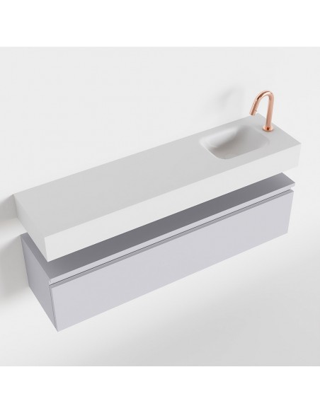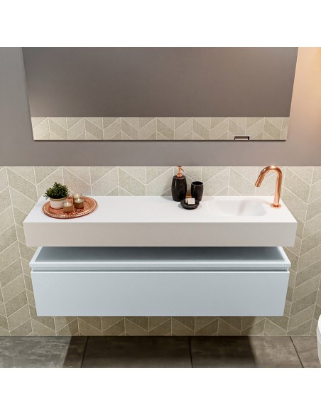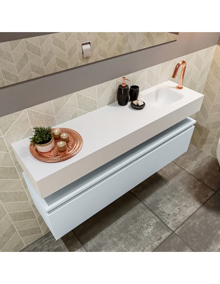 ANDOR Komplet badmiljø med højrevendt håndvask til bordmonteret armatur. Badmiljøet kommer med 1 skuffe med fuldt udtræk, og er fremstillet i MDF. Håndvasken er fremstillet i talkumsfarvet (mat hvid) solid surface. Badmiljøet måler 120 cm i bredden. Det viste armatur medfølger ikke i sættet.