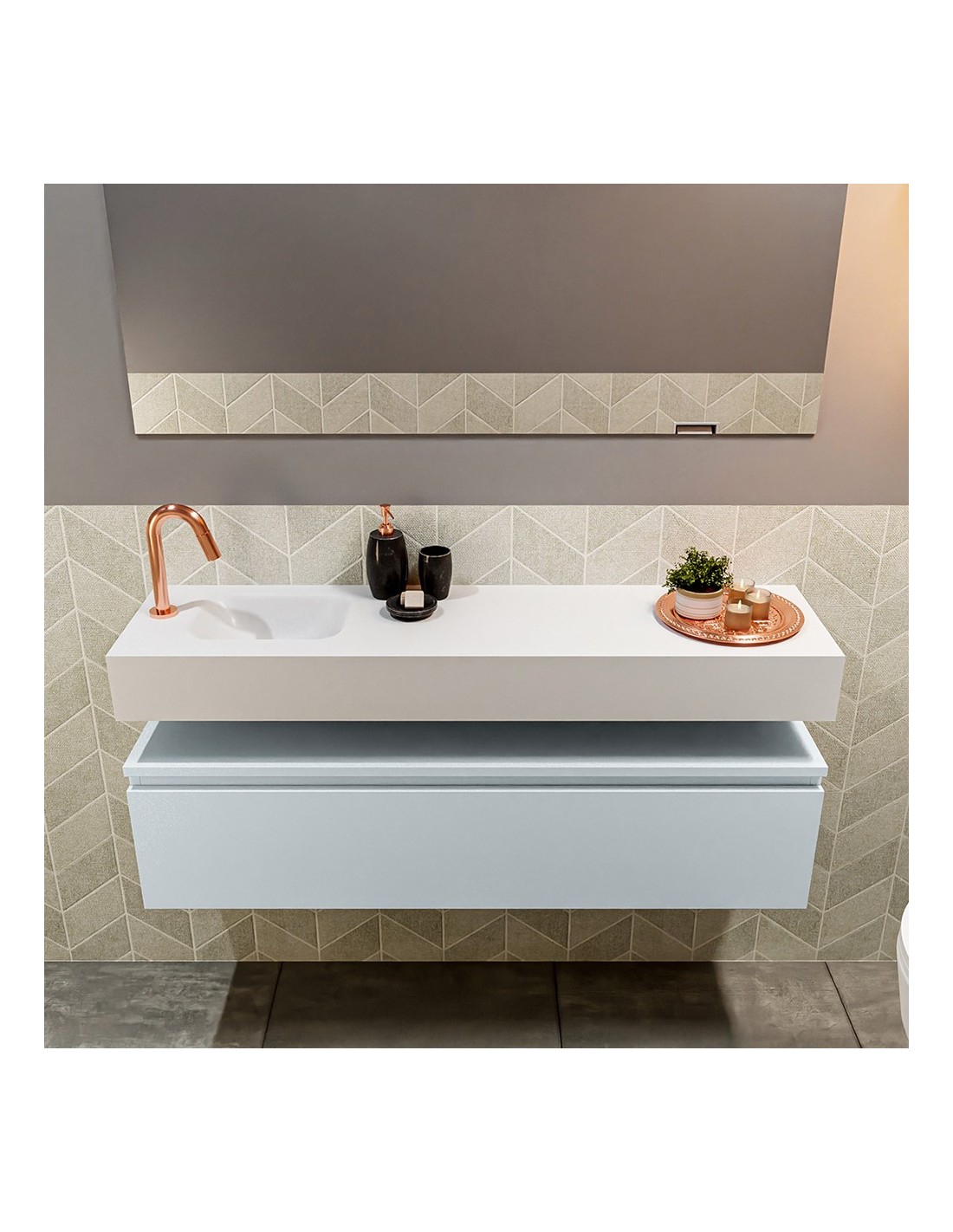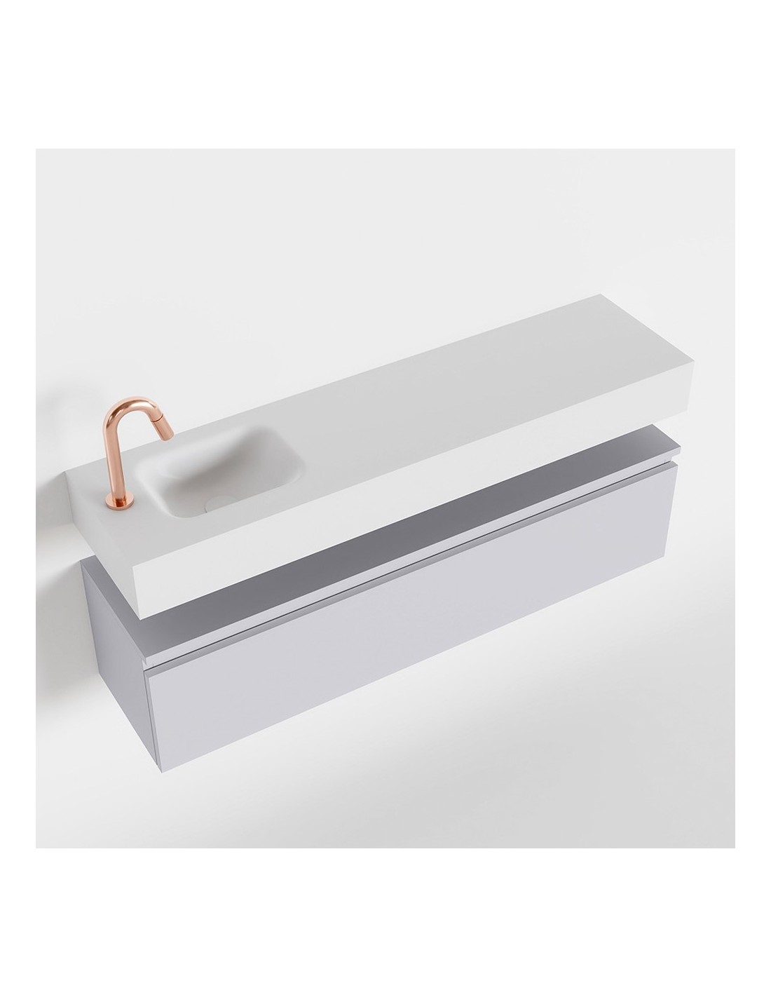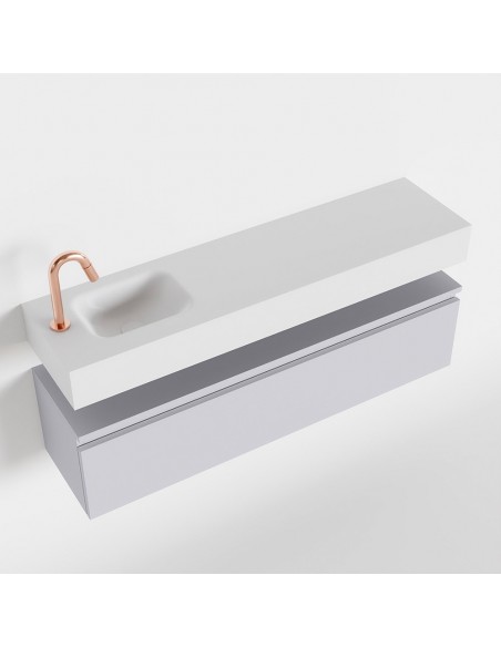 ANDOR Komplet badmiljø med venstrevendt håndvask til bordmonteret armatur. Badmiljøet kommer med 1 skuffe med fuldt udtræk, og er fremstillet i MDF. Håndvasken er fremstillet i talkumsfarvet (mat hvid) solid surface. Badmiljøet måler 120 cm i bredden. Det viste armatur medfølger ikke i sættet.