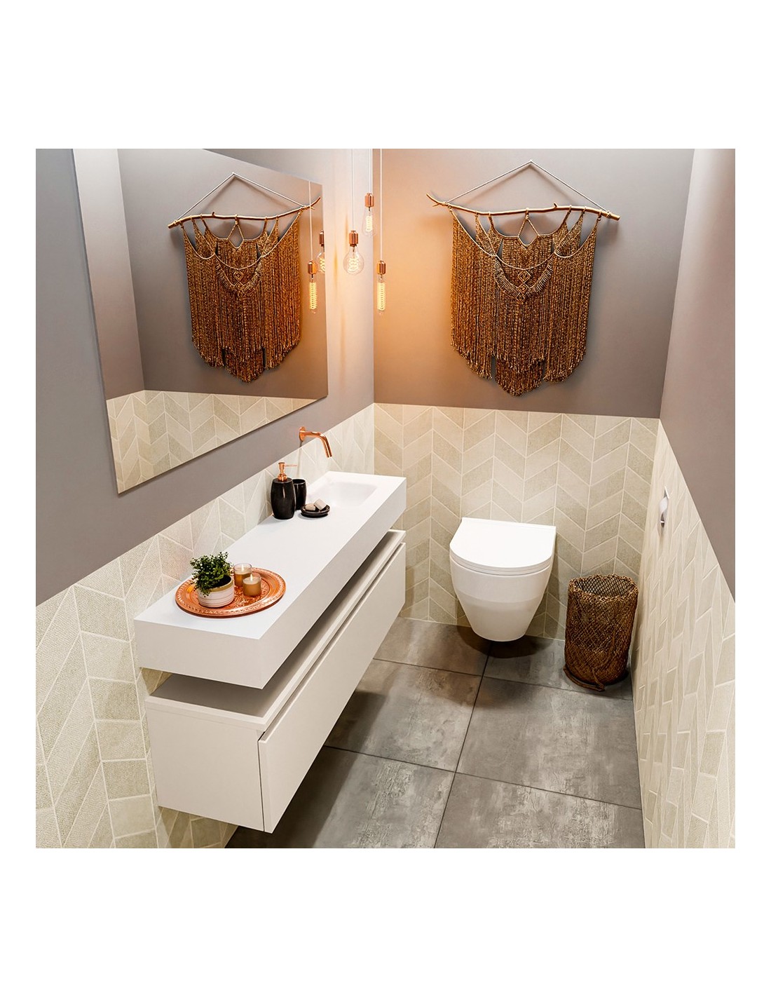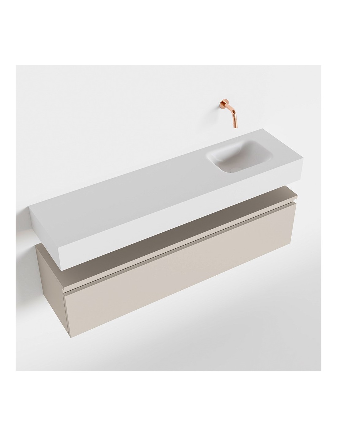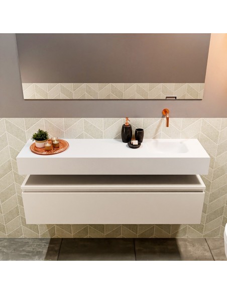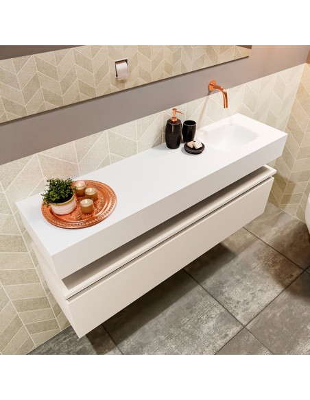 ANDOR Komplet badmiljø med højrevendt håndvask til vægmonteret armatur. Badmiljøet kommer med 1 skuffe med fuldt udtræk, og er fremstillet i MDF. Håndvasken er fremstillet i talkumsfarvet (mat hvid) solid surface. Badmiljøet måler 120 cm i bredden. Det viste armatur medfølger ikke i sættet.