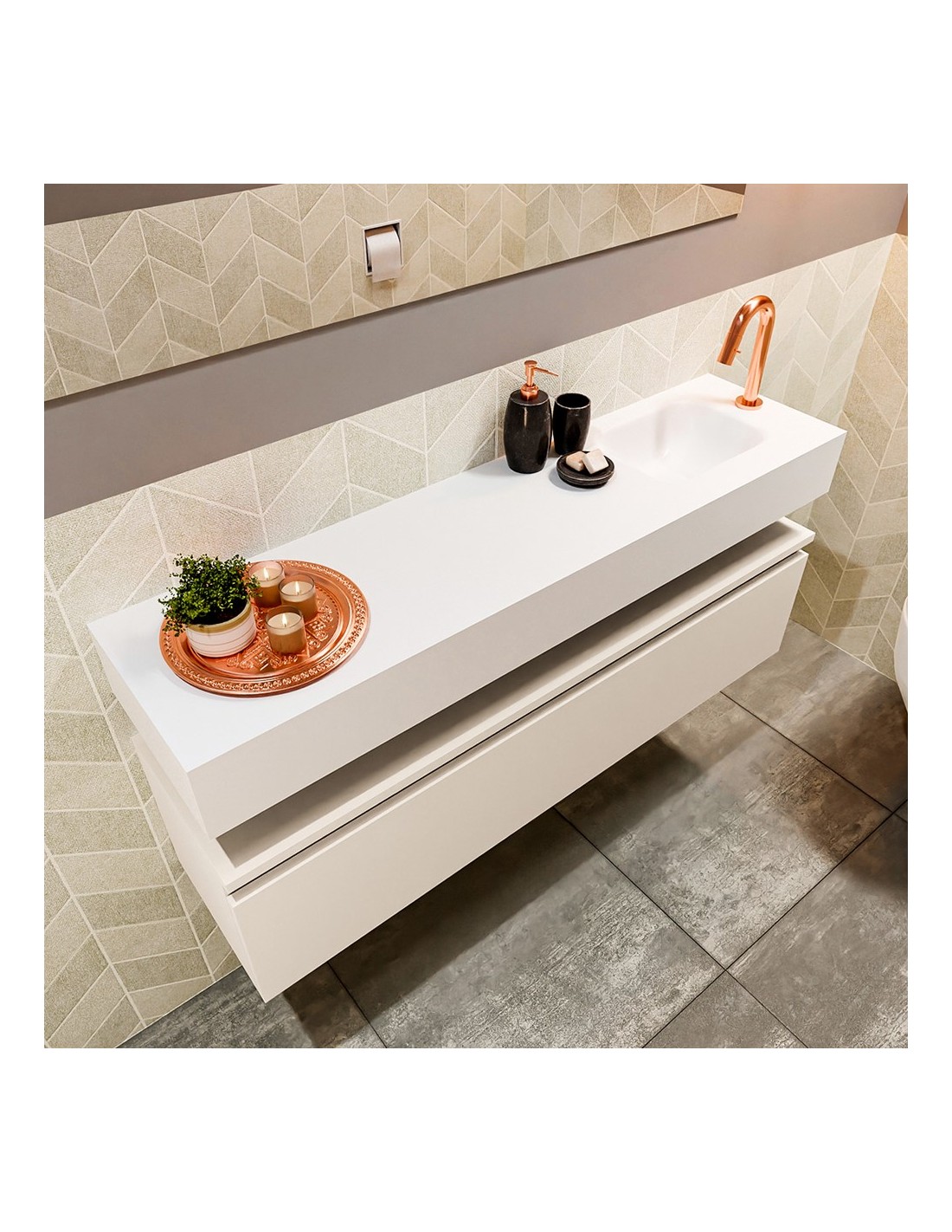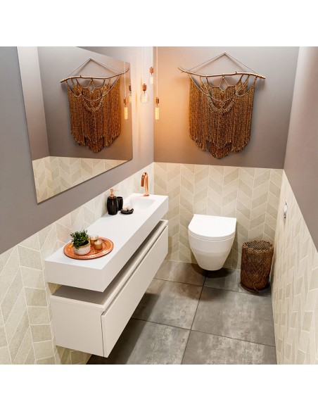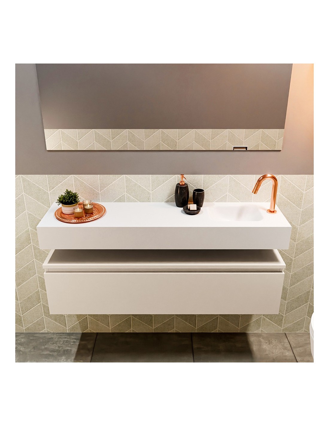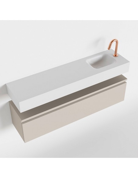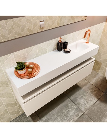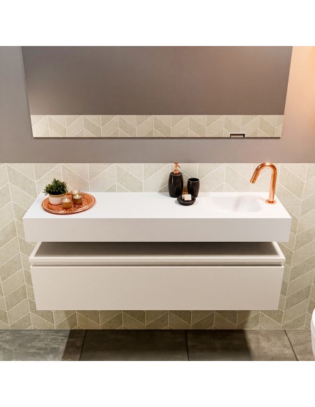 ANDOR Komplet badmiljø med højrevendt håndvask til bordmonteret armatur. Badmiljøet kommer med 1 skuffe med fuldt udtræk, og er fremstillet i MDF. Håndvasken er fremstillet i talkumsfarvet (mat hvid) solid surface. Badmiljøet måler 120 cm i bredden. Det viste armatur medfølger ikke i sættet.