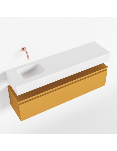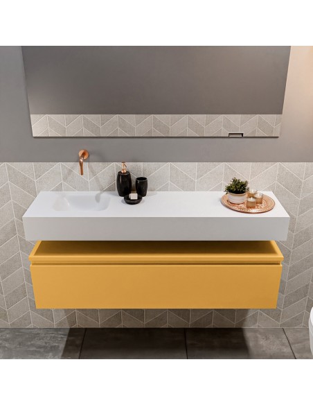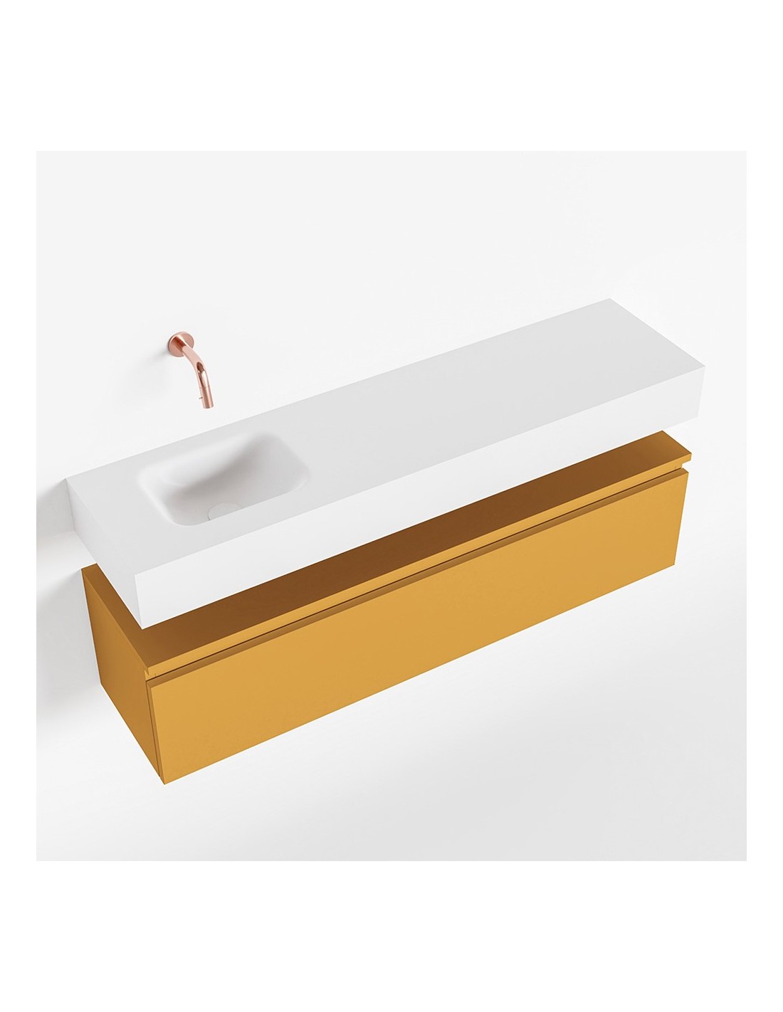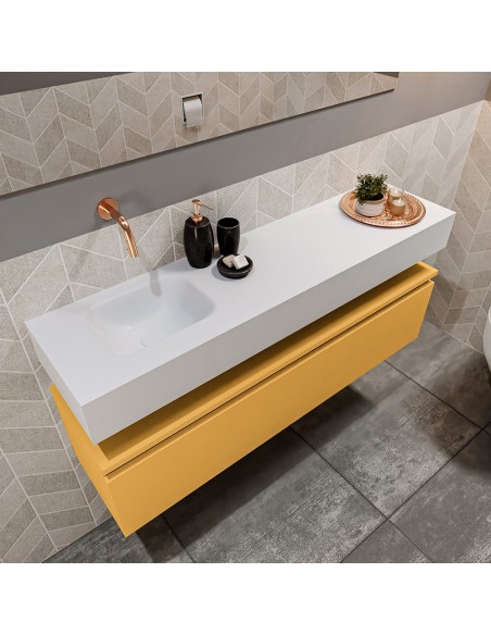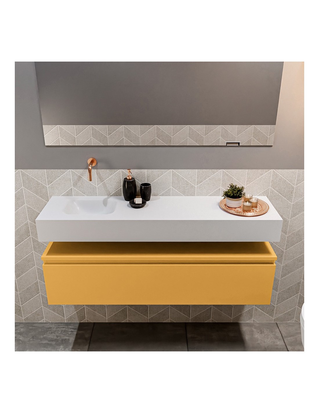 ANDOR Komplet badmiljø med venstrevendt håndvask til vægmonteret armatur. Badmiljøet kommer med 1 skuffe med fuldt udtræk, og er fremstillet i MDF. Håndvasken er fremstillet i talkumsfarvet (mat hvid) solid surface. Badmiljøet måler 120 cm i bredden. Det viste armatur medfølger ikke i sættet.