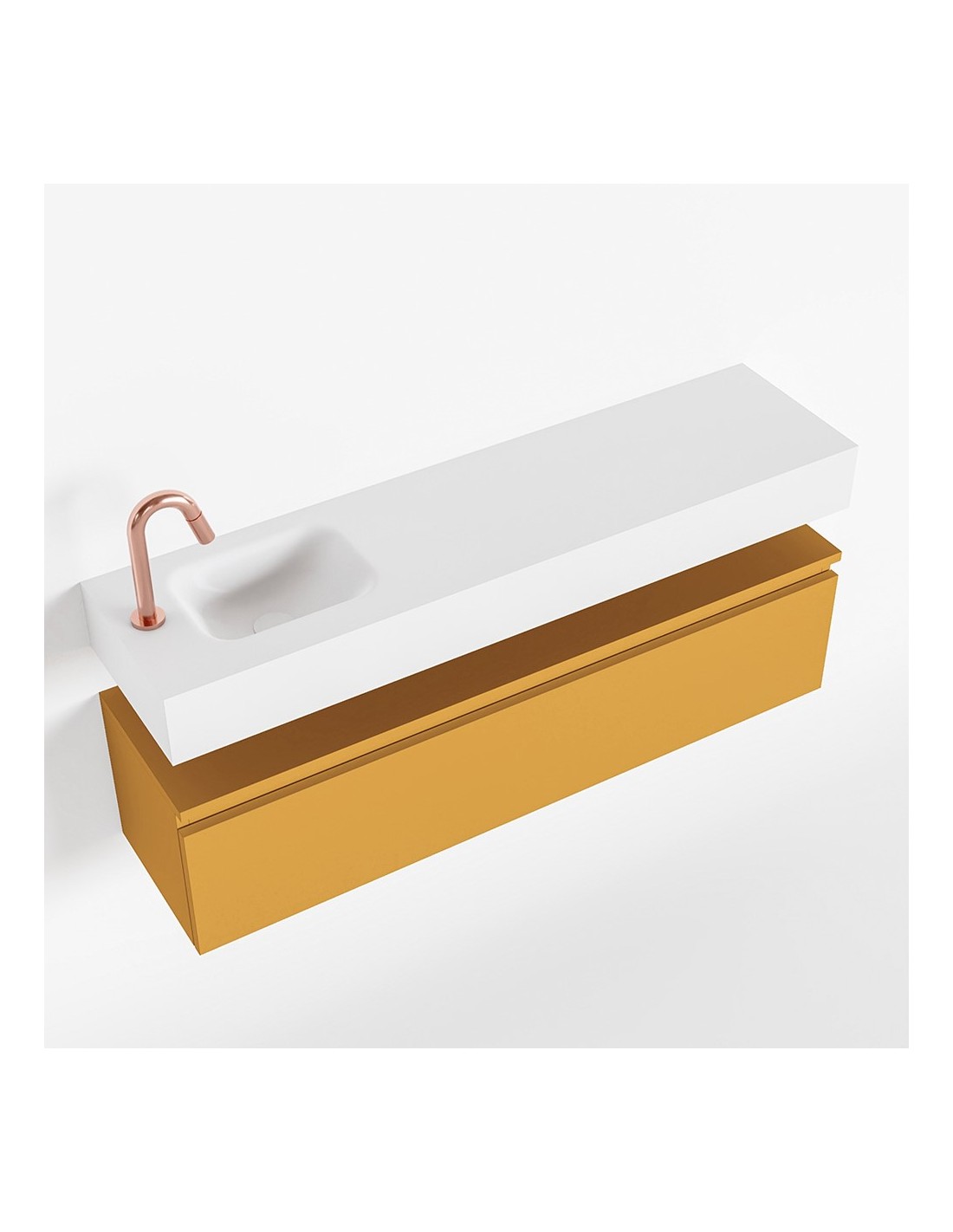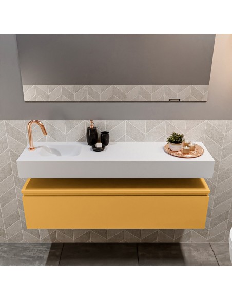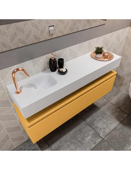 ANDOR Komplet badmiljø med venstrevendt håndvask til bordmonteret armatur. Badmiljøet kommer med 1 skuffe med fuldt udtræk, og er fremstillet i MDF. Håndvasken er fremstillet i talkumsfarvet (mat hvid) solid surface. Badmiljøet måler 120 cm i bredden. Det viste armatur medfølger ikke i sættet.
