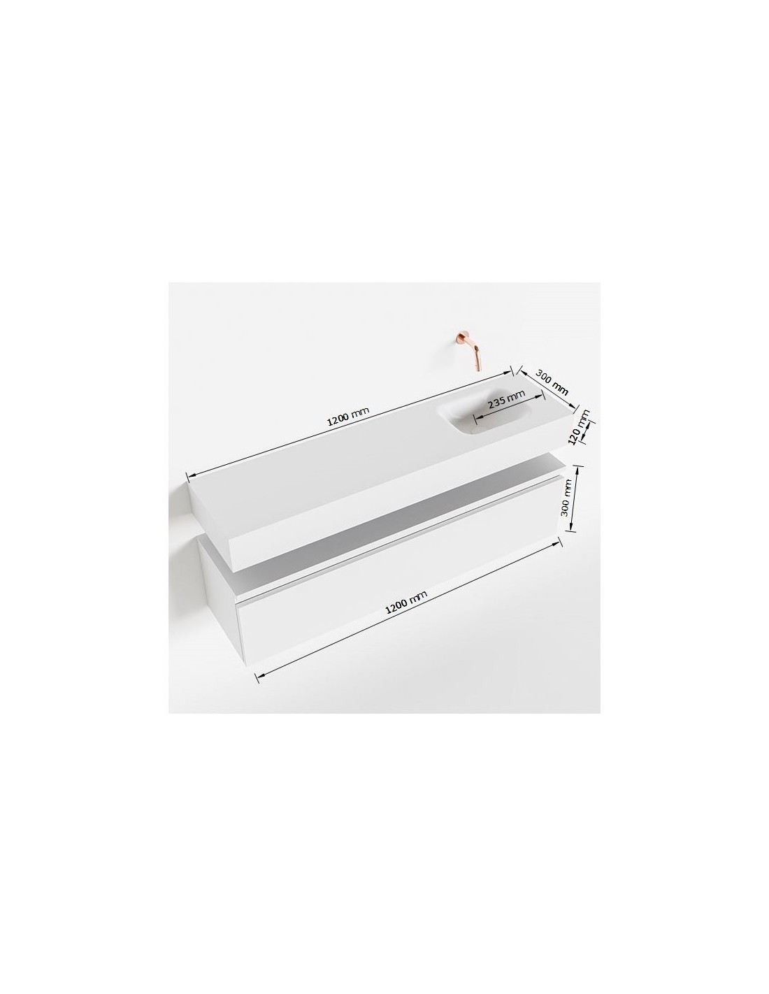 ANDOR Komplet badmiljø med højrevendt håndvask til vægmonteret armatur. Badmiljøet kommer med 1 skuffe med fuldt udtræk, og er fremstillet i MDF. Håndvasken er fremstillet i talkumsfarvet (mat hvid) solid surface. Badmiljøet måler 120 cm i bredden. Det viste armatur medfølger ikke i sættet.