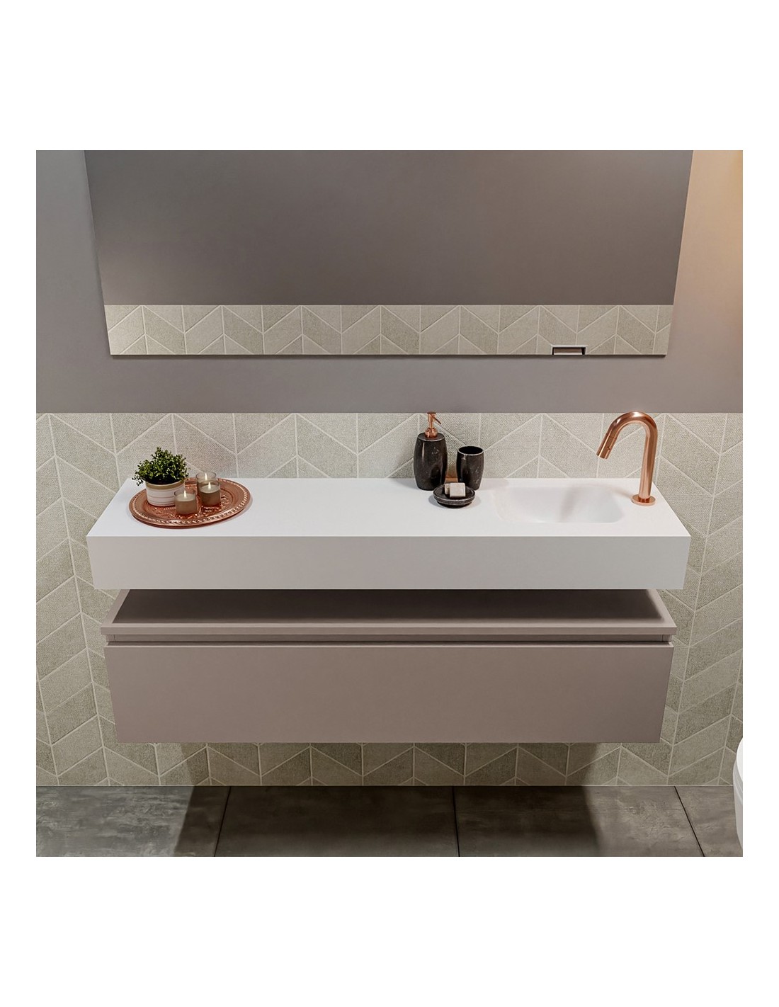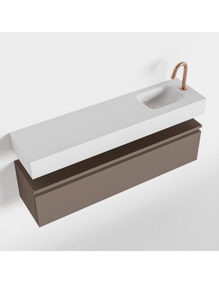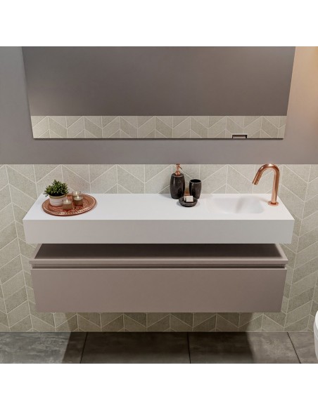 ANDOR Komplet badmiljø med højrevendt håndvask til bordmonteret armatur. Badmiljøet kommer med 1 skuffe med fuldt udtræk, og er fremstillet i MDF. Håndvasken er fremstillet i talkumsfarvet (mat hvid) solid surface. Badmiljøet måler 120 cm i bredden. Det viste armatur medfølger ikke i sættet.