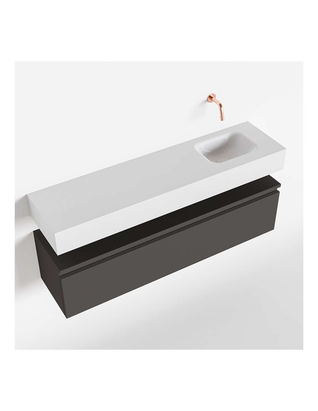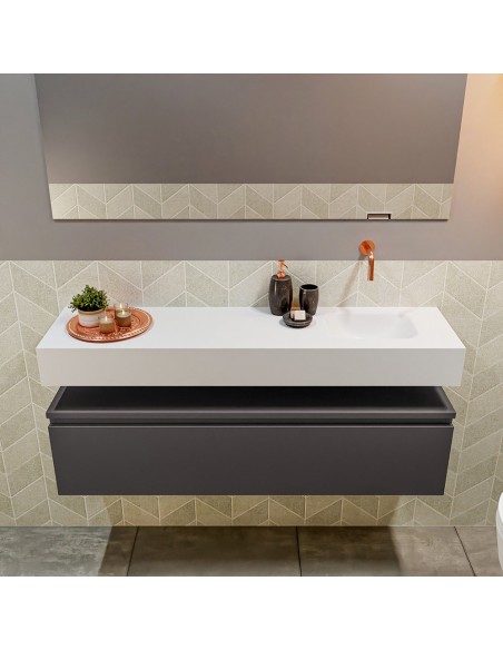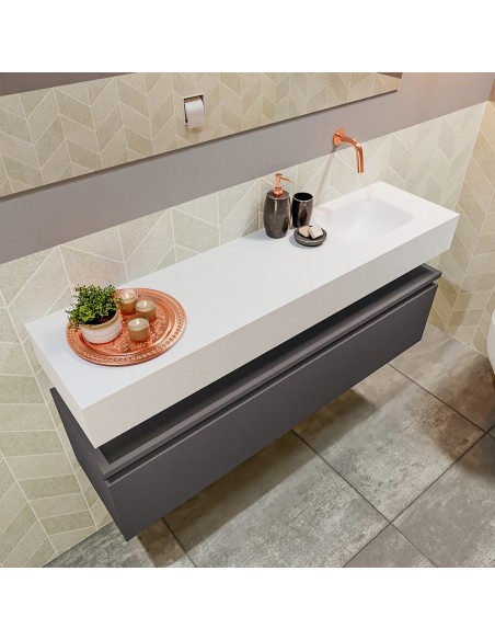ANDOR Komplet badmiljø med højrevendt håndvask til vægmonteret armatur. Badmiljøet kommer med 1 skuffe med fuldt udtræk, og er fremstillet i MDF. Håndvasken er fremstillet i talkumsfarvet (mat hvid) solid surface. Badmiljøet måler 120 cm i bredden. Det viste armatur medfølger ikke i sættet.
