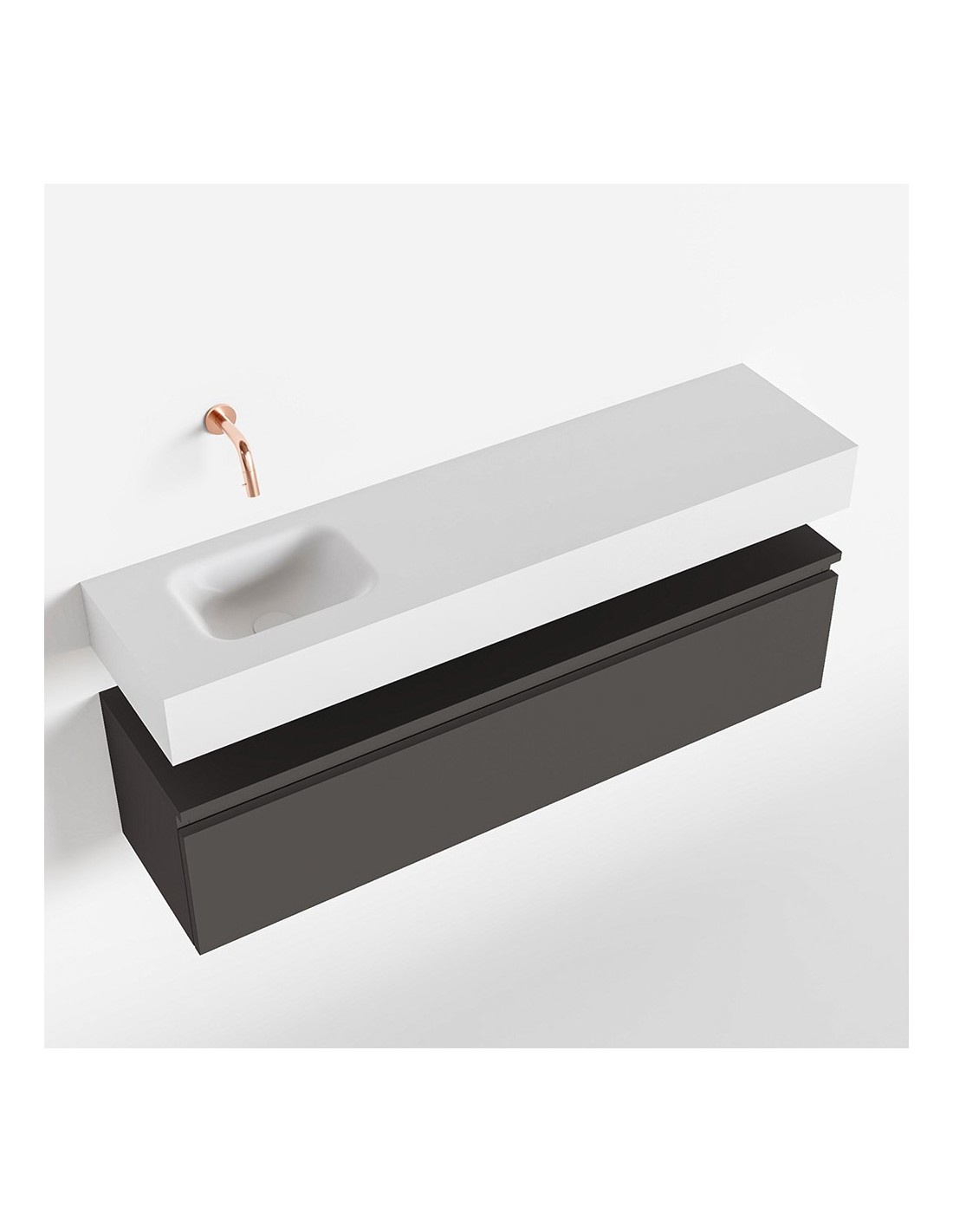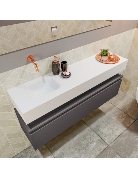 ANDOR Komplet badmiljø med venstrevendt håndvask til vægmonteret armatur. Badmiljøet kommer med 1 skuffe med fuldt udtræk, og er fremstillet i MDF. Håndvasken er fremstillet i talkumsfarvet (mat hvid) solid surface. Badmiljøet måler 120 cm i bredden. Det viste armatur medfølger ikke i sættet.