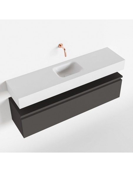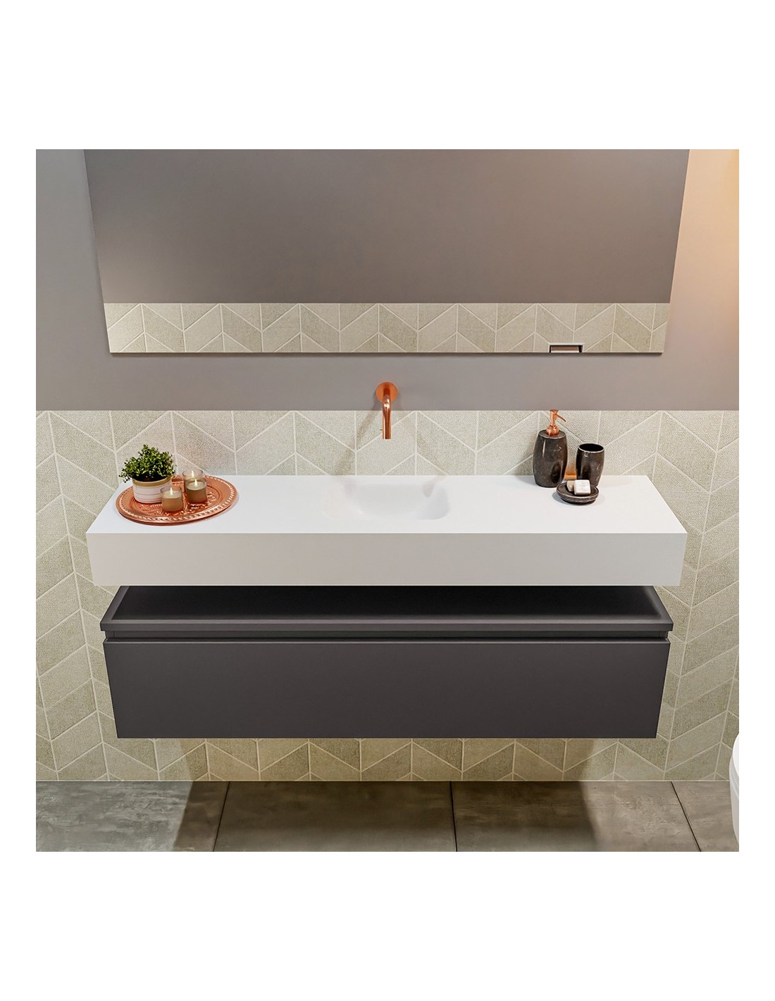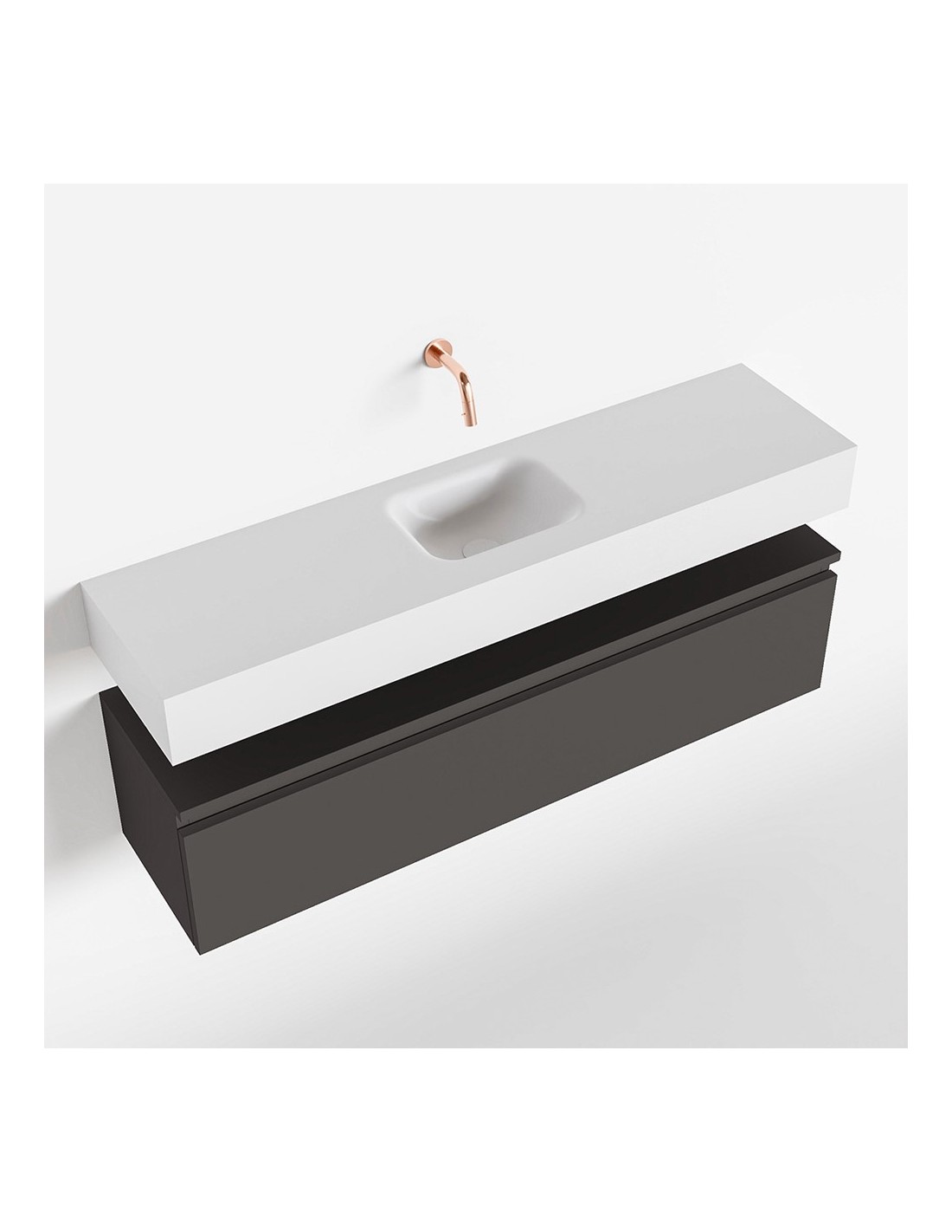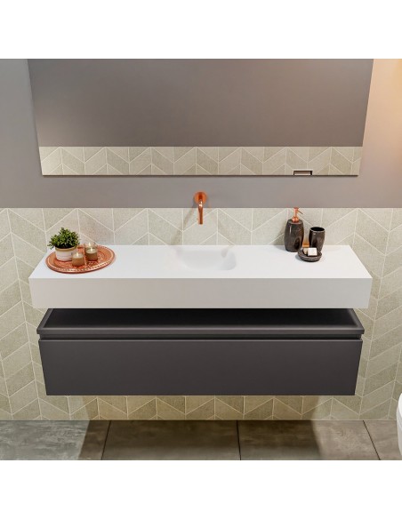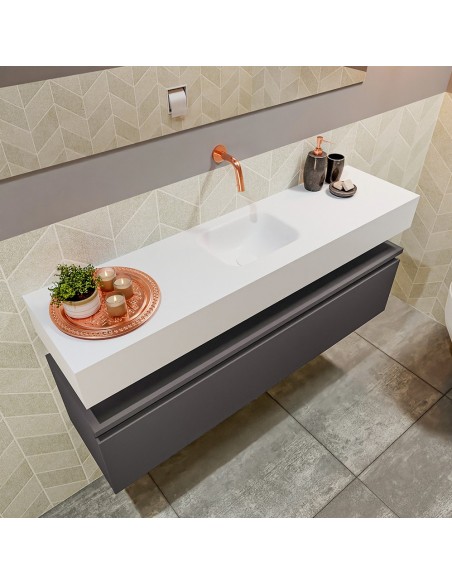 ANDOR Komplet badmiljø med midt centreret håndvask til vægmonteret armatur. Badmiljøet kommer med 1 skuffe med fuldt udtræk, og er fremstillet i MDF. Håndvasken er fremstillet i talkumsfarvet (mat hvid) solid surface. Badmiljøet måler 120 cm i bredden. Det viste armatur medfølger ikke i sættet.
