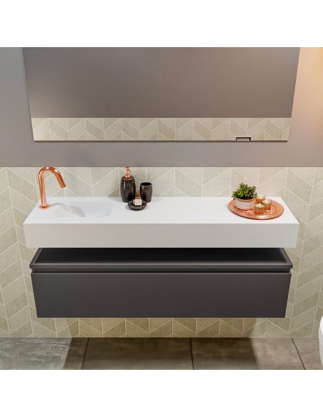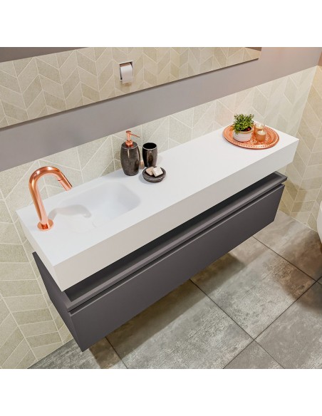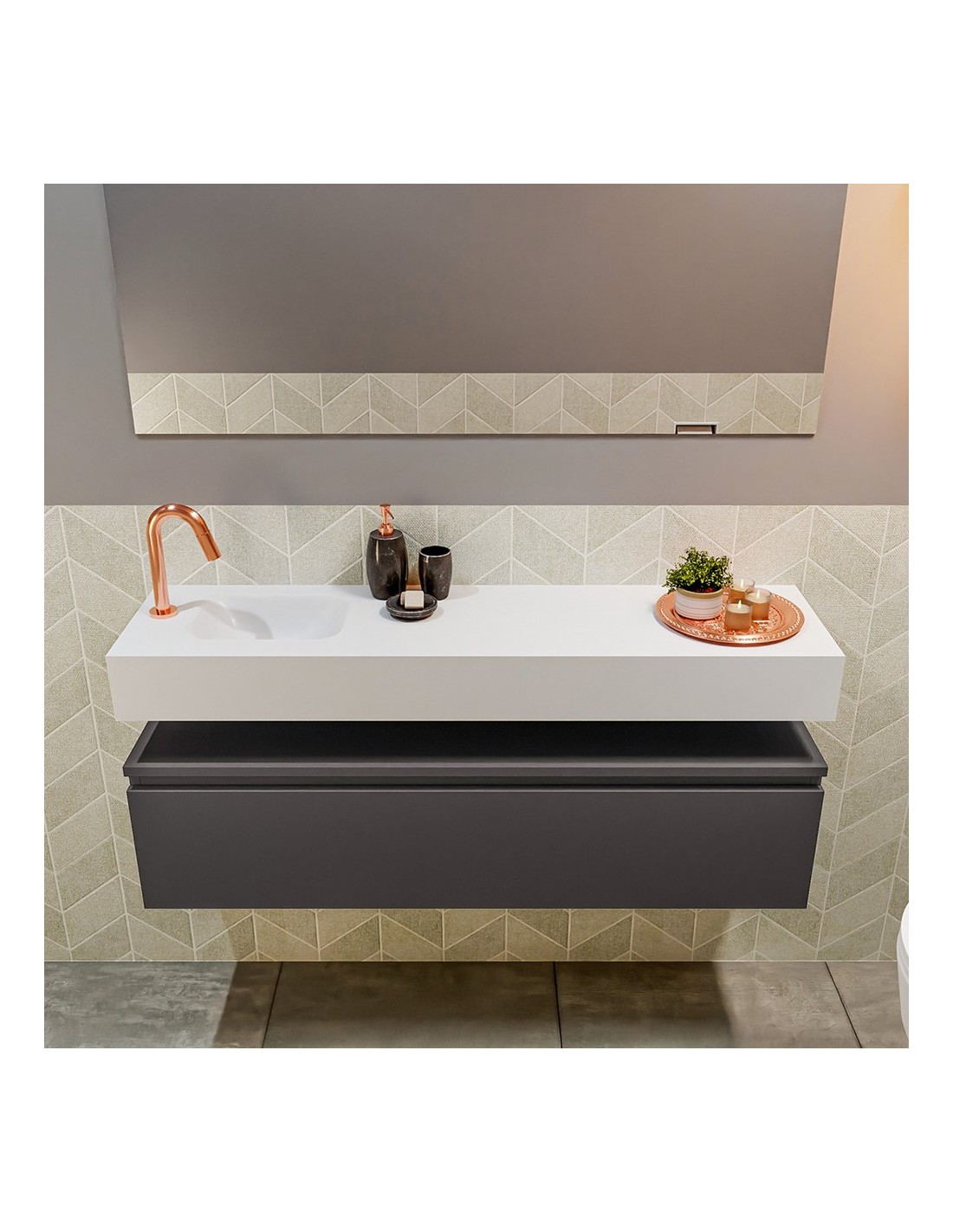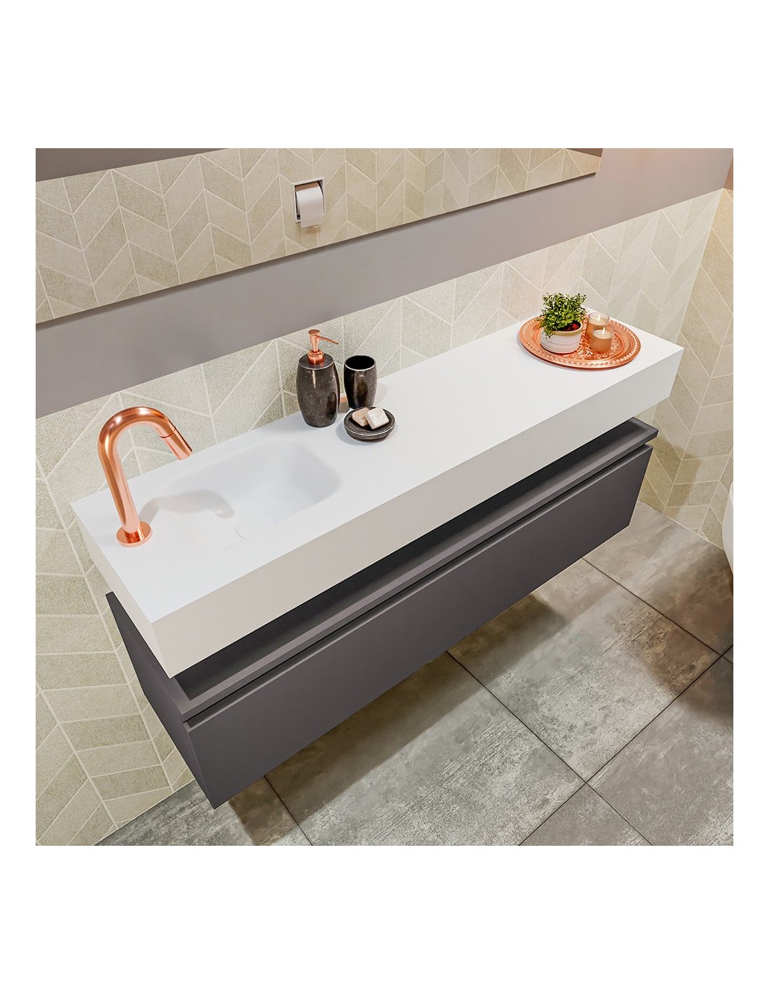 ANDOR Komplet badmiljø med venstrevendt håndvask til bordmonteret armatur. Badmiljøet kommer med 1 skuffe med fuldt udtræk, og er fremstillet i MDF. Håndvasken er fremstillet i talkumsfarvet (mat hvid) solid surface. Badmiljøet måler 120 cm i bredden. Det viste armatur medfølger ikke i sættet.
