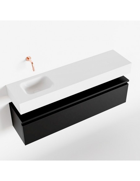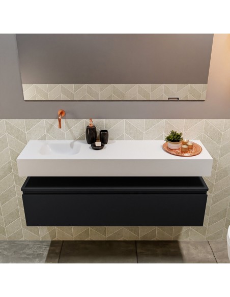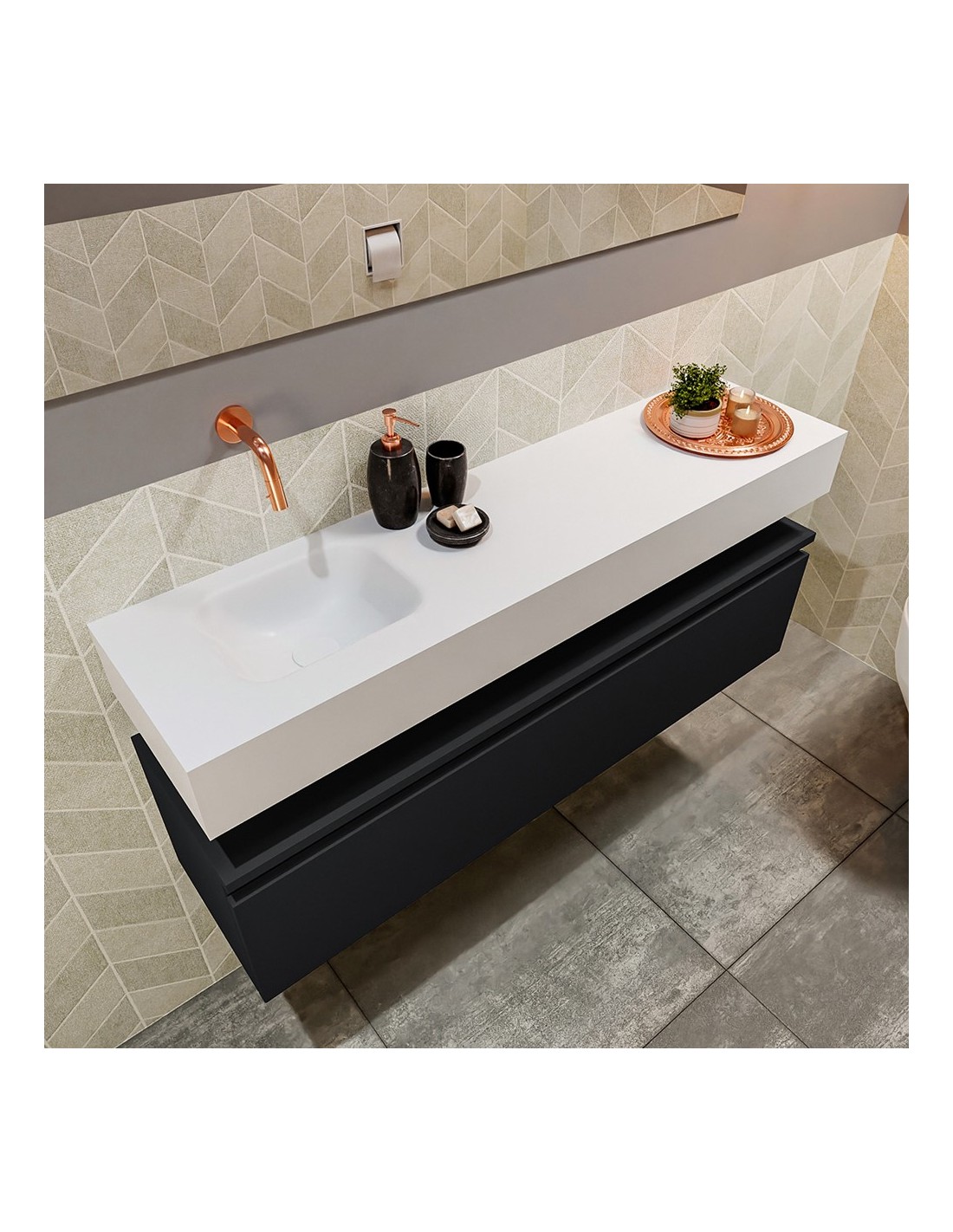 ANDOR Komplet badmiljø med venstrevendt håndvask til vægmonteret armatur. Badmiljøet kommer med 1 skuffe med fuldt udtræk, og er fremstillet i MDF. Håndvasken er fremstillet i talkumsfarvet (mat hvid) solid surface. Badmiljøet måler 120 cm i bredden. Det viste armatur medfølger ikke i sættet.