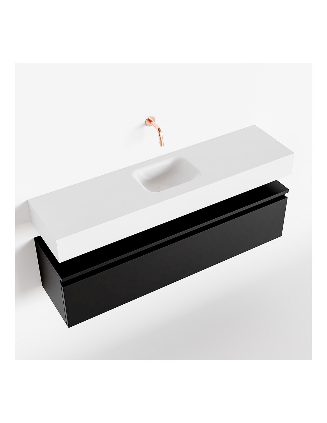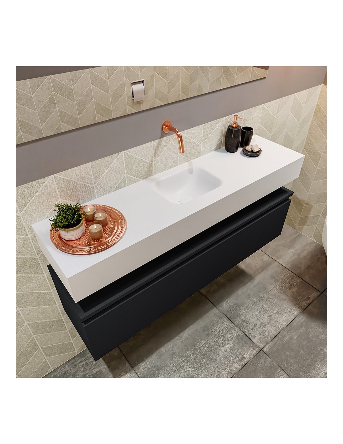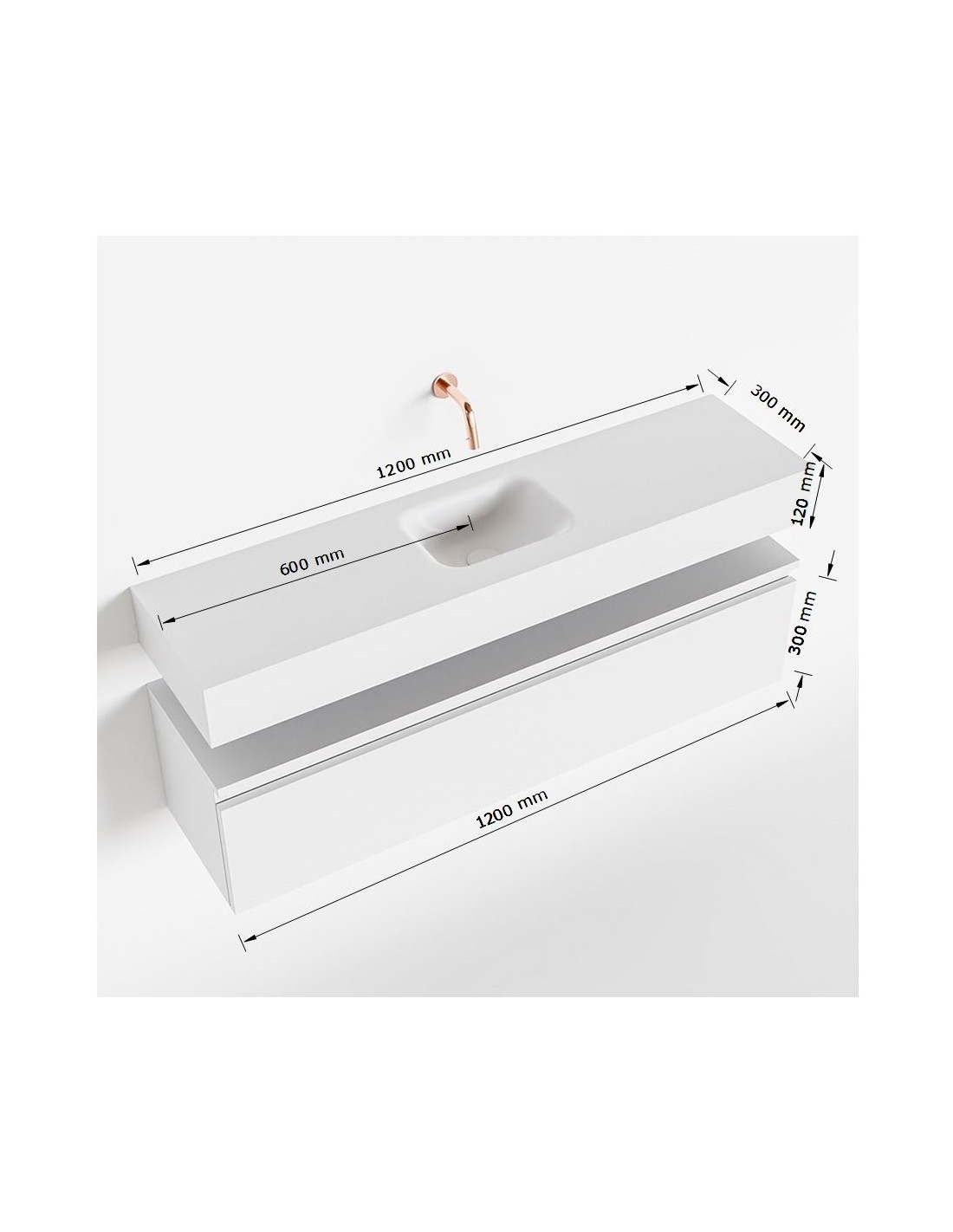ANDOR Komplet badmiljø med midt centreret håndvask til vægmonteret armatur. Badmiljøet kommer med 1 skuffe med fuldt udtræk, og er fremstillet i MDF. Håndvasken er fremstillet i talkumsfarvet (mat hvid) solid surface. Badmiljøet måler 120 cm i bredden. Det viste armatur medfølger ikke i sættet.