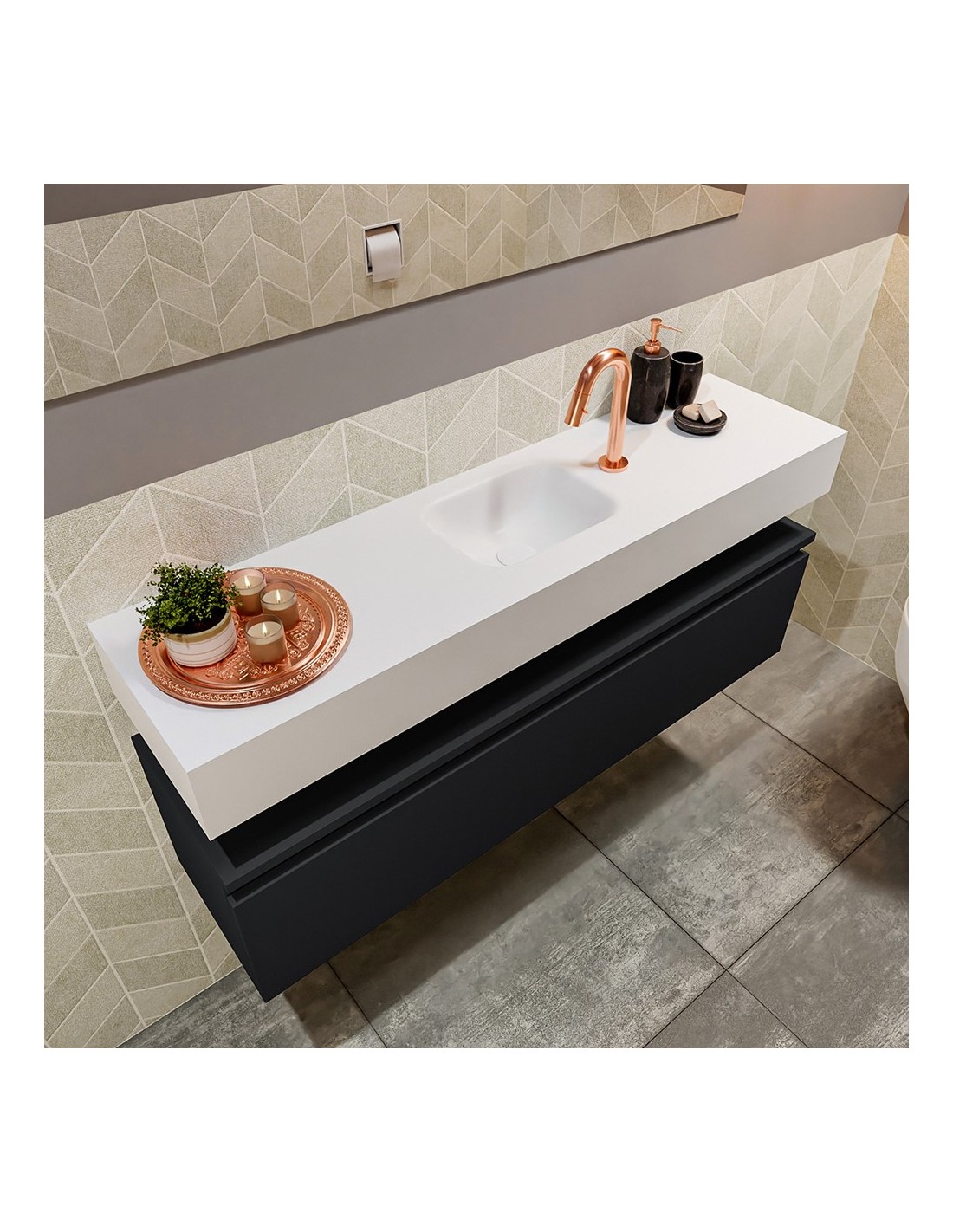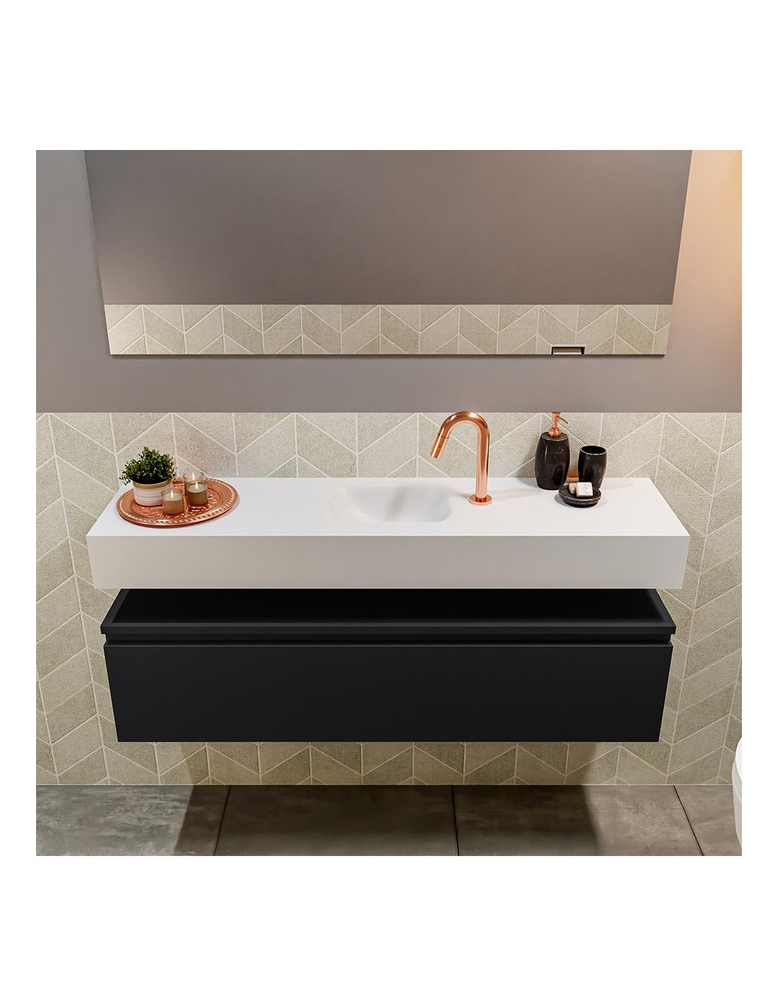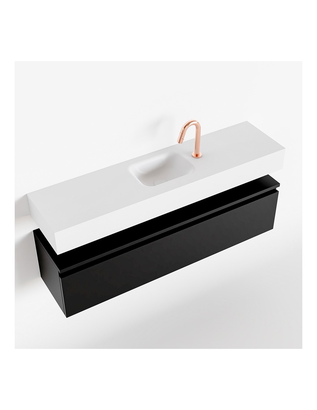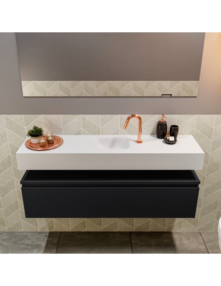 ANDOR Komplet badmiljø med midt centreret håndvask til bordmonteret armatur. Badmiljøet kommer med 1 skuffe med fuldt udtræk, og er fremstillet i MDF. Håndvasken er fremstillet i talkumsfarvet (mat hvid) solid surface. Badmiljøet måler 120 cm i bredden. Det viste armatur medfølger ikke i sættet.