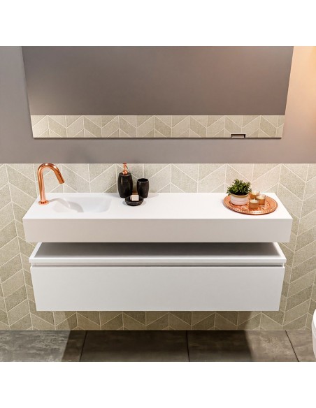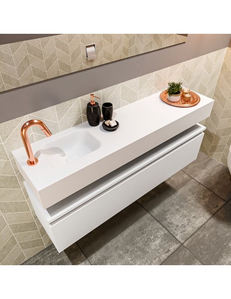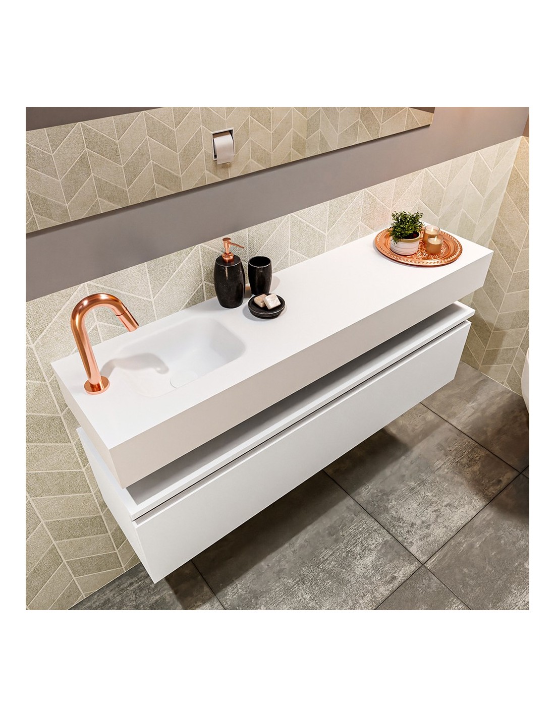 ANDOR Komplet badmiljø med venstrevendt håndvask til bordmonteret armatur. Badmiljøet kommer med 1 skuffe med fuldt udtræk, og er fremstillet i MDF. Håndvasken er fremstillet i talkumsfarvet (mat hvid) solid surface. Badmiljøet måler 120 cm i bredden. Det viste armatur medfølger ikke i sættet.