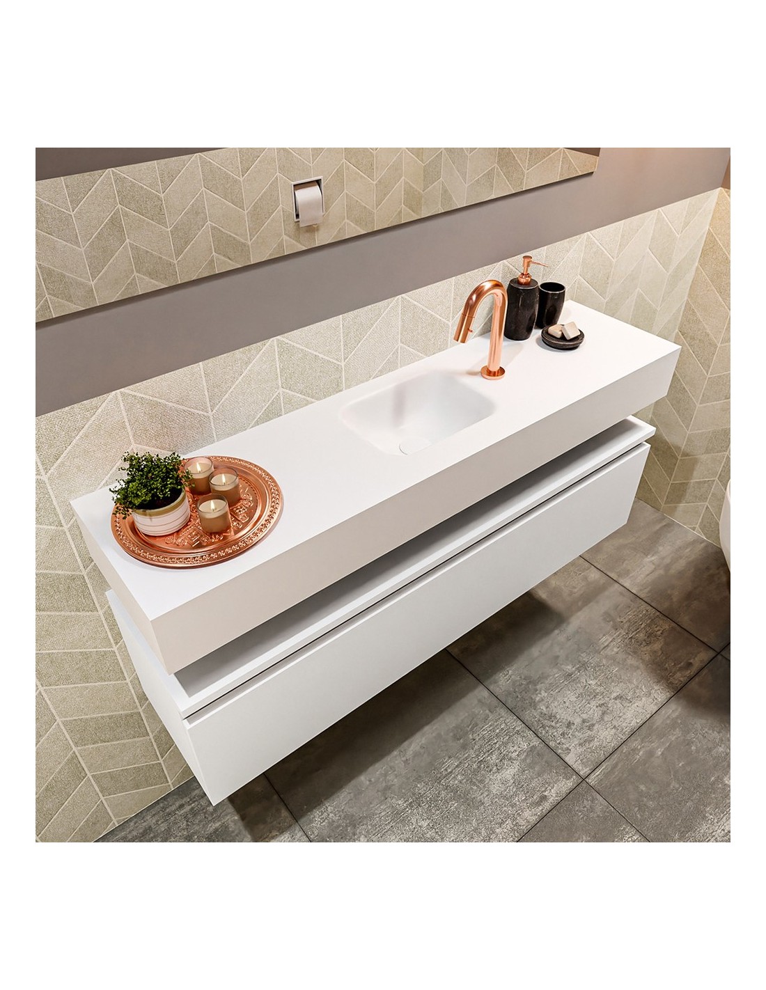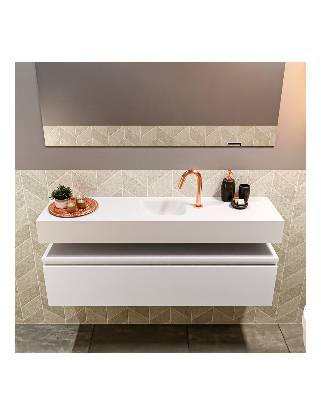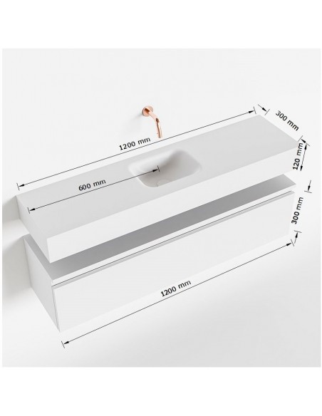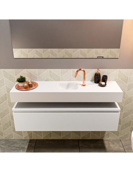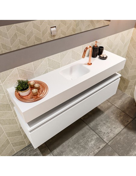 ANDOR Komplet badmiljø med midt centreret håndvask til bordmonteret armatur. Badmiljøet kommer med 1 skuffe med fuldt udtræk, og er fremstillet i MDF. Håndvasken er fremstillet i talkumsfarvet (mat hvid) solid surface. Badmiljøet måler 120 cm i bredden. Det viste armatur medfølger ikke i sættet.