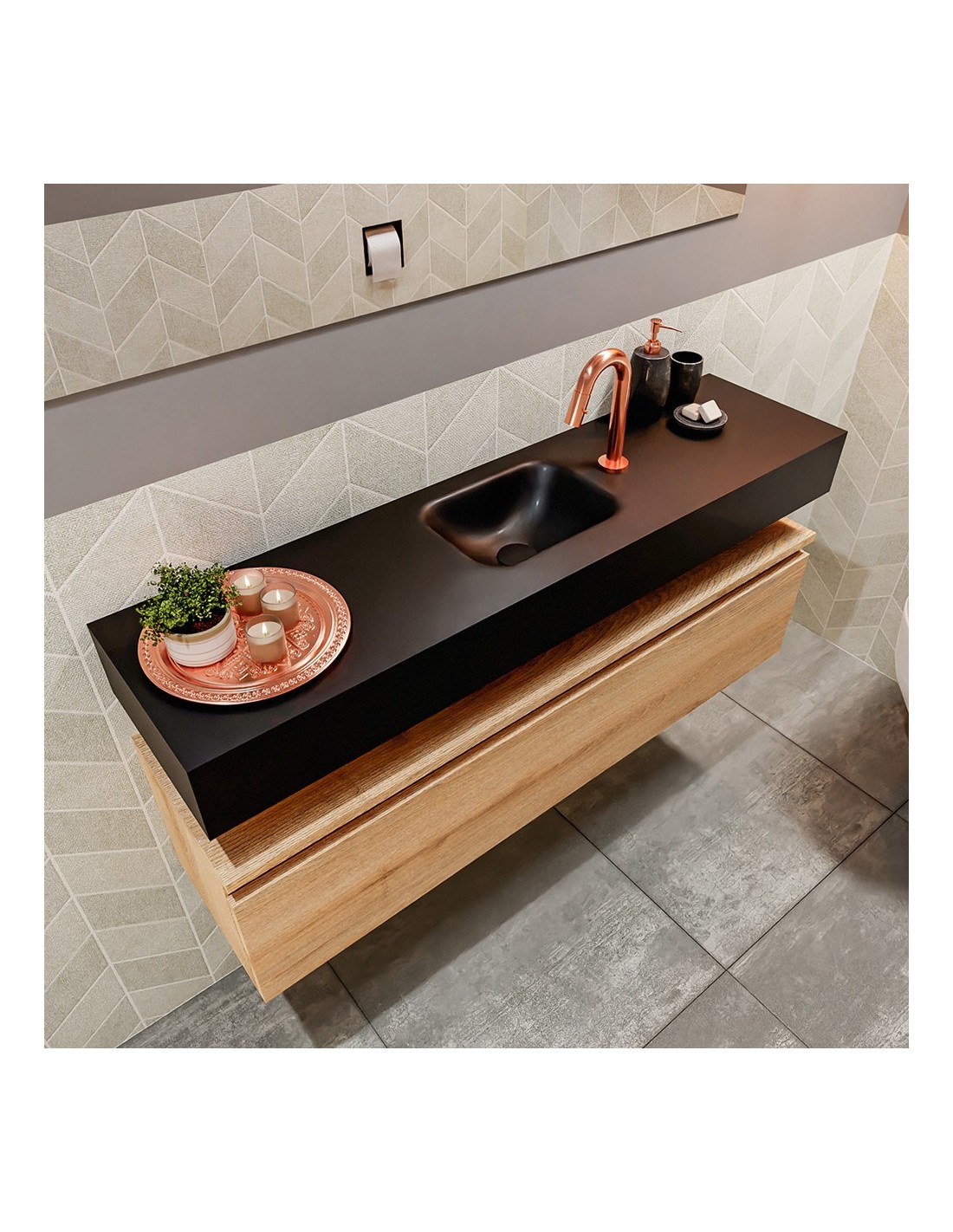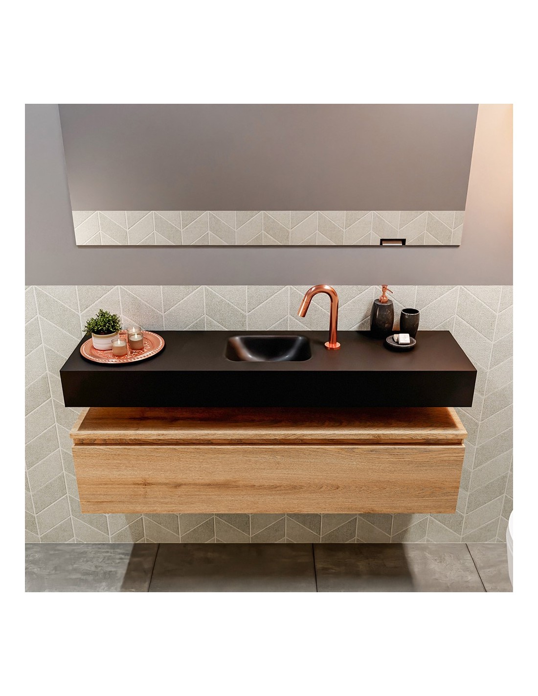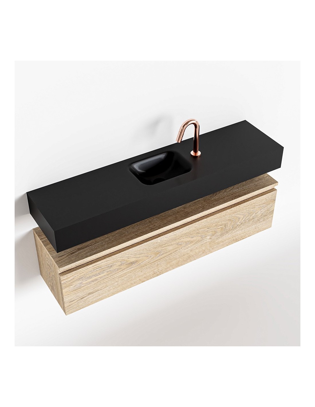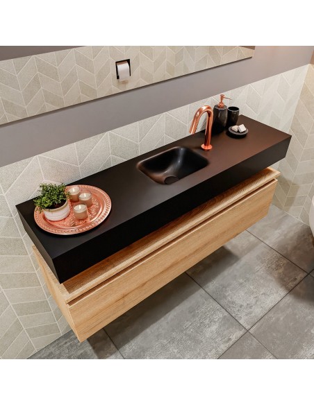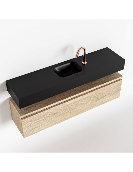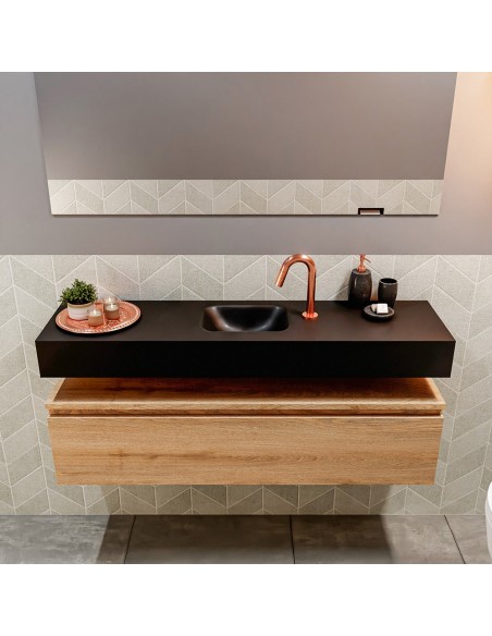 ANDOR Komplet badmiljø med midt centreret håndvask til bordmonteret armatur. Badmiljøet kommer med 1 skuffe med fuldt udtræk, og er fremstillet i MDF med design af vasket eg. Håndvasken er fremstillet i sort solid surface. Badmiljøet måler 120 cm i bredden. Det viste armatur medfølger ikke i sættet.