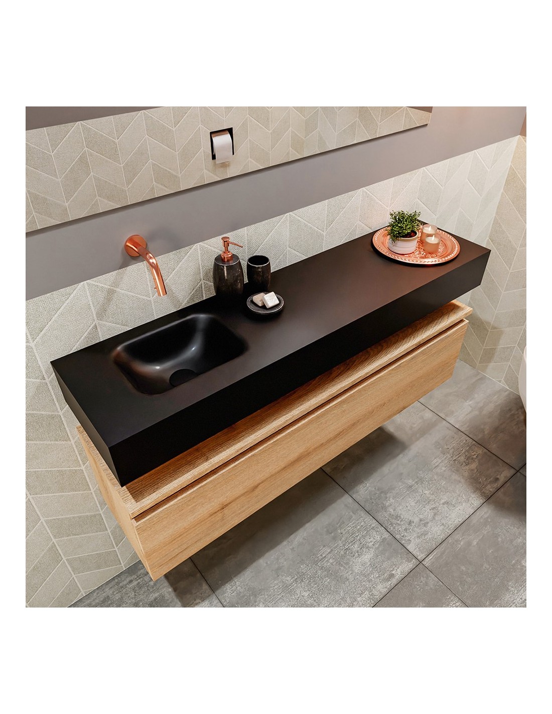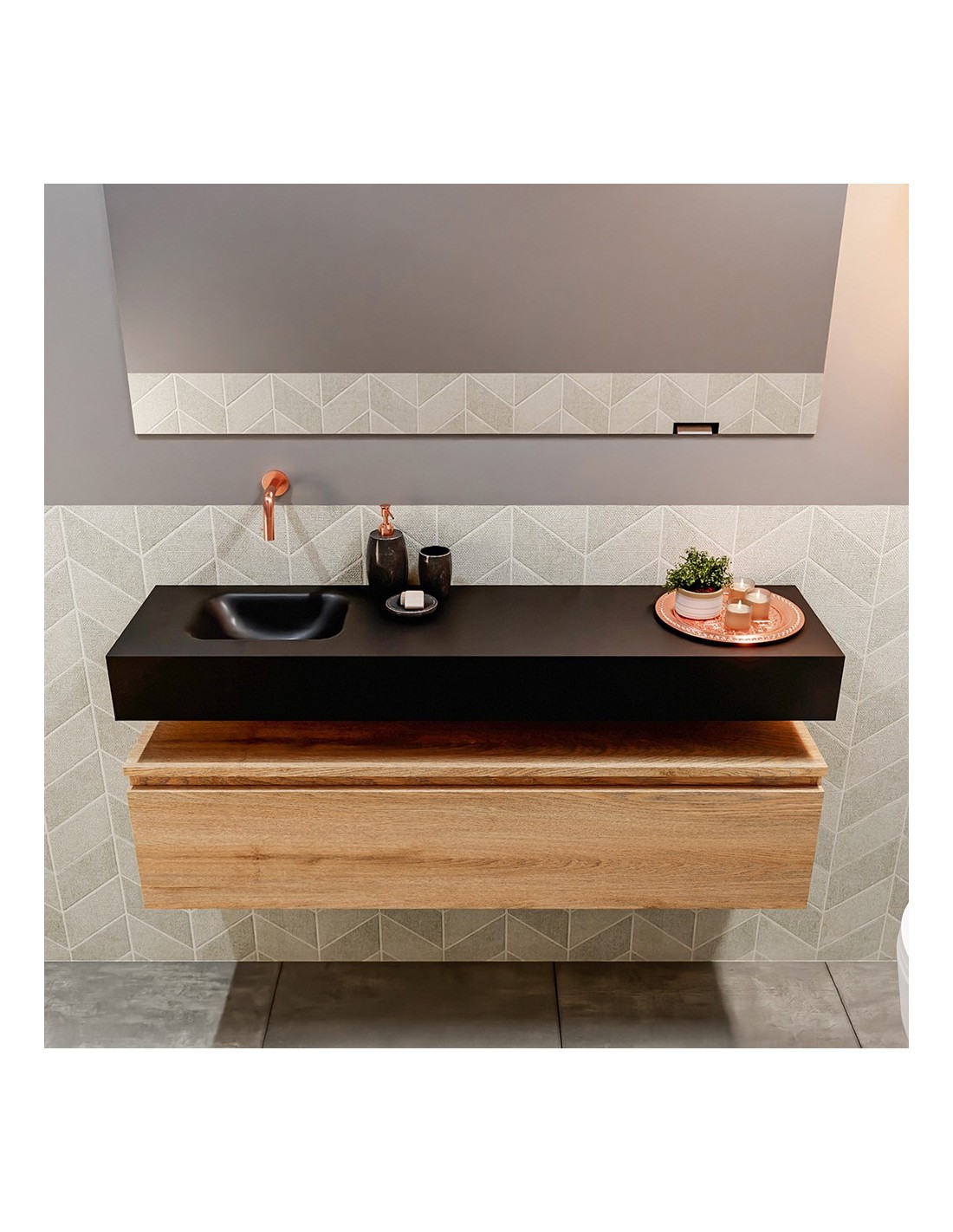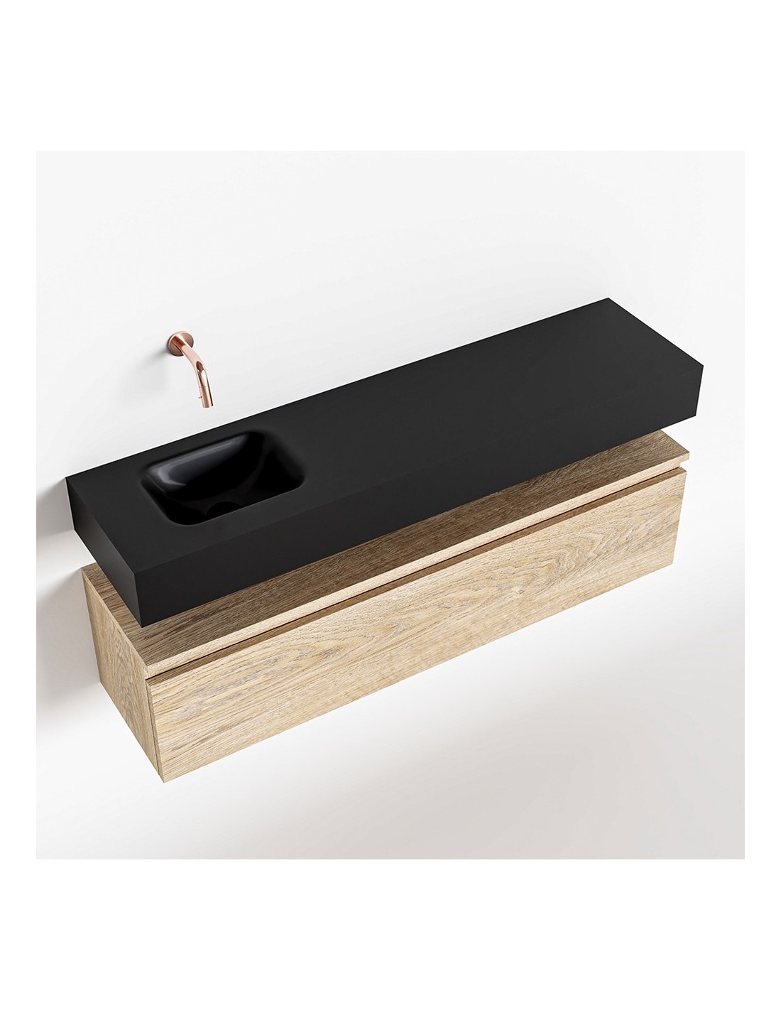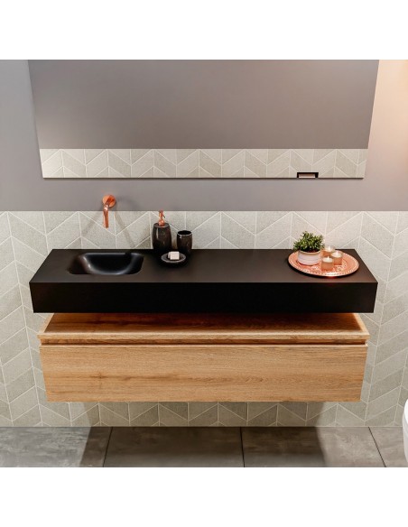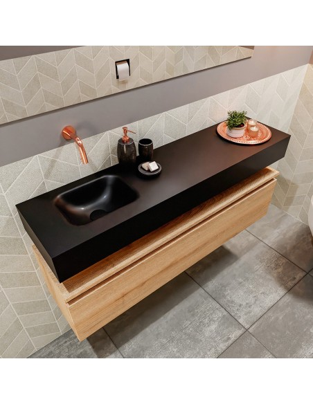 ANDOR Komplet badmiljø med venstrevendt håndvask til vægmonteret armatur. Badmiljøet kommer med 1 skuffe med fuldt udtræk, og er fremstillet i MDF med design af vasket eg. Håndvasken er fremstillet i sort solid surface. Badmiljøet måler 120 cm i bredden. Det viste armatur medfølger ikke i sættet.