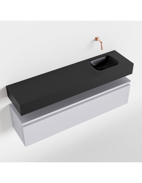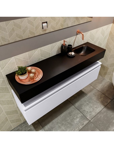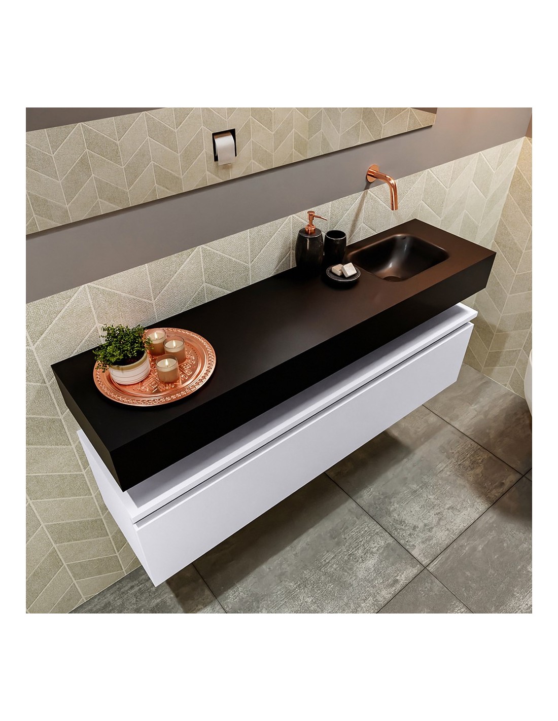 ANDOR Komplet badmiljø med højrevendt håndvask til vægmonteret armatur. Badmiljøet kommer med 1 skuffe med fuldt udtræk, og er fremstillet i MDF. Håndvasken er fremstillet i sort solid surface. Badmiljøet måler 120 cm i bredden. Det viste armatur medfølger ikke i sættet.