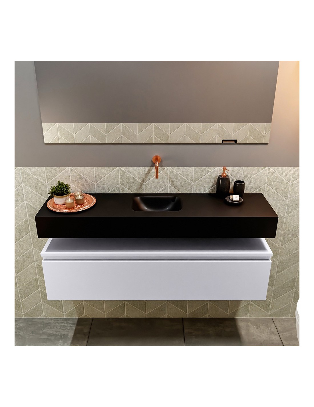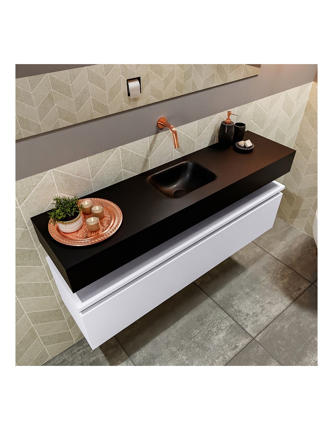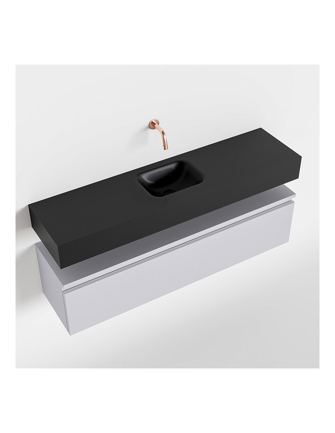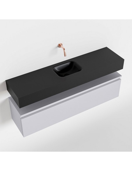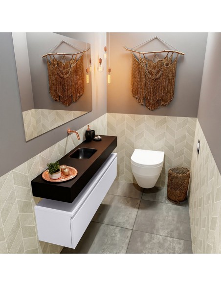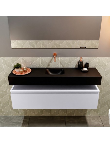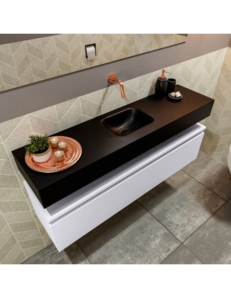 ANDOR Komplet badmiljø med midt centreret håndvask til vægmonteret armatur. Badmiljøet kommer med 1 skuffe med fuldt udtræk, og er fremstillet i MDF. Håndvasken er fremstillet i sort solid surface. Badmiljøet måler 120 cm i bredden. Det viste armatur medfølger ikke i sættet.