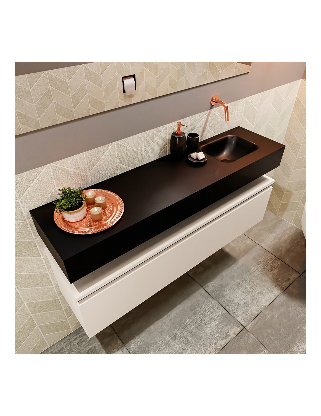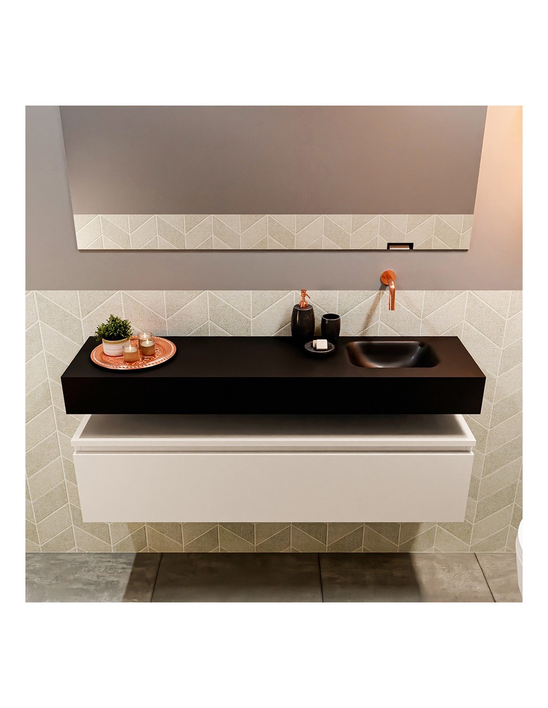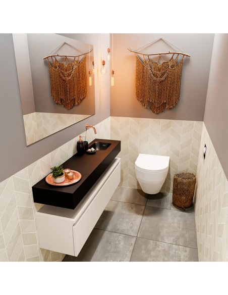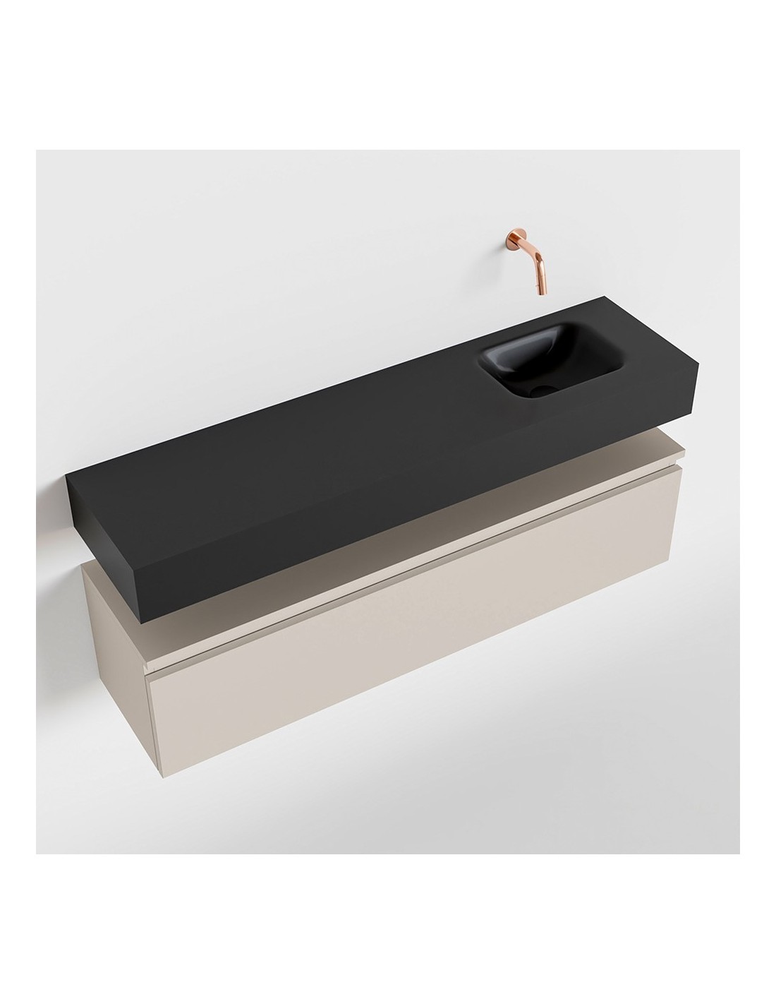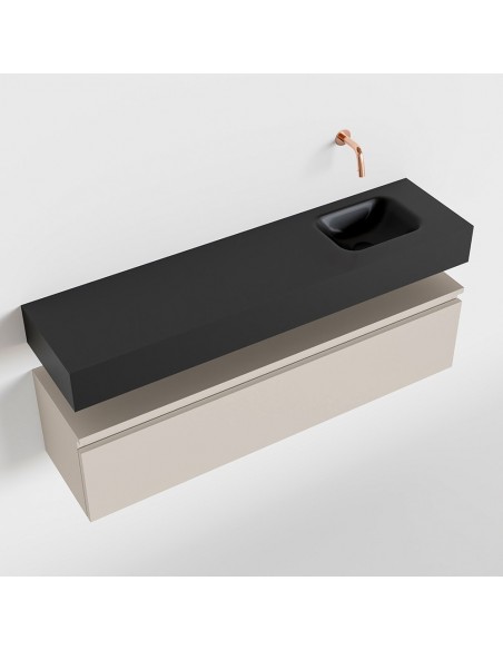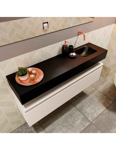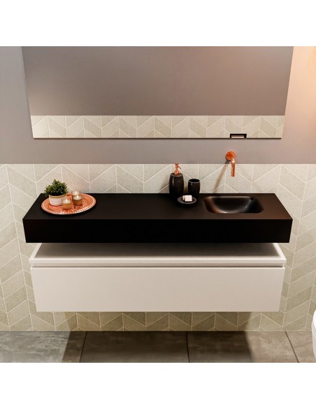 ANDOR Komplet badmiljø med højrevendt håndvask til vægmonteret armatur. Badmiljøet kommer med 1 skuffe med fuldt udtræk, og er fremstillet i MDF. Håndvasken er fremstillet i sort solid surface. Badmiljøet måler 120 cm i bredden. Det viste armatur medfølger ikke i sættet.