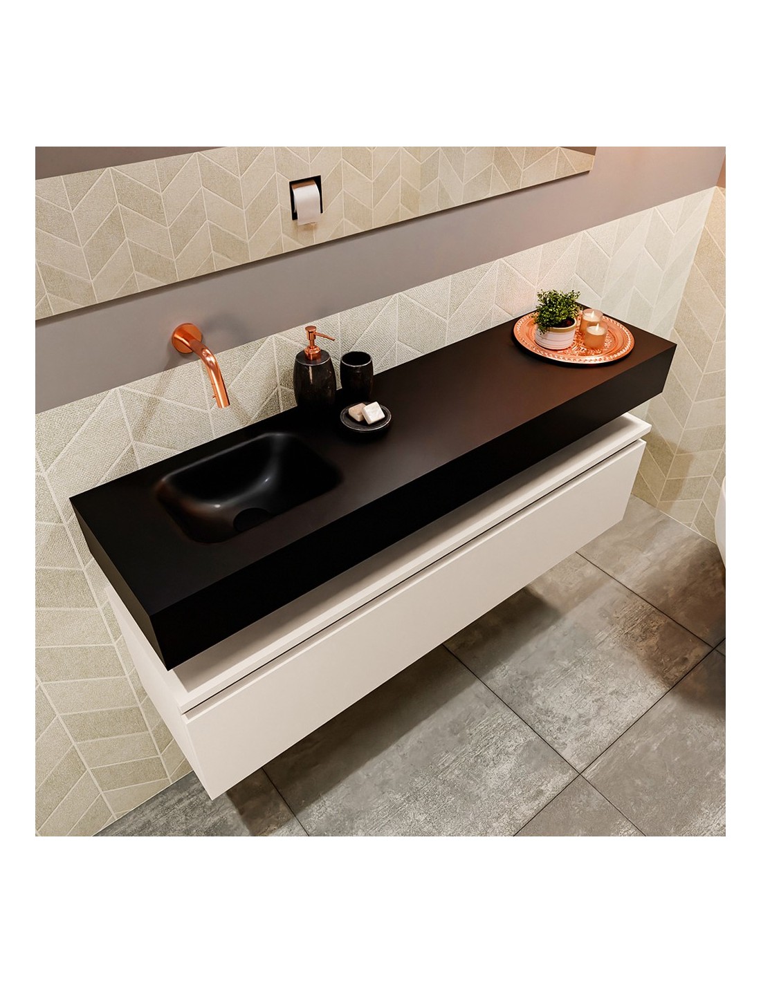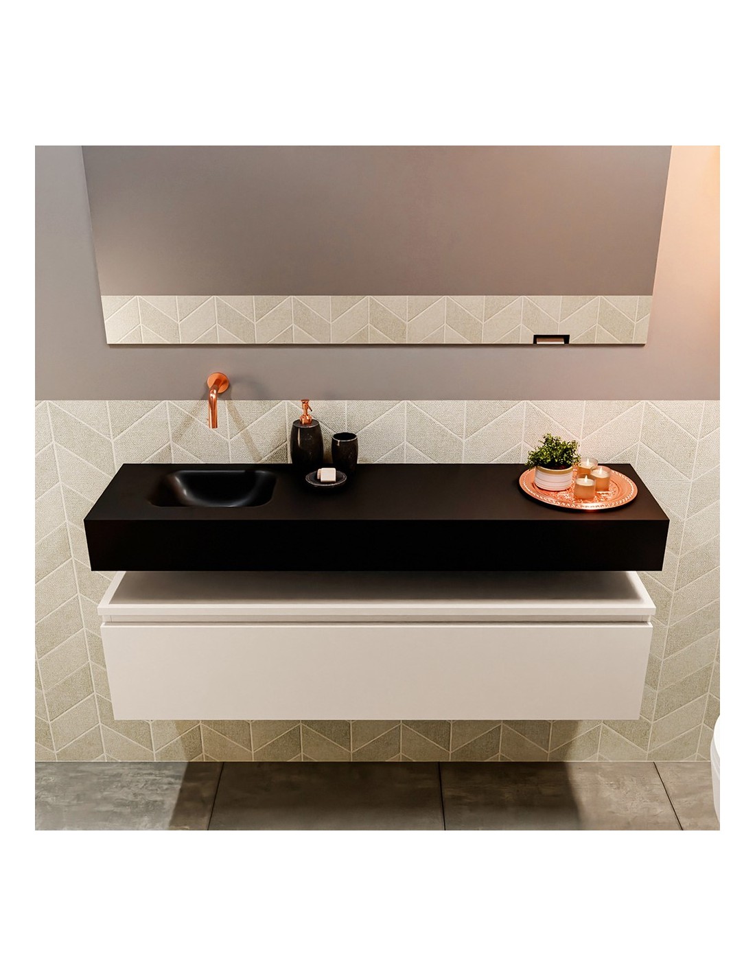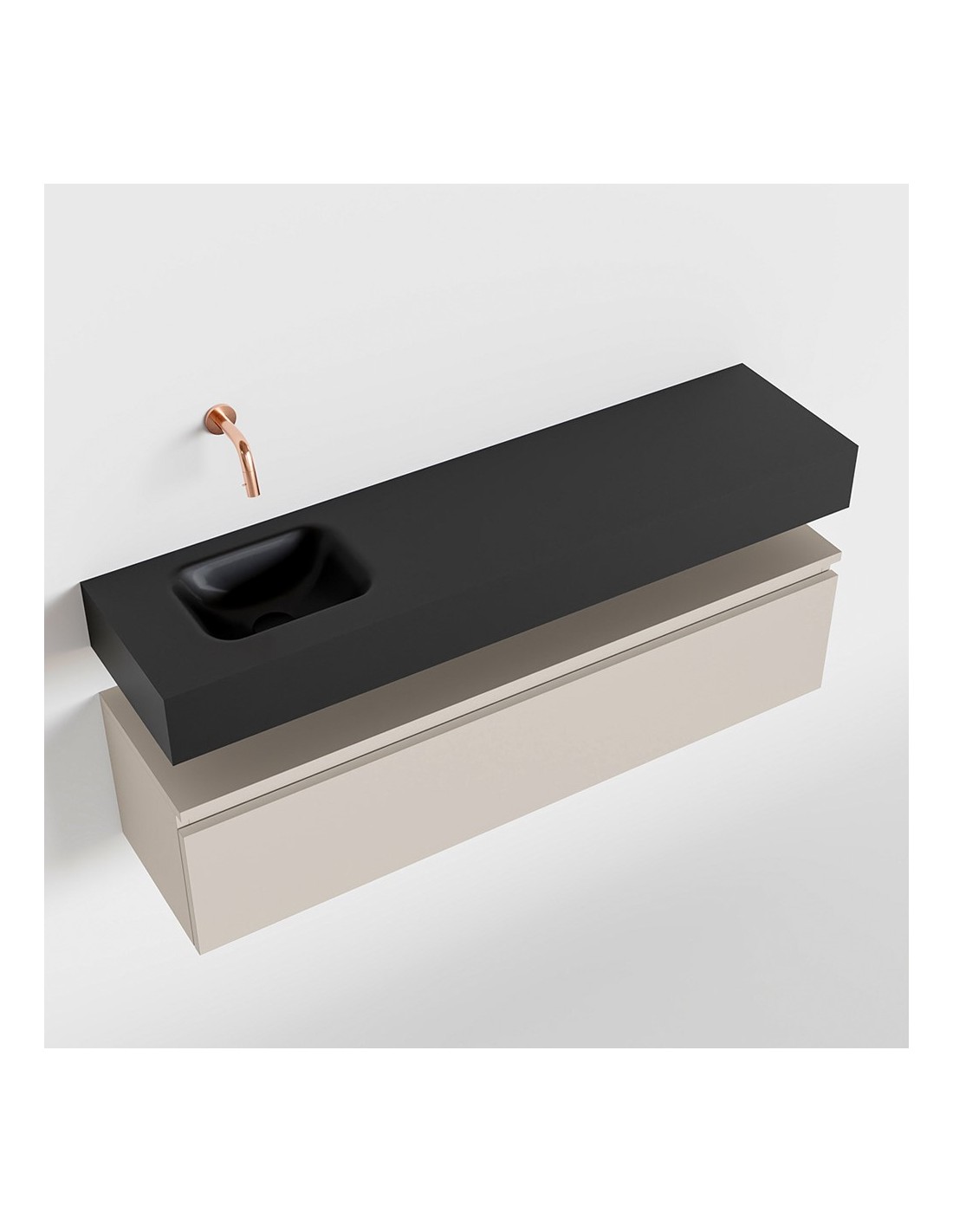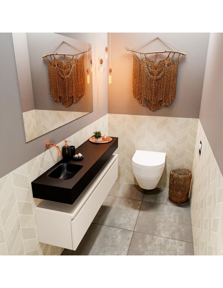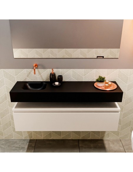 ANDOR Komplet badmiljø med venstrevendt håndvask til vægmonteret armatur. Badmiljøet kommer med 1 skuffe med fuldt udtræk, og er fremstillet i MDF. Håndvasken er fremstillet i sort solid surface. Badmiljøet måler 120 cm i bredden. Det viste armatur medfølger ikke i sættet.