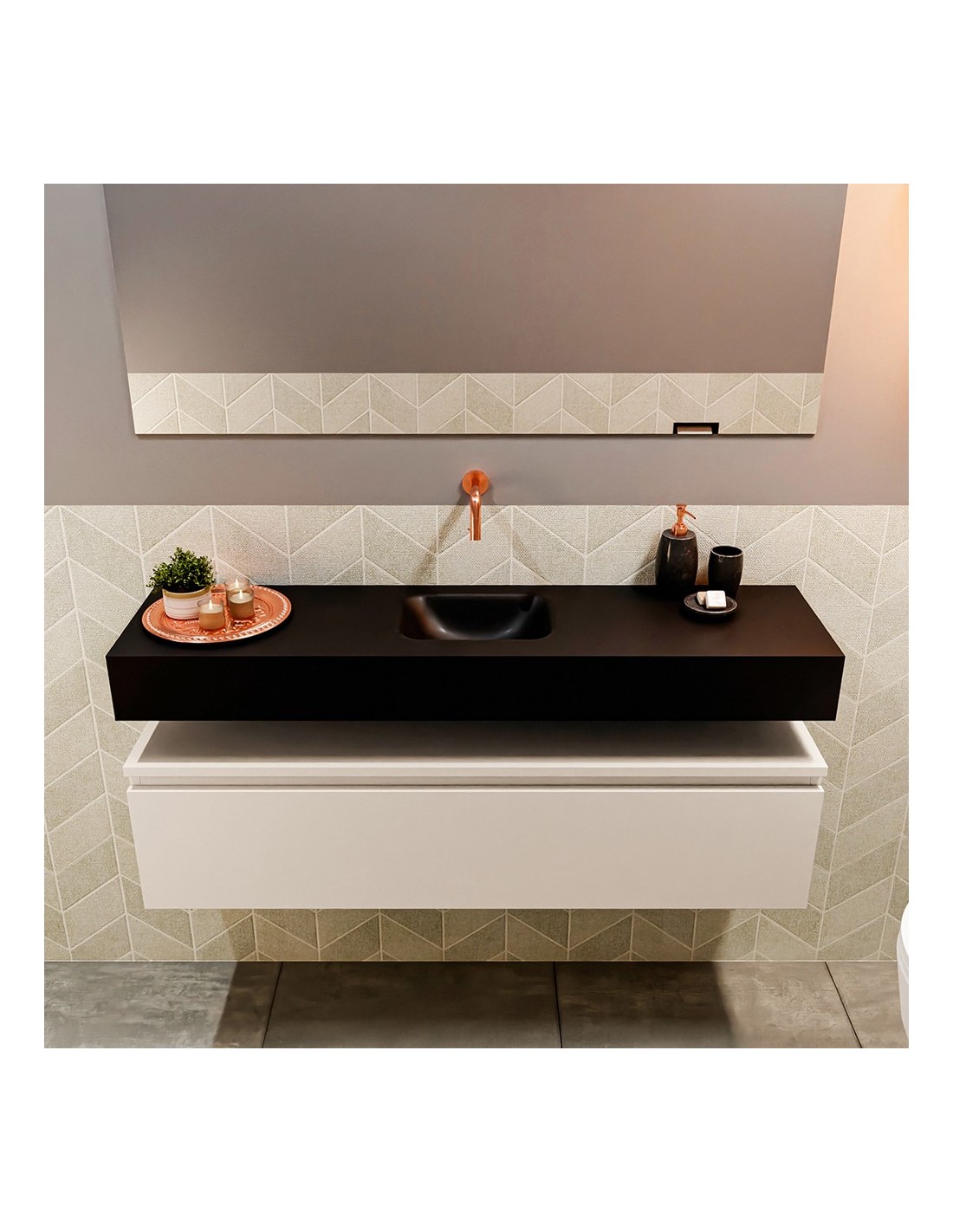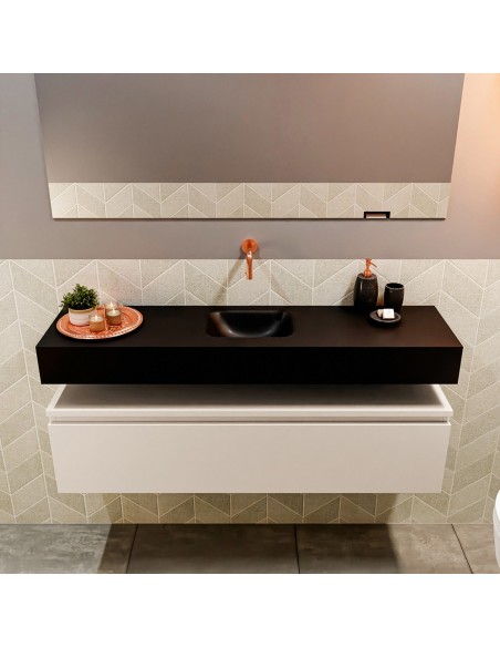 ANDOR Komplet badmiljø med midt centreret håndvask til vægmonteret armatur. Badmiljøet kommer med 1 skuffe med fuldt udtræk, og er fremstillet i MDF. Håndvasken er fremstillet i sort solid surface. Badmiljøet måler 120 cm i bredden. Det viste armatur medfølger ikke i sættet.