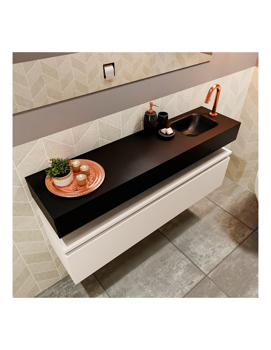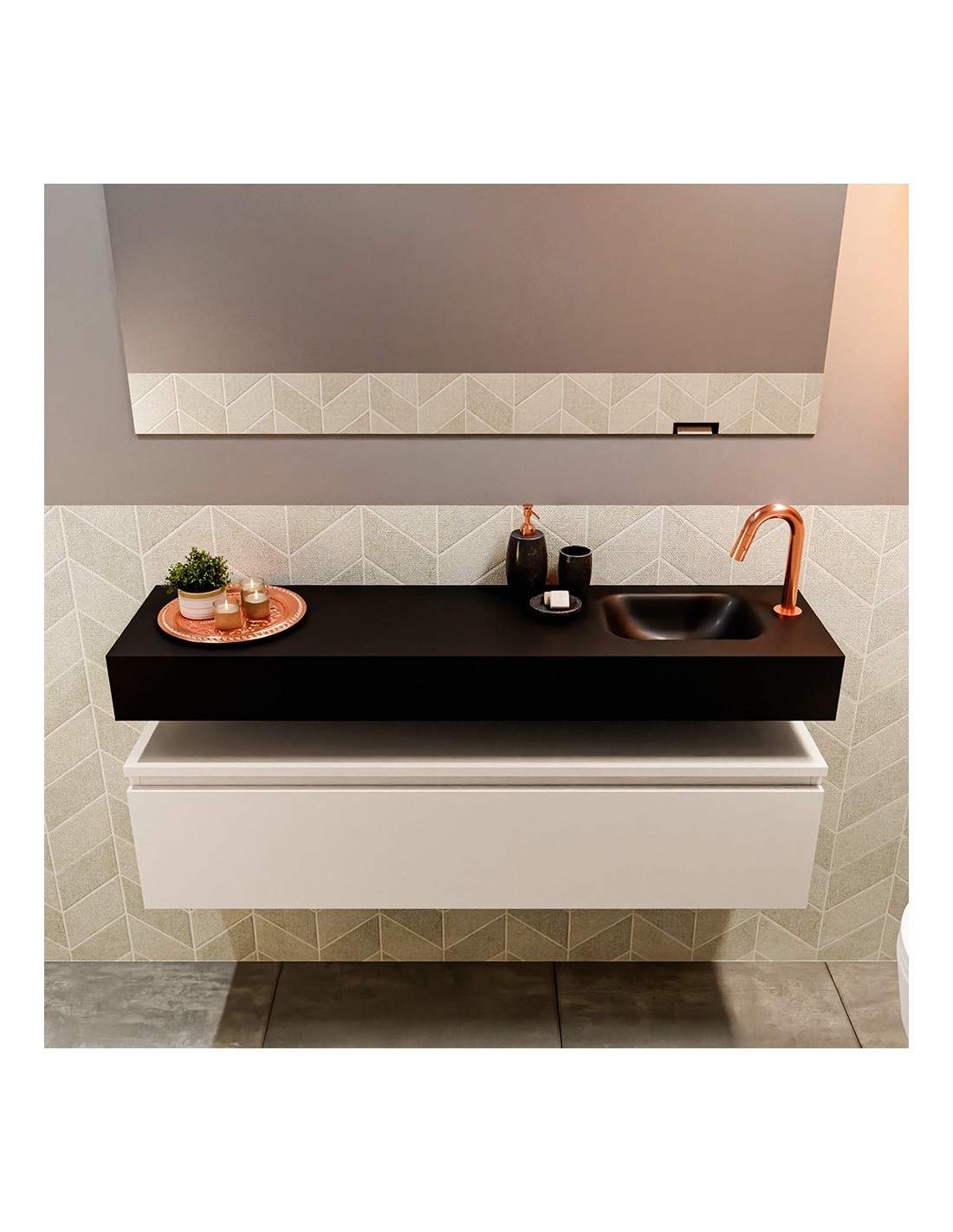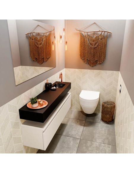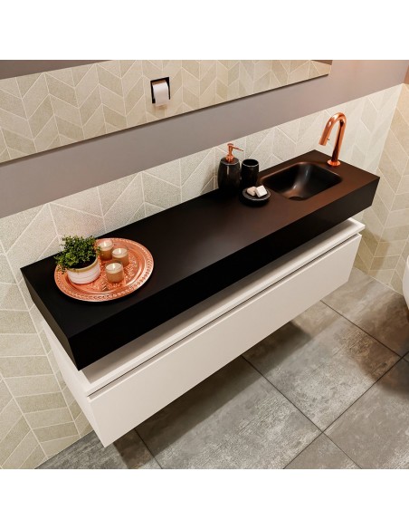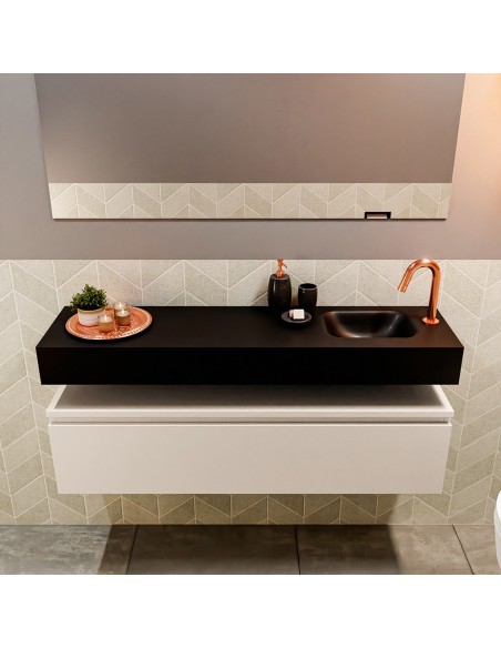 ANDOR Komplet badmiljø med højrevendt håndvask til bordmonteret armatur. Badmiljøet kommer med 1 skuffe med fuldt udtræk, og er fremstillet i MDF. Håndvasken er fremstillet i sort solid surface. Badmiljøet måler 120 cm i bredden. Det viste armatur medfølger ikke i sættet.