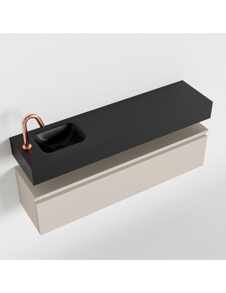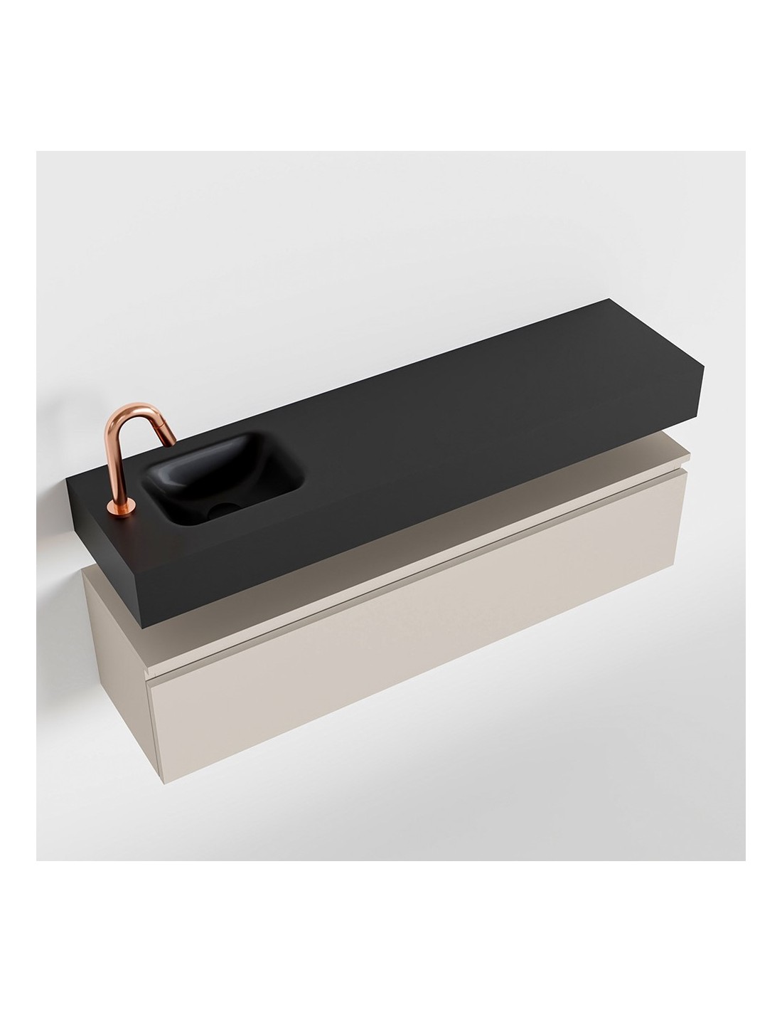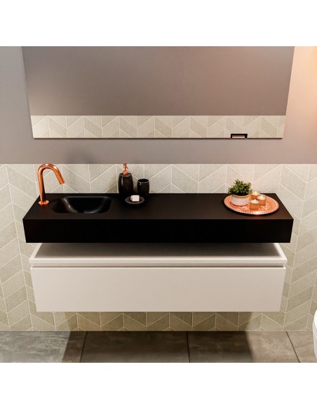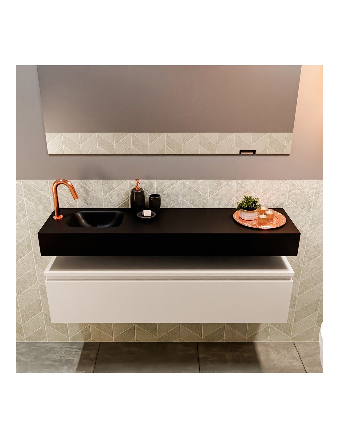 ANDOR Komplet badmiljø med venstrevendt håndvask til bordmonteret armatur. Badmiljøet kommer med 1 skuffe med fuldt udtræk, og er fremstillet i MDF. Håndvasken er fremstillet i sort solid surface. Badmiljøet måler 120 cm i bredden. Det viste armatur medfølger ikke i sættet.