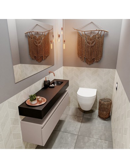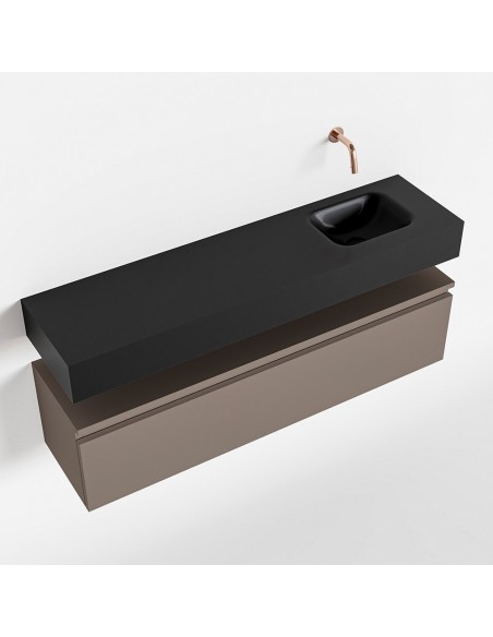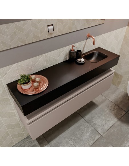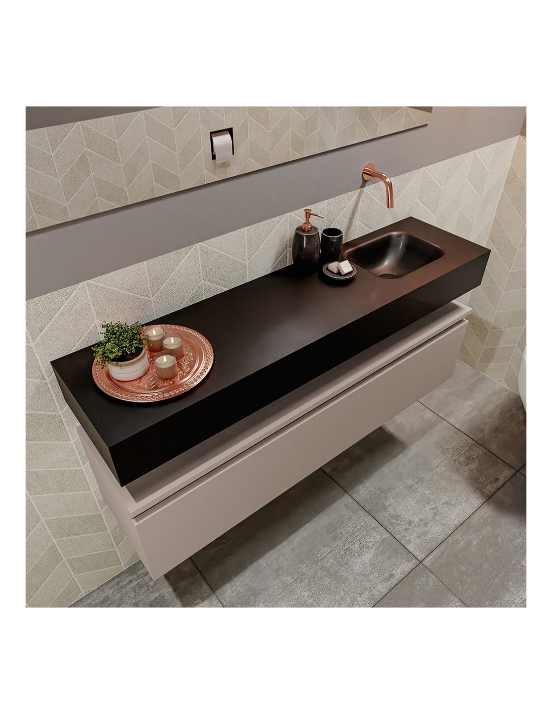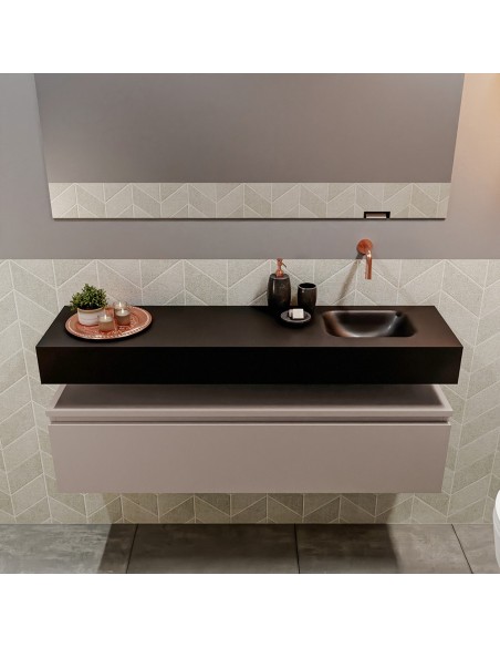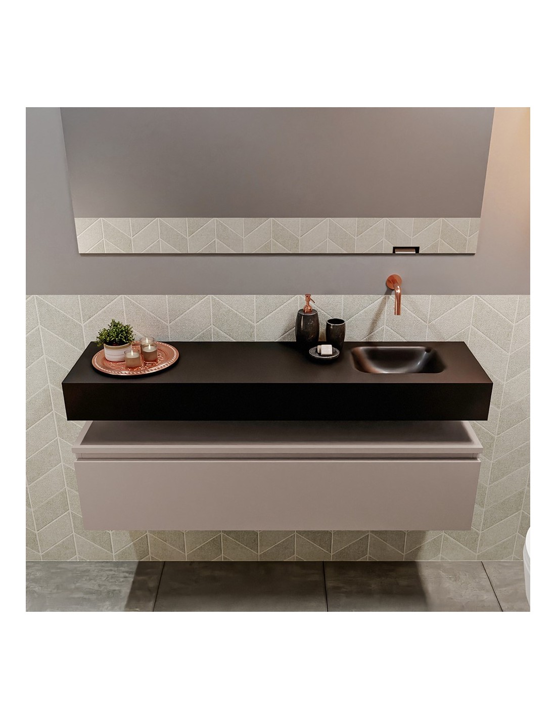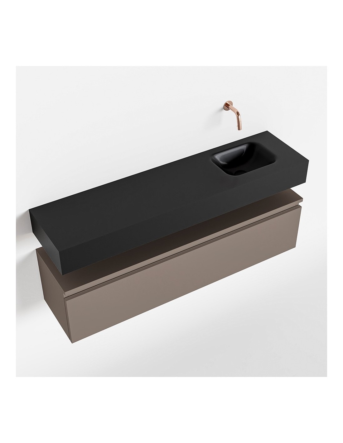 ANDOR Komplet badmiljø med højrevendt håndvask til vægmonteret armatur. Badmiljøet kommer med 1 skuffe med fuldt udtræk, og er fremstillet i MDF. Håndvasken er fremstillet i sort solid surface. Badmiljøet måler 120 cm i bredden. Det viste armatur medfølger ikke i sættet.