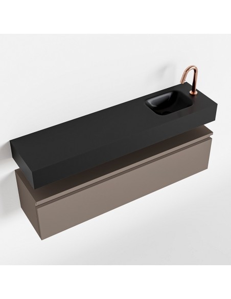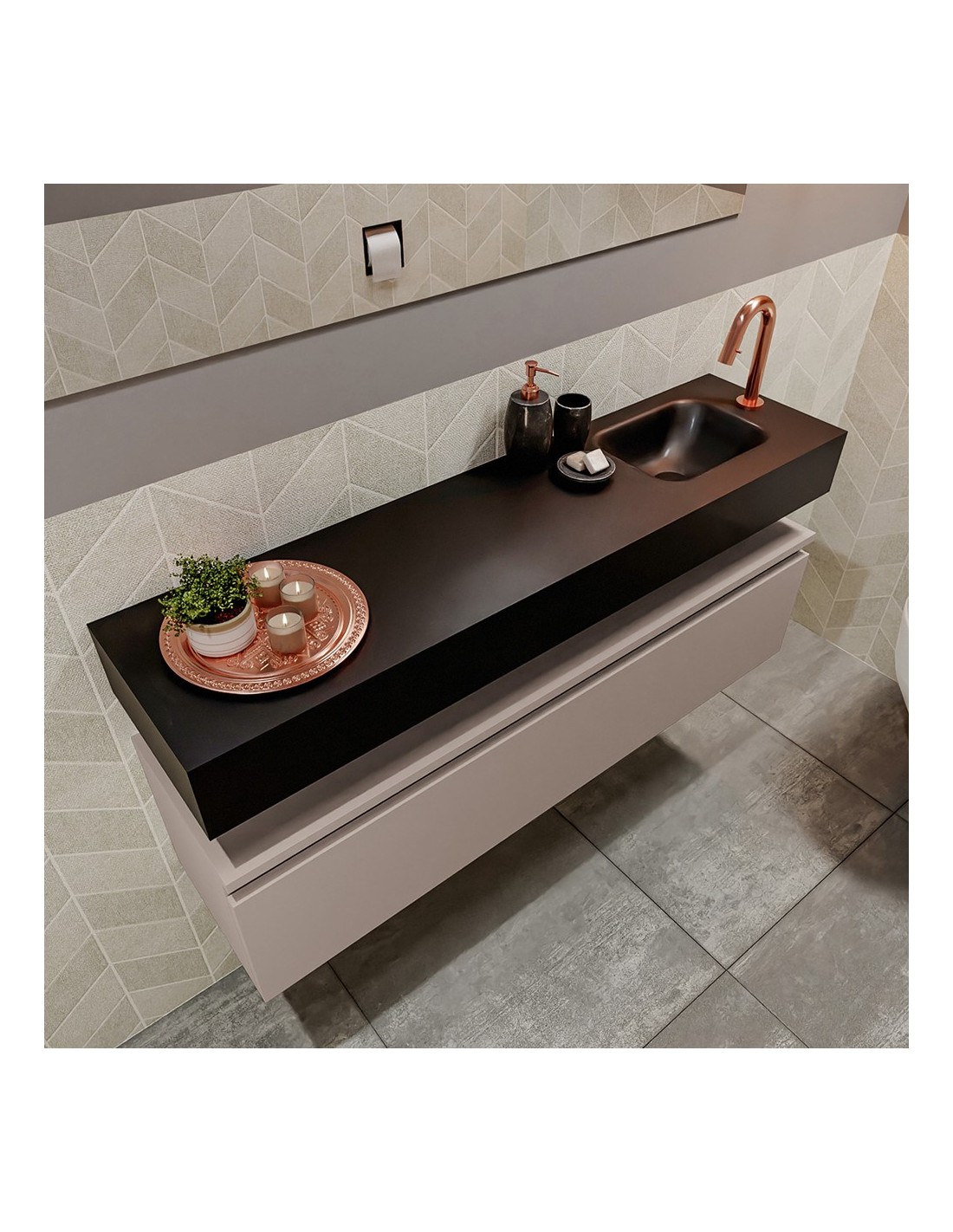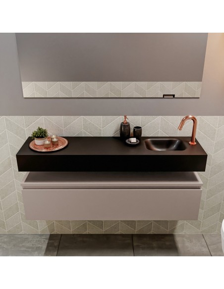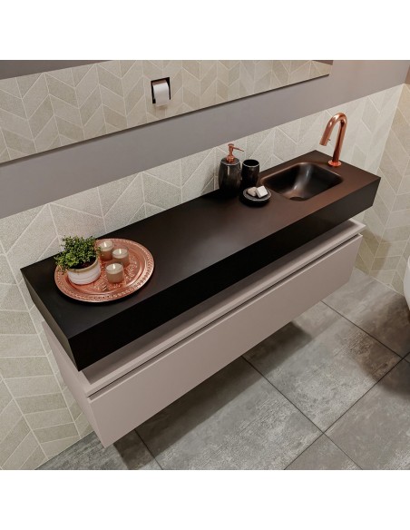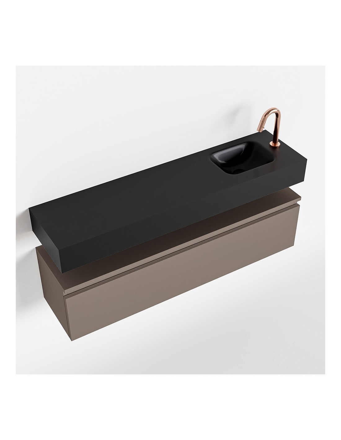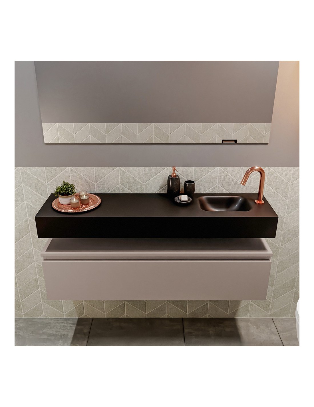 ANDOR Komplet badmiljø med højrevendt håndvask til bordmonteret armatur. Badmiljøet kommer med 1 skuffe med fuldt udtræk, og er fremstillet i MDF. Håndvasken er fremstillet i sort solid surface. Badmiljøet måler 120 cm i bredden. Det viste armatur medfølger ikke i sættet.